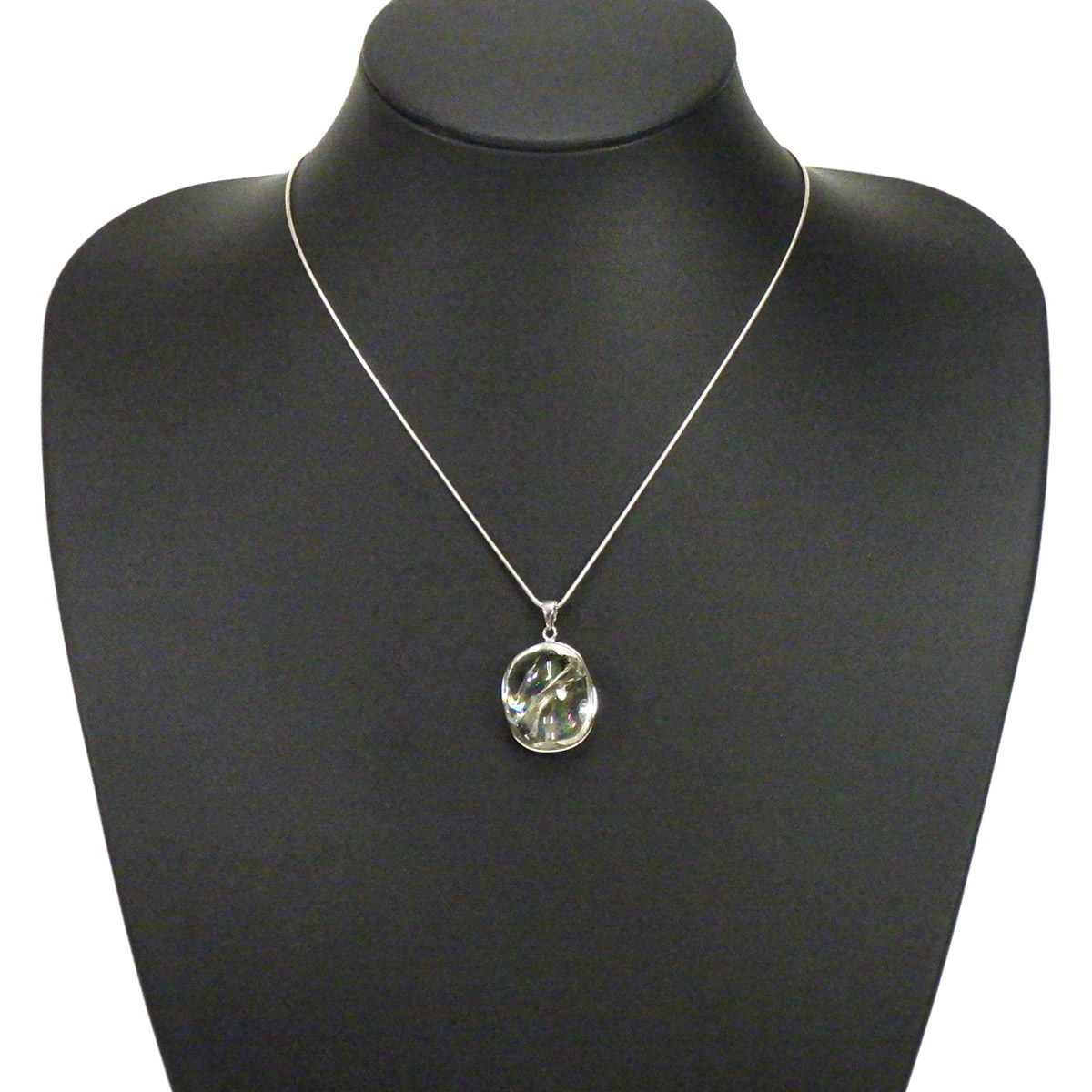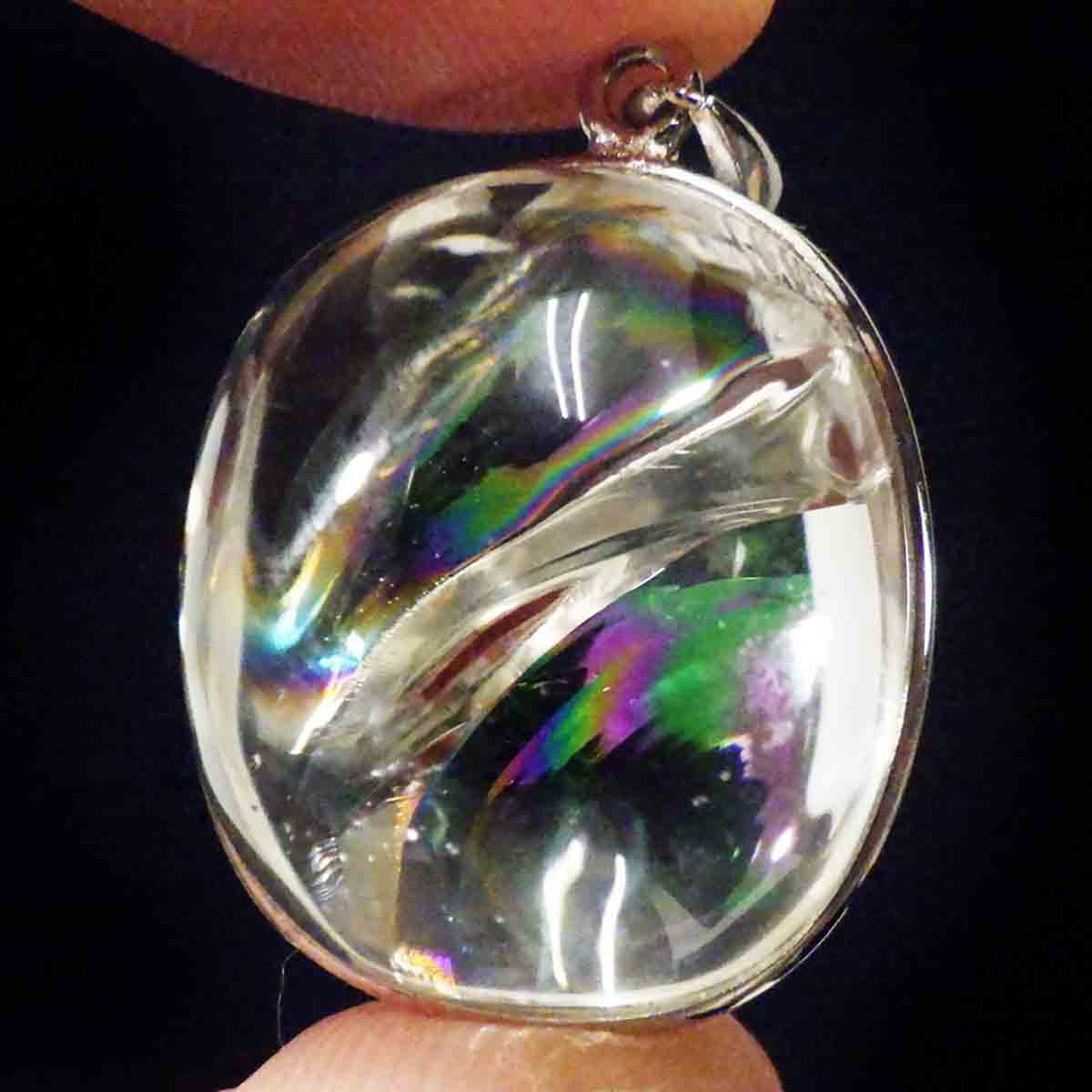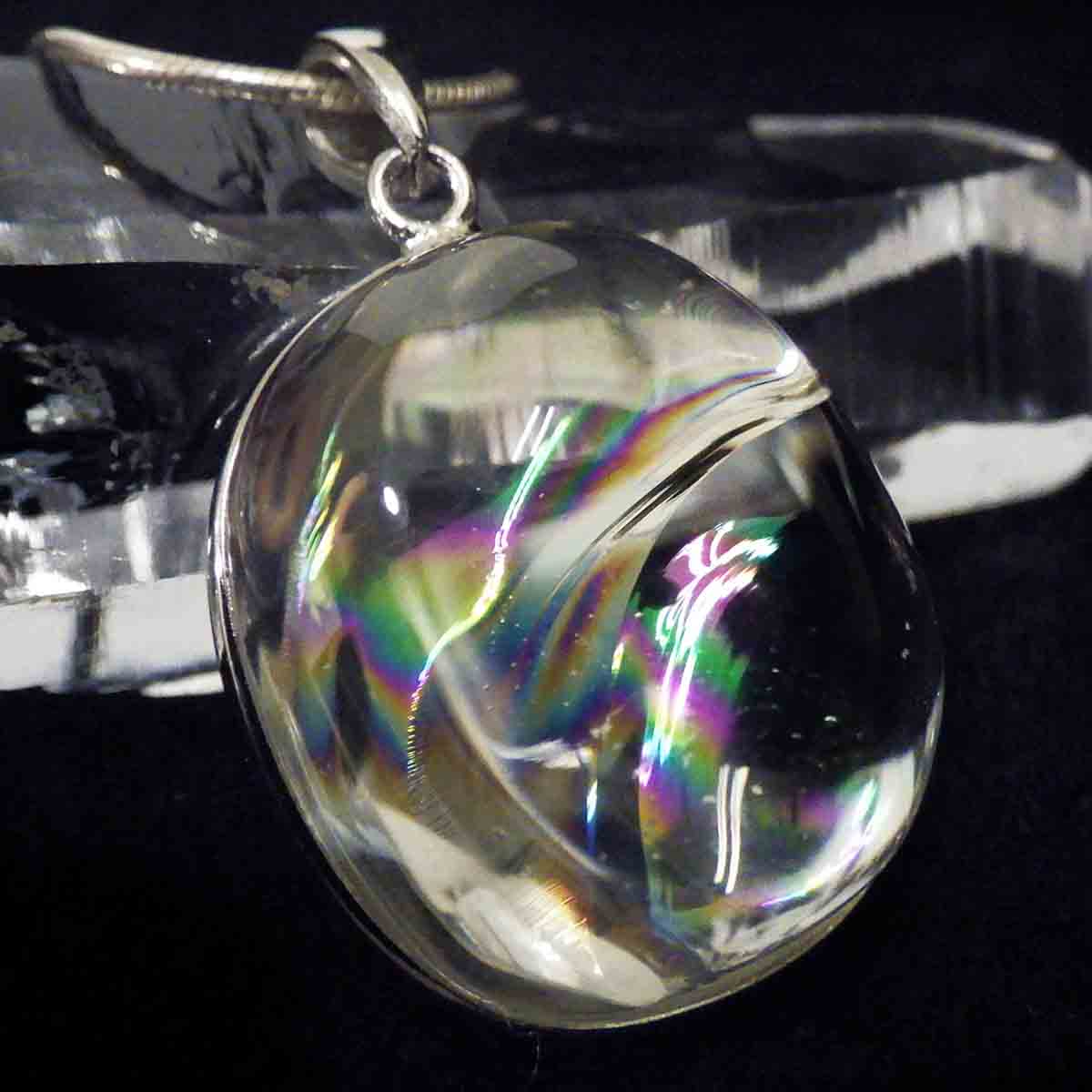 レインボーを残すように膨らみのある半球状のカボションペンダントに加工しました。透明度が高く、大きさもある水晶のレインボー部分のみを磨き上げており、虹色を閉じ込めた大変美しいペンダントに仕上がっています。レインボークォーツは別名アイリスクォーツとも呼ばれており、持ち主を幸福や希望に導くとされています。