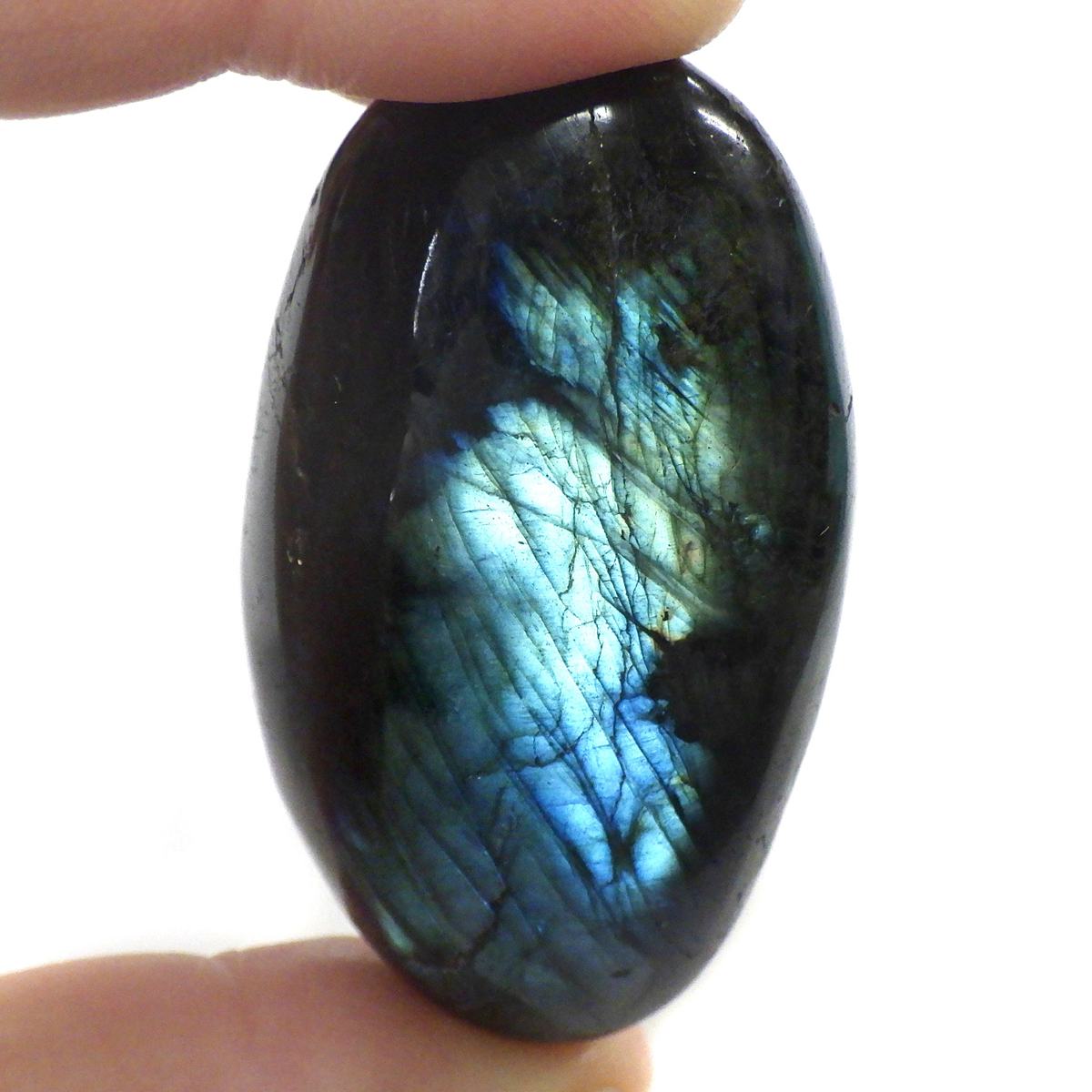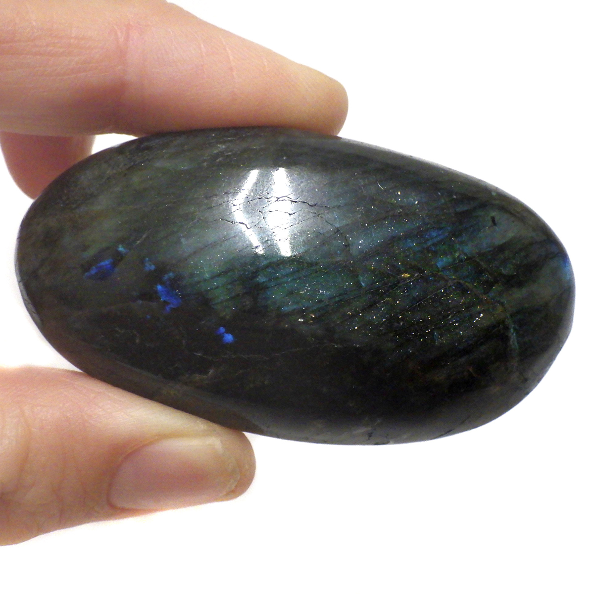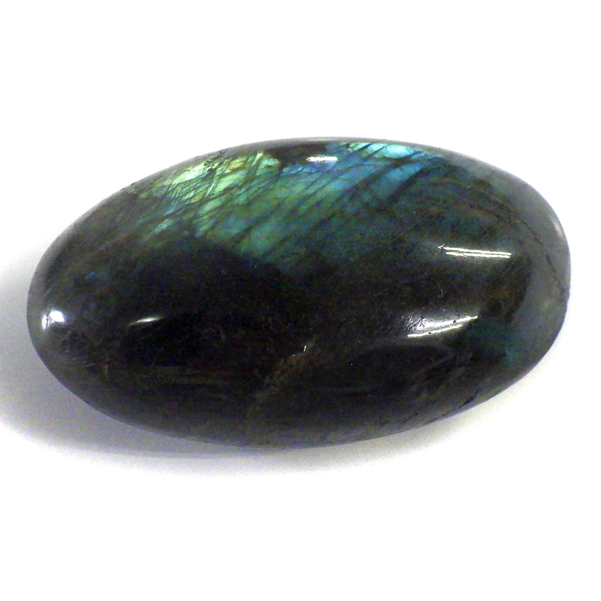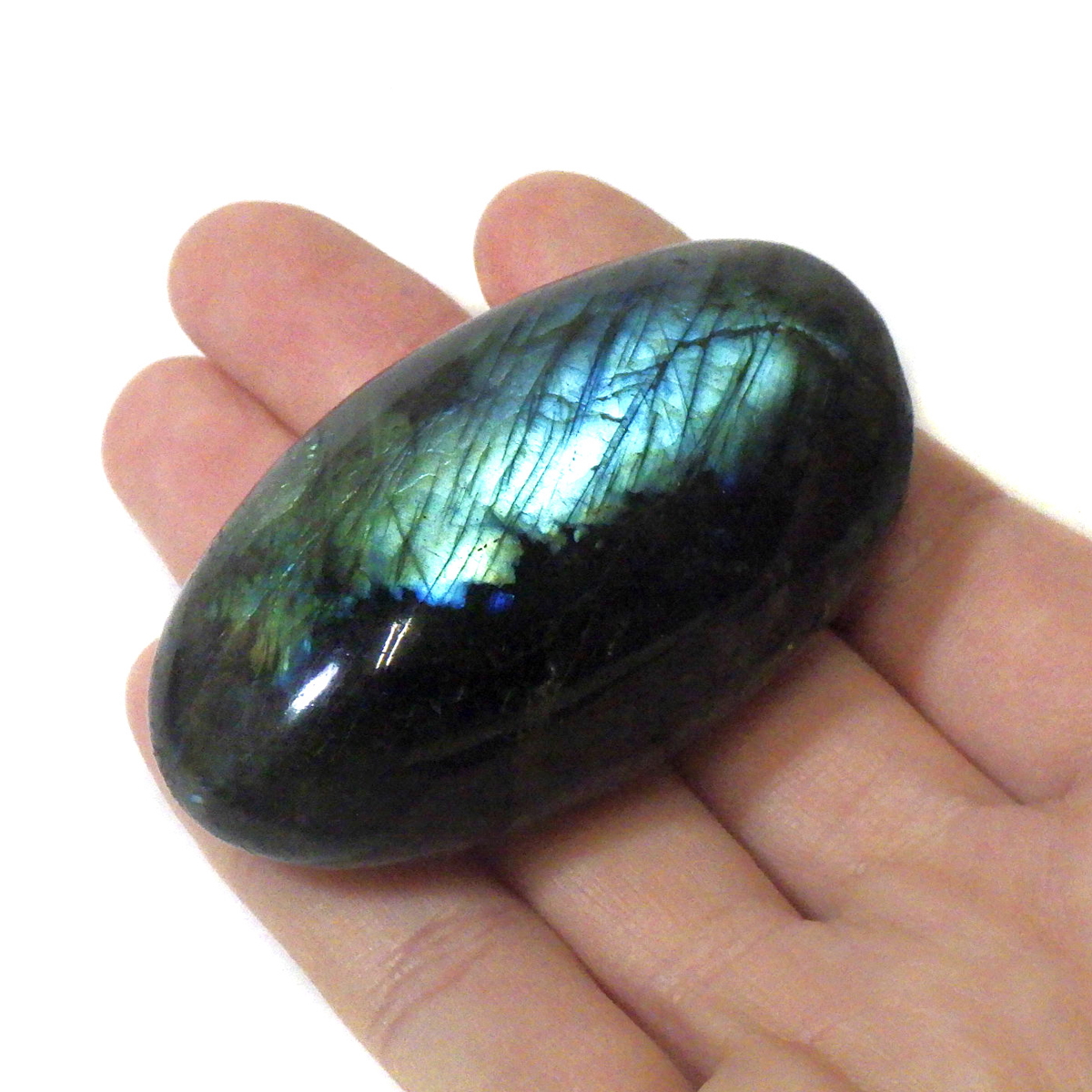 マダガスカル産のラブラドライト磨きペブルです。 見る角度によってオーロラのような色彩を変える美しい光を持つのが特徴です。 石自体はグレーなどの地味めな色合いをしていますが、そこに鮮やかな輝きが浮かび上がるところから「アゲハ蝶の羽」に例えられる事もある美しい石です。 ラブラドライトは、月・太陽を象徴するといわれています。根気強い実行力を養い、信念を貫けるよう導く力があるとされます。そして、直感力・洞察力・創造性を高めてくれるでしょう。自信を失いかけた時に、生まれた意味・生きる意味を気づかせるサポートをしてくれ、生きる力を引き出してくれるといわれています。