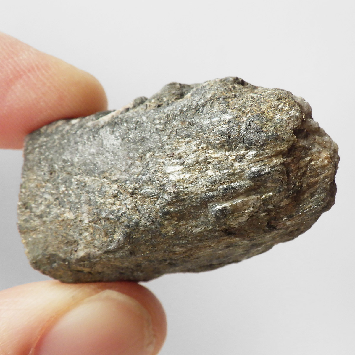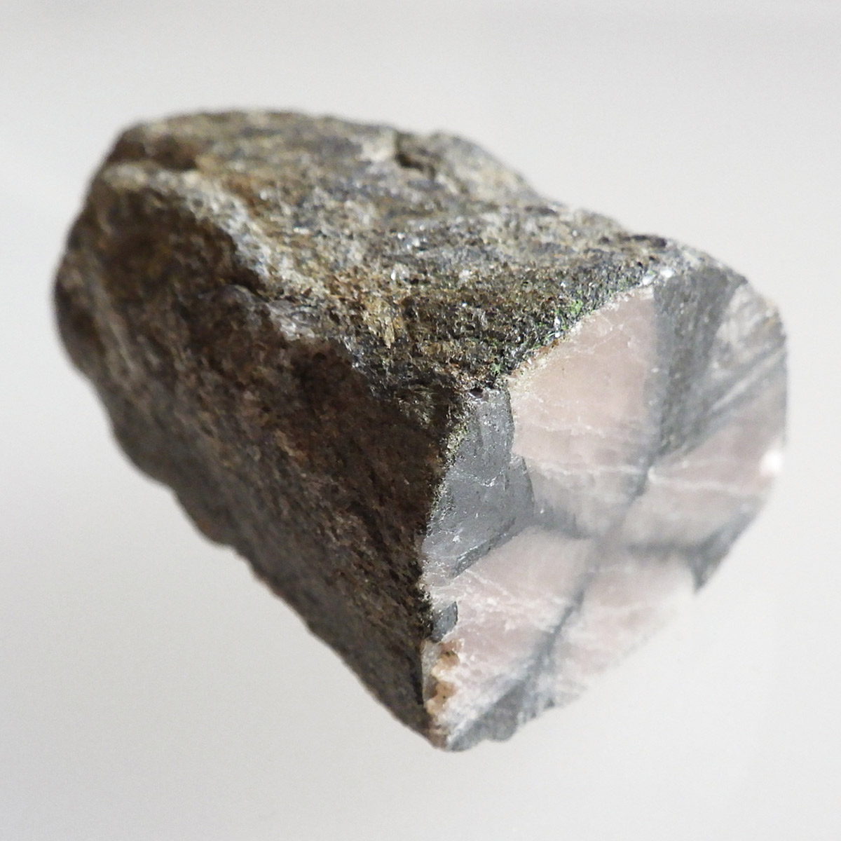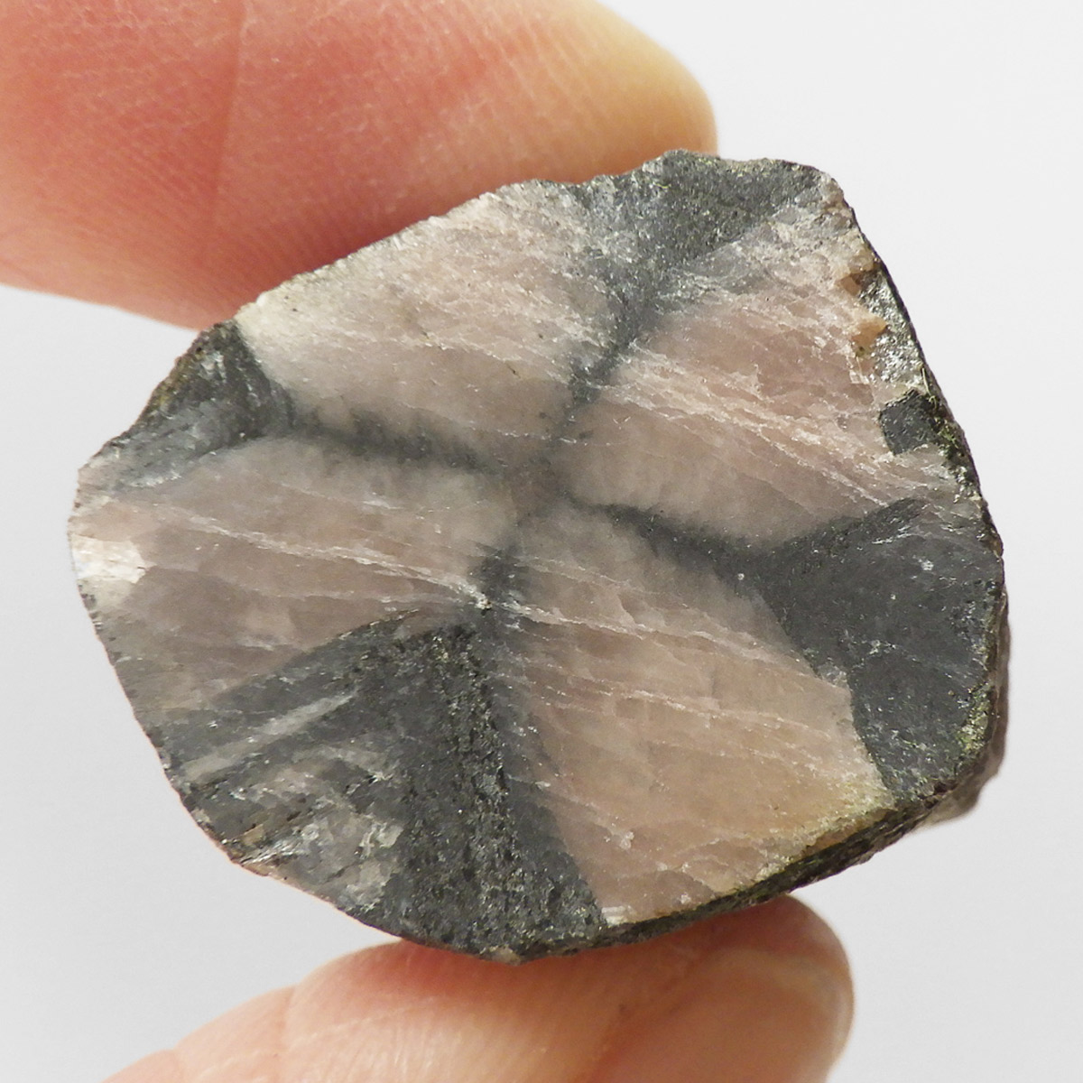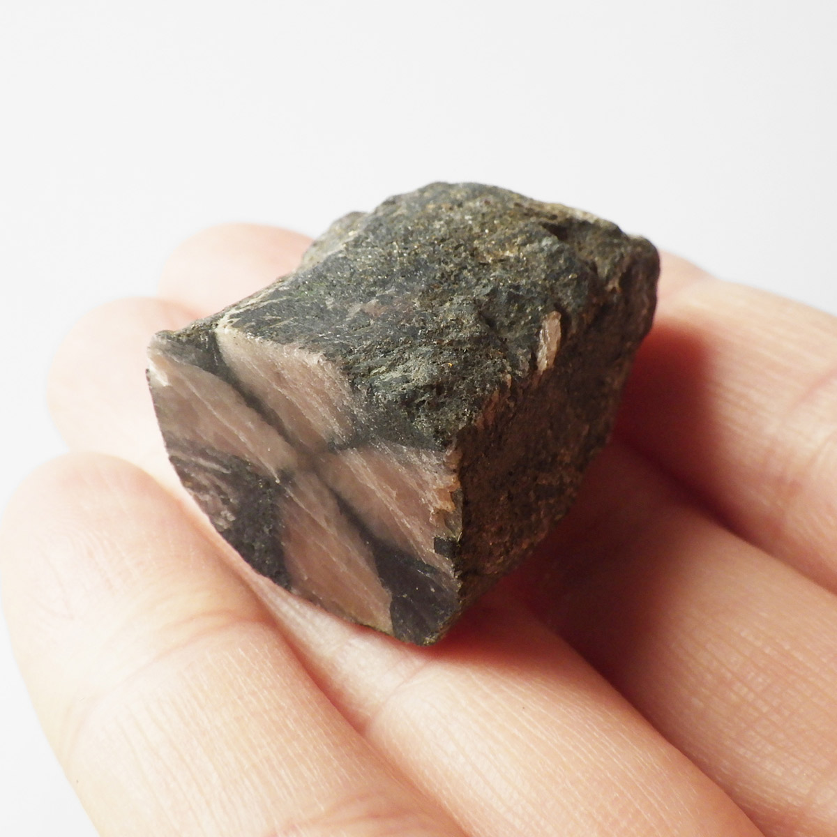 チャイナ産、キャストライト原石です。濃いブラウンに黒の十字模様が大変魅力的な石です。キャストライトの名前は、輪切りにすると黒い十字の模様が現れることから、ギリシャ語で「対角線的な配列」という意味の「Chiastos」に由来しています。キャストライトは、黒鉛(グラファイト)などの黒色含有物を対称的に含んだ紅柱石(アンダルサイト)です。クロスストーンとも呼ばれ、粘板岩と花こう岩の接触部に産出します。