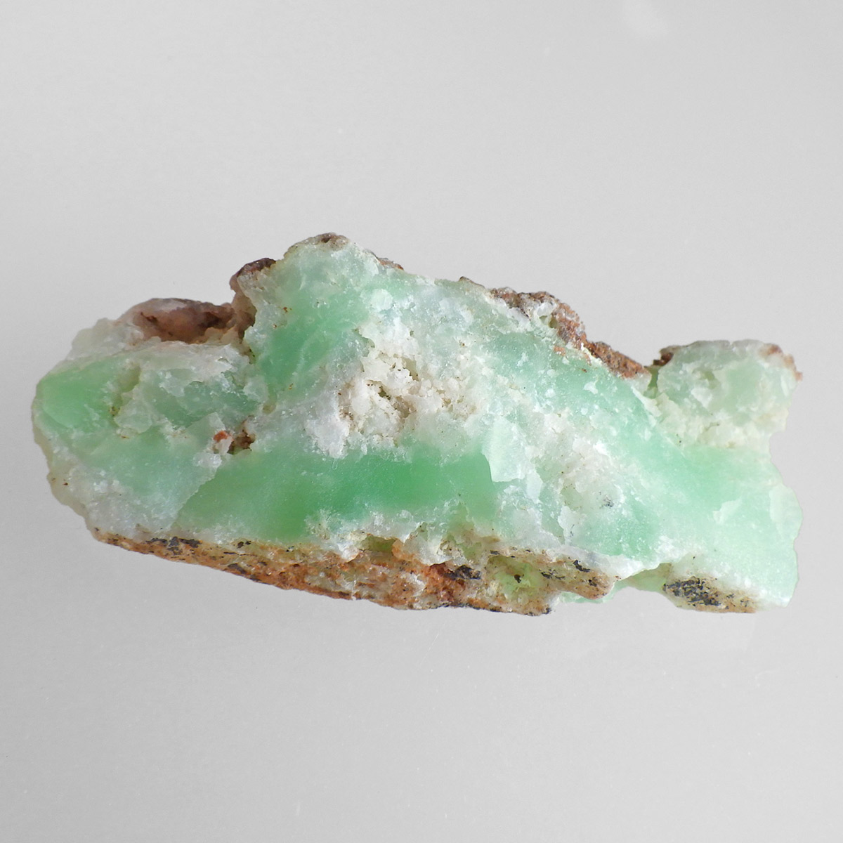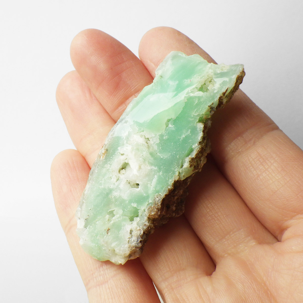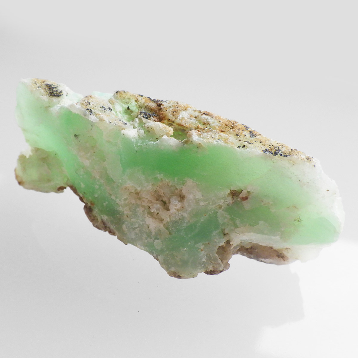 オーストラリア産のクリソプレーズ、ポリッシュ仕上げです。 和名を「緑玉髄」といいます。カルセドニーの一種で、黄緑色や薄緑色のものをクリソプレーズと言います。産出量がとても少ない為カルセドニーの中で最も価値が高い石とされており、その鮮やかな色から「アップルグリーン」と呼ばれ親しまれてきました。生成は珪酸溶液中にニッケルを含む鉱物が混入し、コロイド状になって固まってできると言われています。太陽光に長時間当てると退色する恐れがあるので注意が必要です。