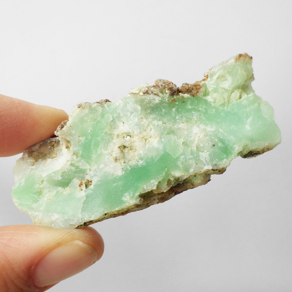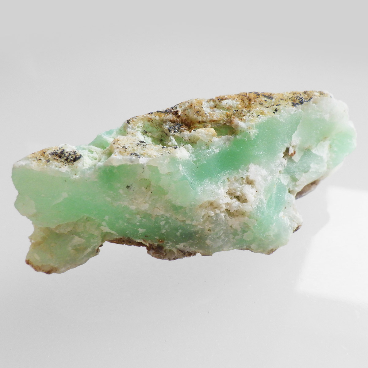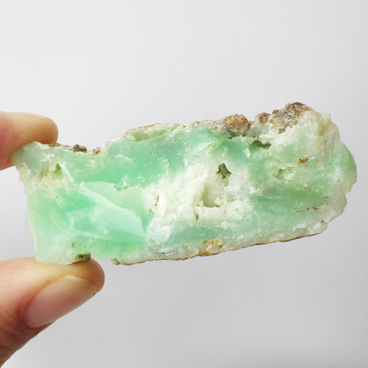 オーストラリア産のクリソプレーズ、ポリッシュ仕上げです。 和名を「緑玉髄」といいます。カルセドニーの一種で、黄緑色や薄緑色のものをクリソプレーズと言います。産出量がとても少ない為カルセドニーの中で最も価値が高い石とされており、その鮮やかな色から「アップルグリーン」と呼ばれ親しまれてきました。生成は珪酸溶液中にニッケルを含む鉱物が混入し、コロイド状になって固まってできると言われています。太陽光に長時間当てると退色する恐れがあるので注意が必要です。