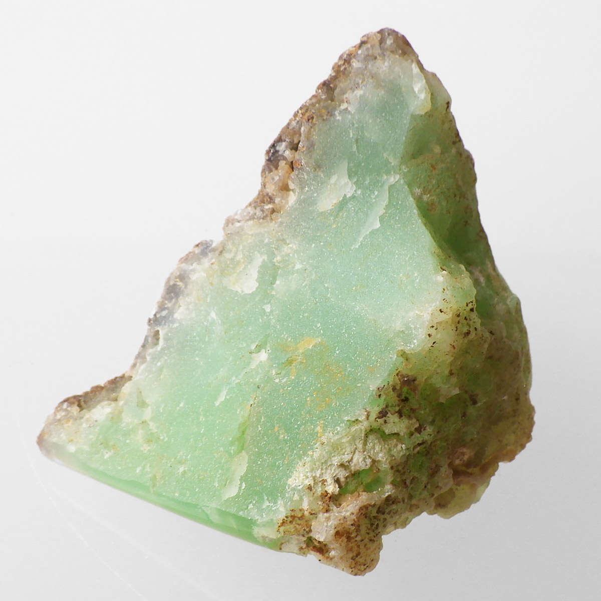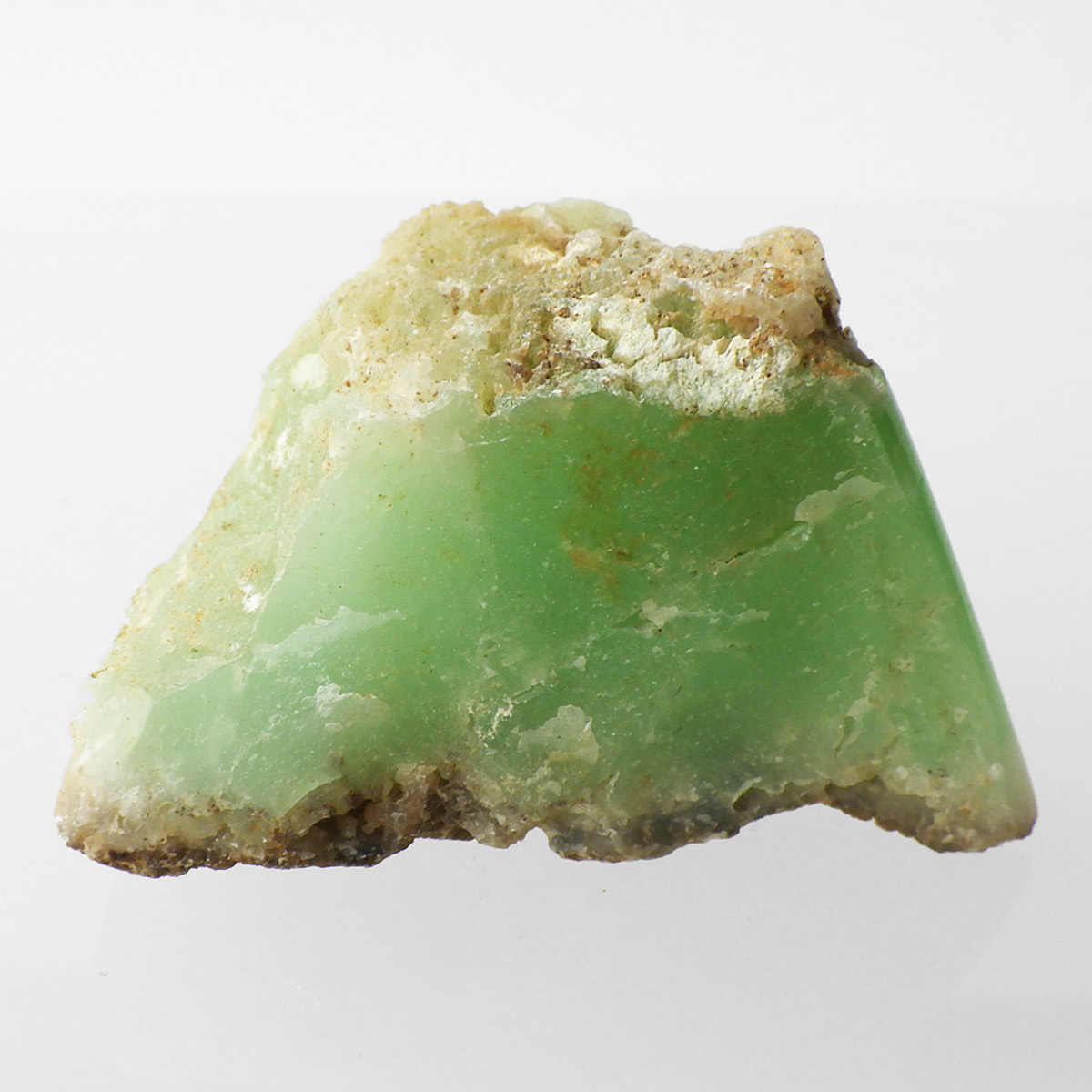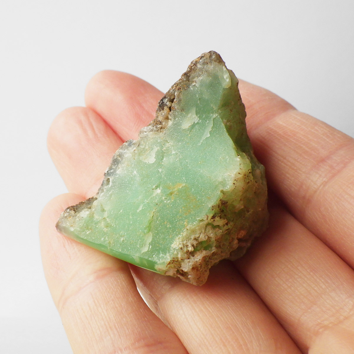 オーストラリア産のクリソプレーズ、ポリッシュ仕上げです。 和名を「緑玉髄」といいます。カルセドニーの一種で、黄緑色や薄緑色のものをクリソプレーズと言います。産出量がとても少ない為カルセドニーの中で最も価値が高い石とされており、その鮮やかな色から「アップルグリーン」と呼ばれ親しまれてきました。生成は珪酸溶液中にニッケルを含む鉱物が混入し、コロイド状になって固まってできると言われています。太陽光に長時間当てると退色する恐れがあるので注意が必要です。