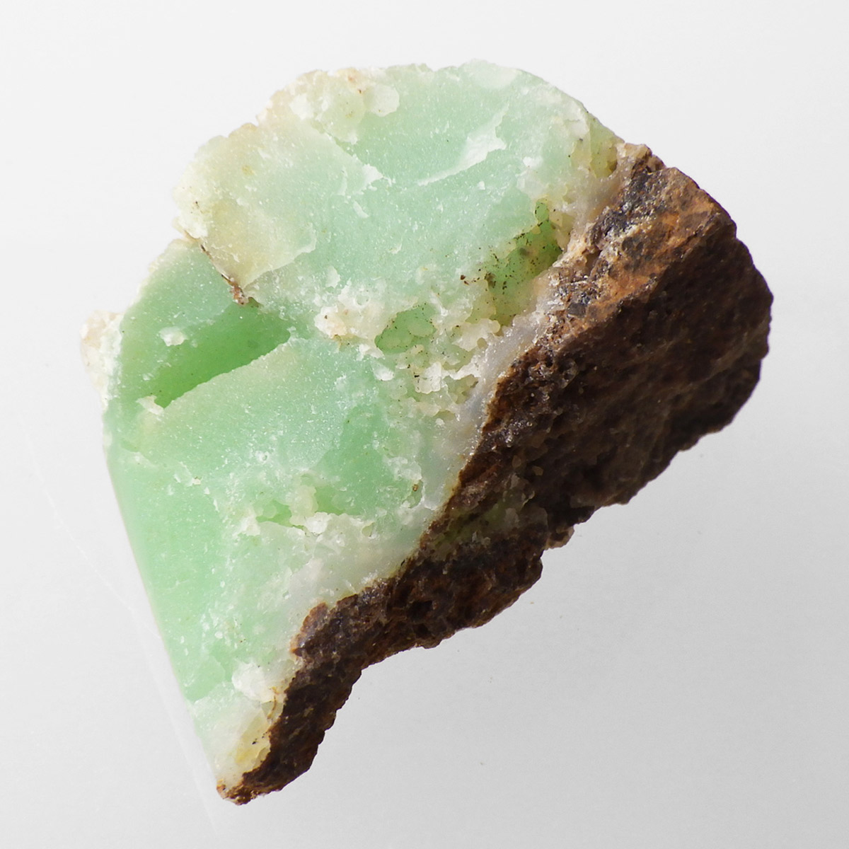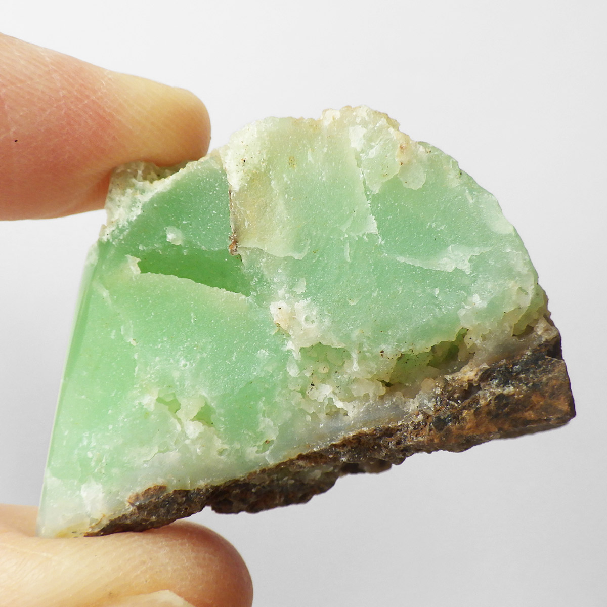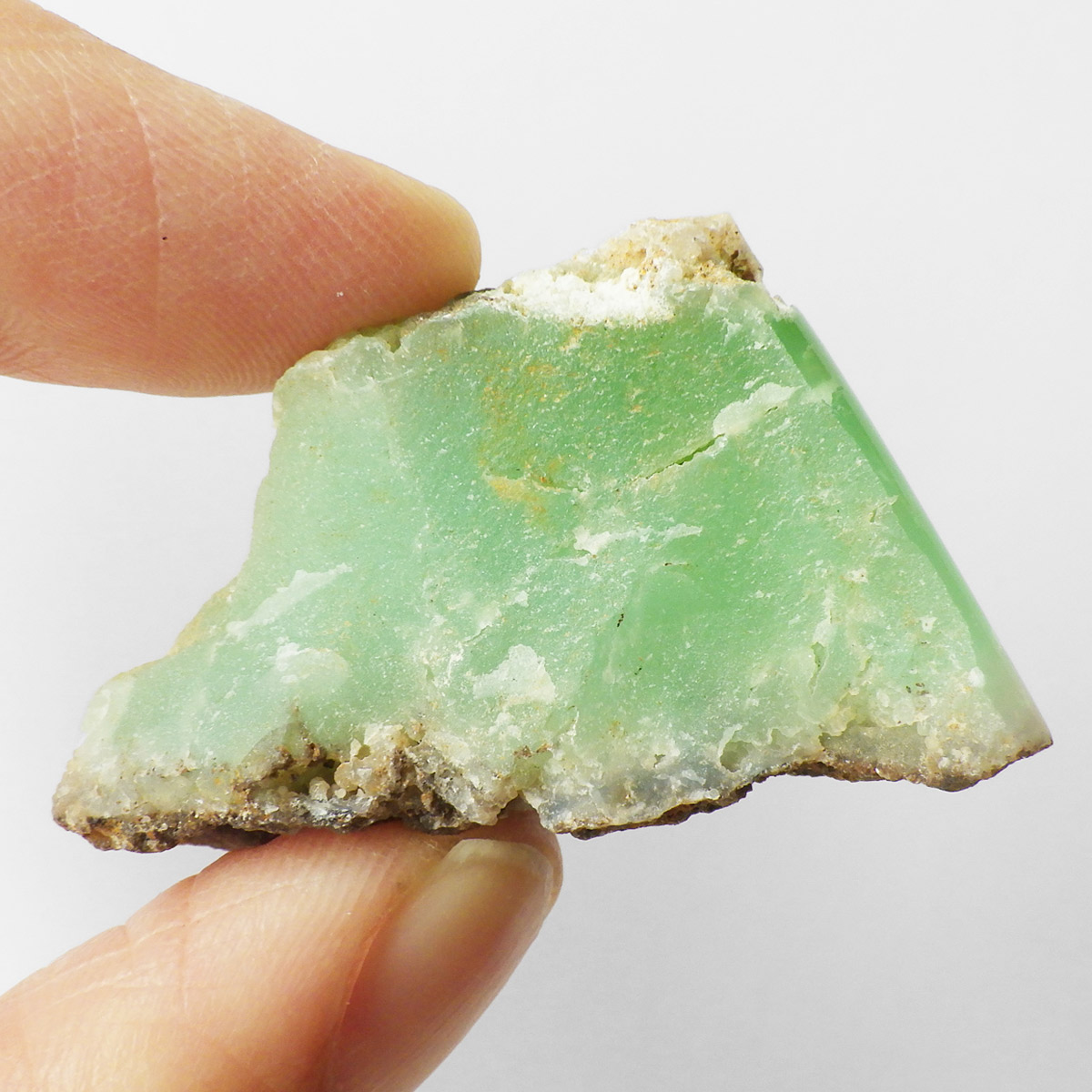 オーストラリア産のクリソプレーズ、ポリッシュ仕上げです。 和名を「緑玉髄」といいます。カルセドニーの一種で、黄緑色や薄緑色のものをクリソプレーズと言います。産出量がとても少ない為カルセドニーの中で最も価値が高い石とされており、その鮮やかな色から「アップルグリーン」と呼ばれ親しまれてきました。生成は珪酸溶液中にニッケルを含む鉱物が混入し、コロイド状になって固まってできると言われています。太陽光に長時間当てると退色する恐れがあるので注意が必要です。