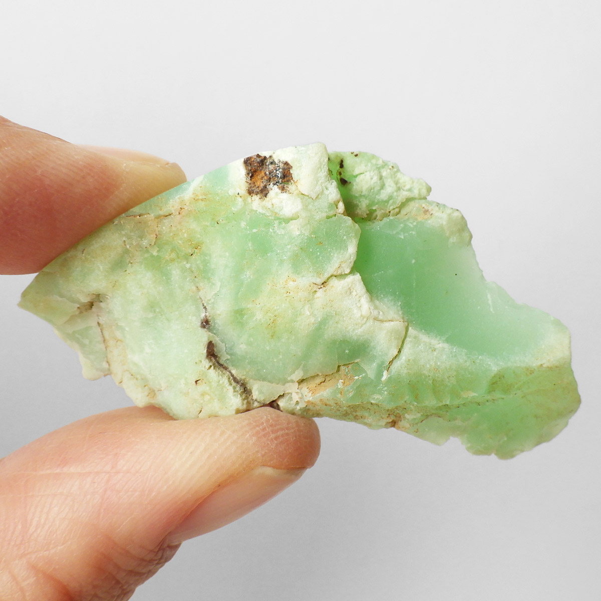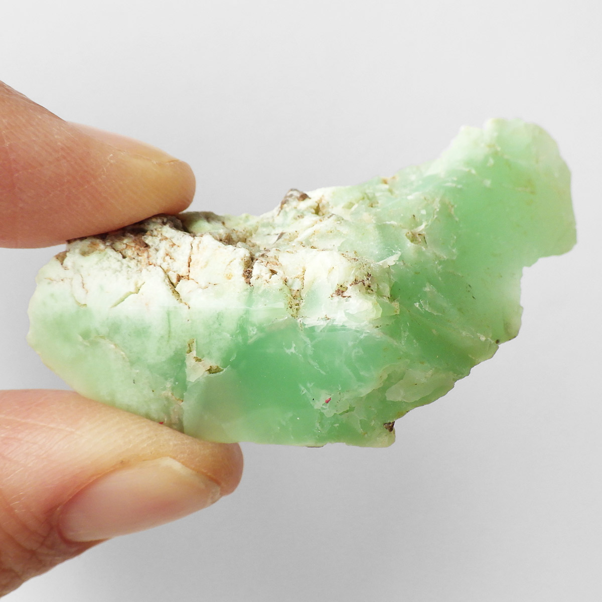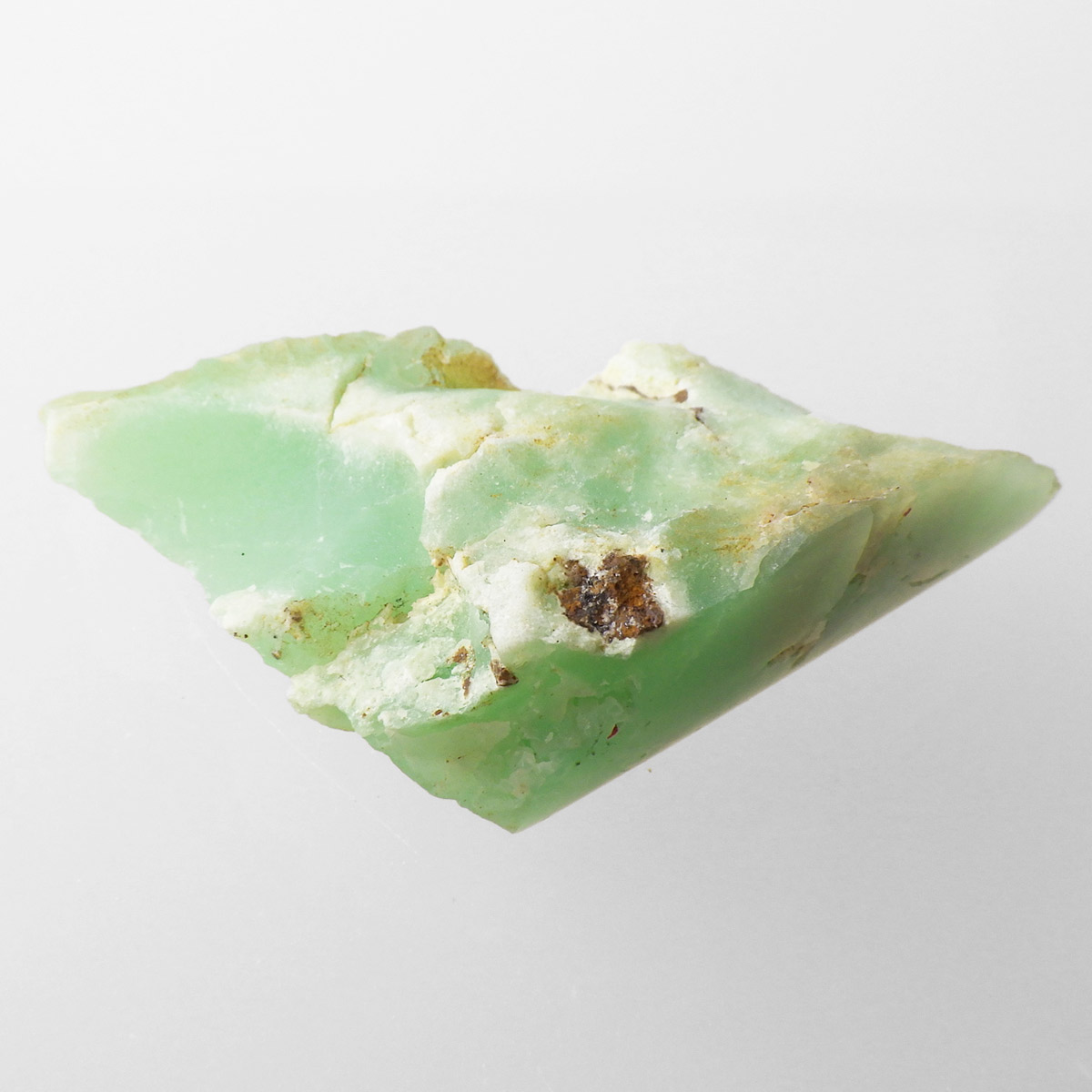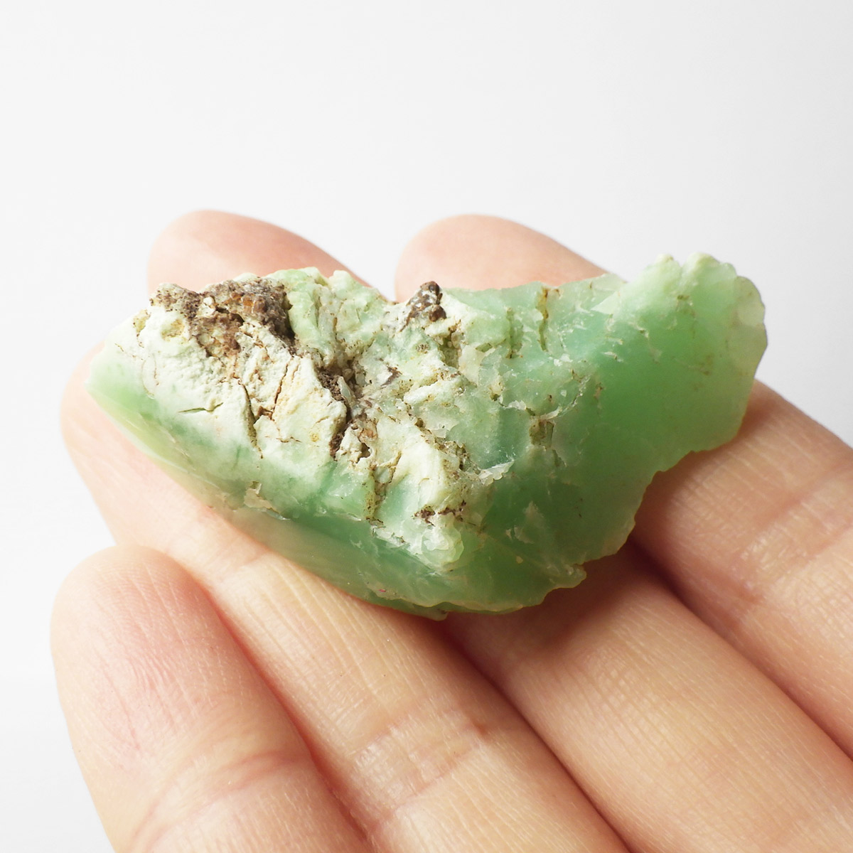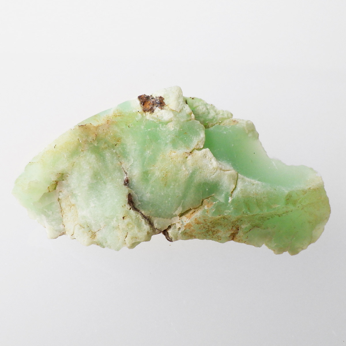 オーストラリア産のクリソプレーズ、ポリッシュ仕上げです。 和名を「緑玉髄」といいます。カルセドニーの一種で、黄緑色や薄緑色のものをクリソプレーズと言います。産出量がとても少ない為カルセドニーの中で最も価値が高い石とされており、その鮮やかな色から「アップルグリーン」と呼ばれ親しまれてきました。生成は珪酸溶液中にニッケルを含む鉱物が混入し、コロイド状になって固まってできると言われています。太陽光に長時間当てると退色する恐れがあるので注意が必要です。