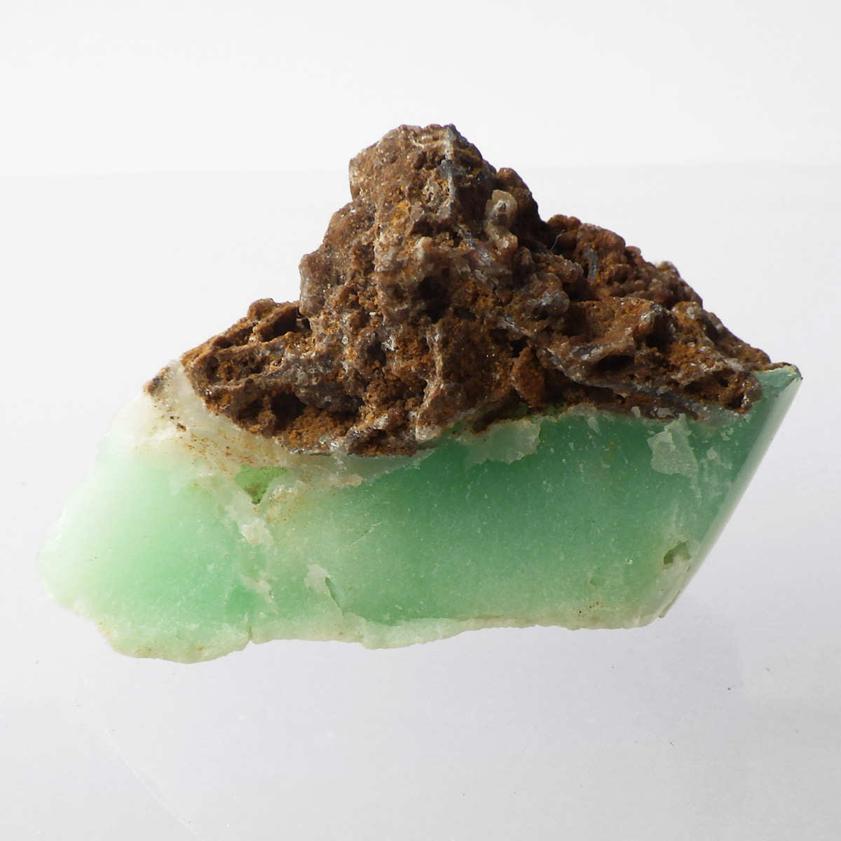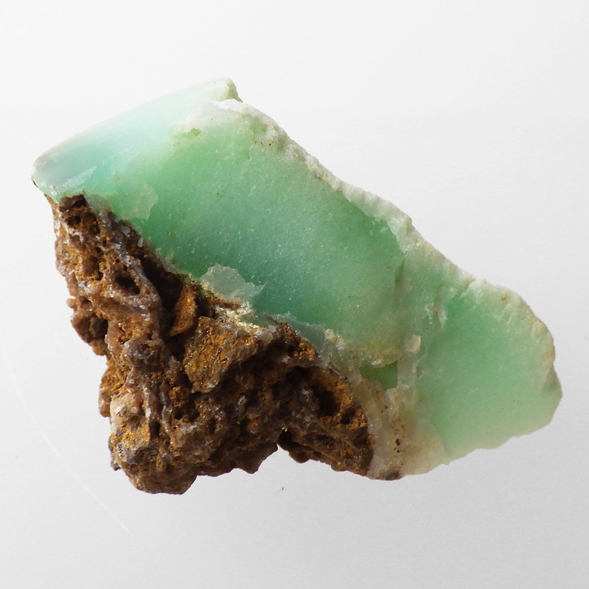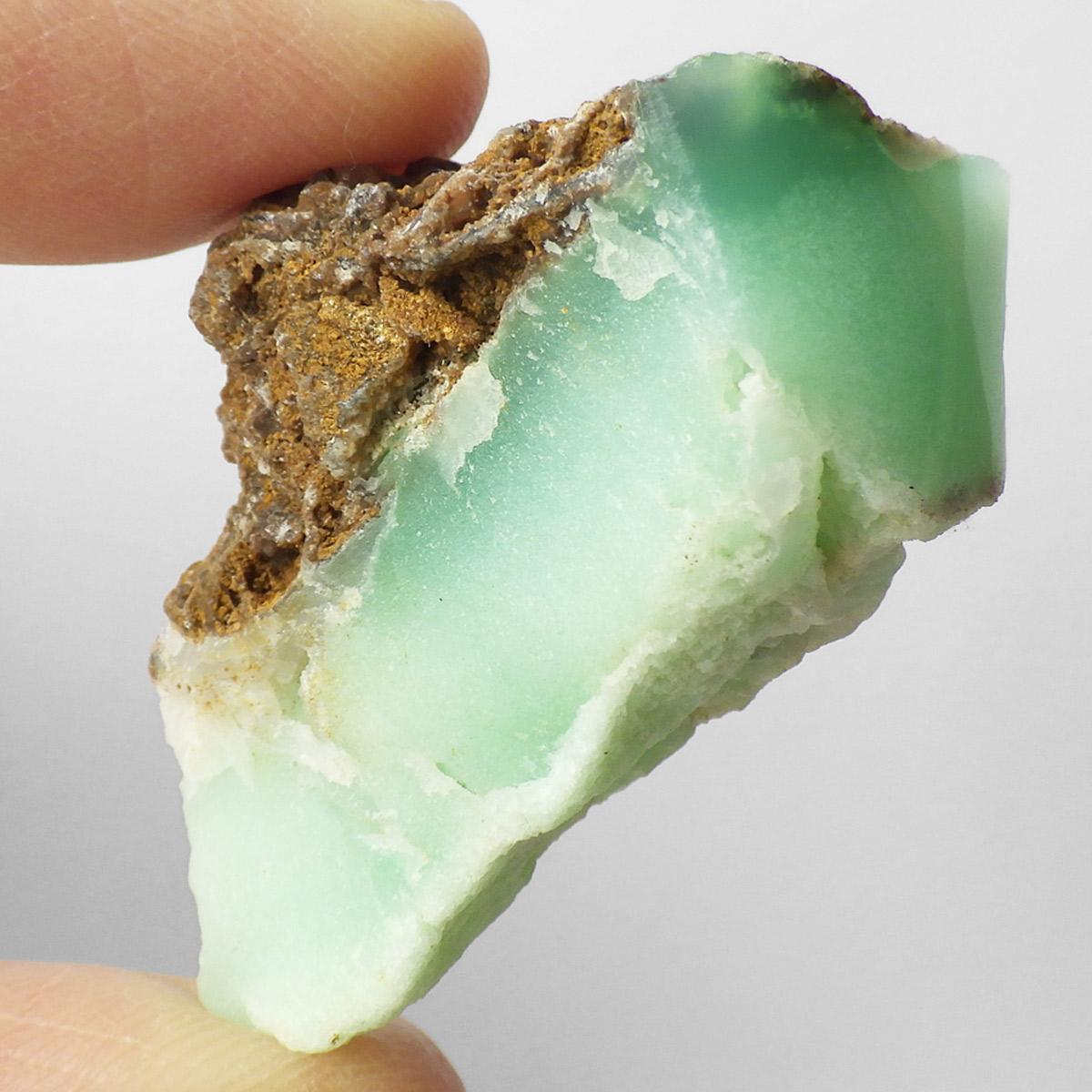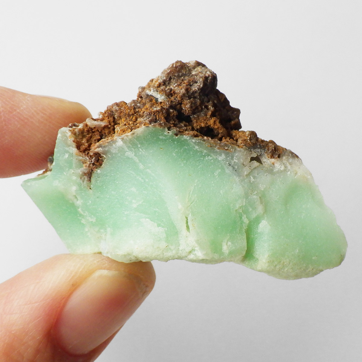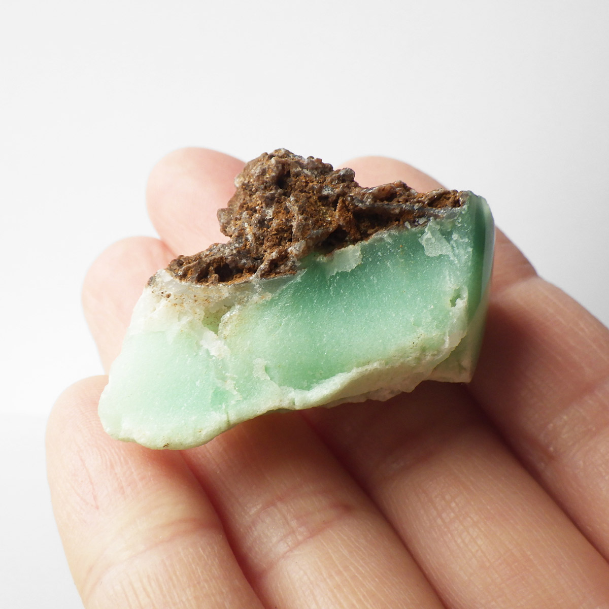 オーストラリア産のクリソプレーズ、ポリッシュ仕上げです。 和名を「緑玉髄」といいます。カルセドニーの一種で、黄緑色や薄緑色のものをクリソプレーズと言います。産出量がとても少ない為カルセドニーの中で最も価値が高い石とされており、その鮮やかな色から「アップルグリーン」と呼ばれ親しまれてきました。生成は珪酸溶液中にニッケルを含む鉱物が混入し、コロイド状になって固まってできると言われています。太陽光に長時間当てると退色する恐れがあるので注意が必要です。