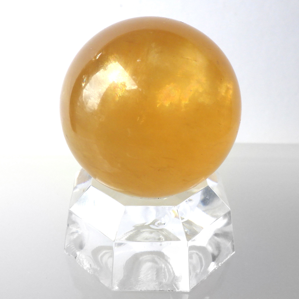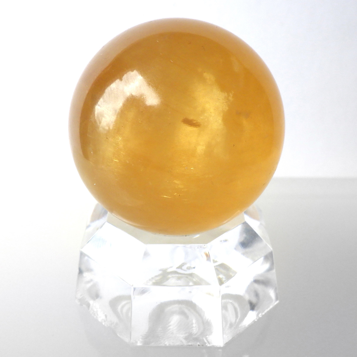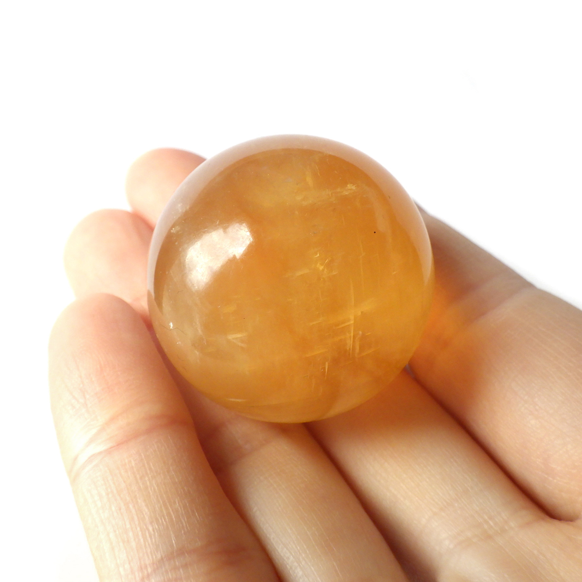 ブラジル産のゴールデンイエローカルサイト、スフィアです。 イエローで半透明の球の中にぎらっとレインボーが浮かび上がり、輝くことからゴールデンイエローカルサイトと呼ばれています。 太陽のような黄金色の輝きが美しく、見る人の心を元気にさせてくれます。様々な表情で光りますので、ぜひ自然光の元、手に乗せて光を楽しんでみてください。