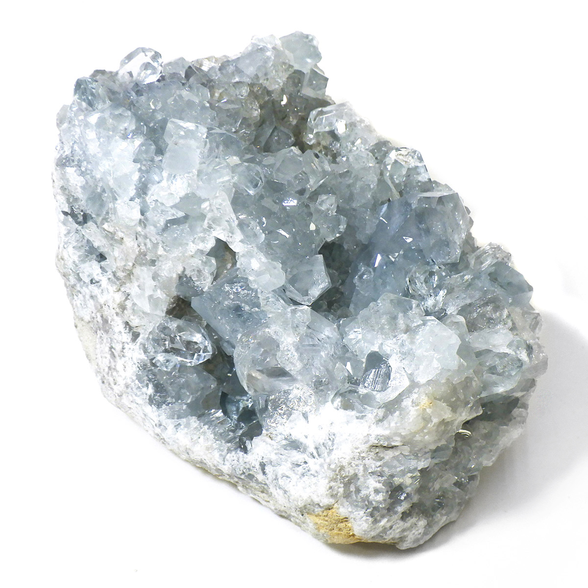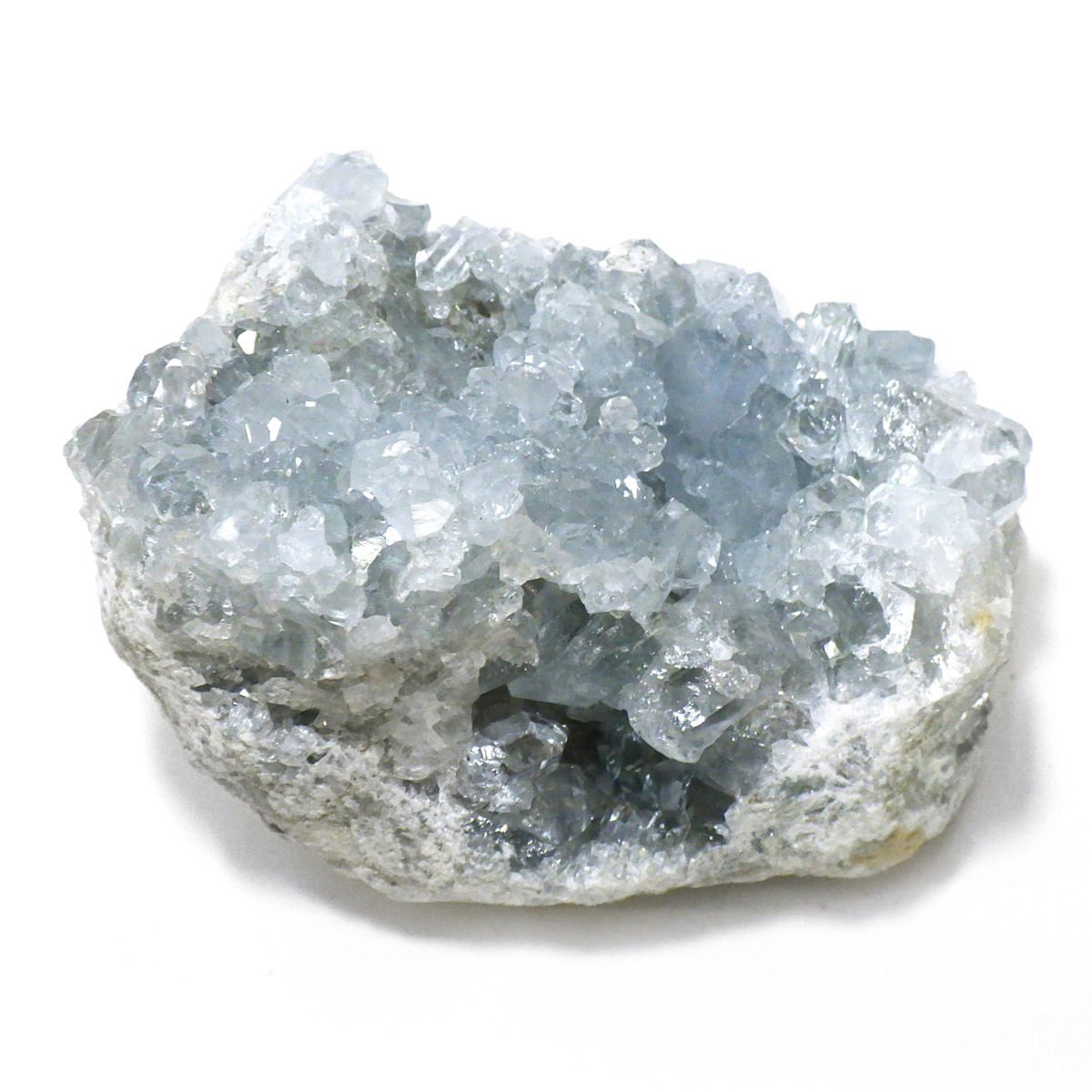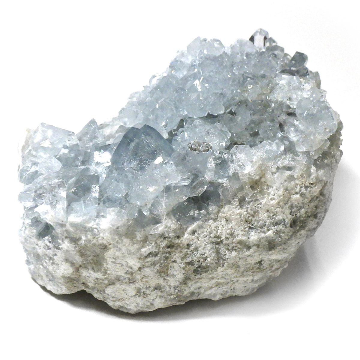 セレスタイト(天青石)母岩付きクラスターです。マダガスカル産のものは、母岩が丸みを帯びており、土台が白っぽいのが特徴です。 土台から突き出た、透明感あるブルーの結晶は非常に魅力的です。艶があり大変美しい一点です。