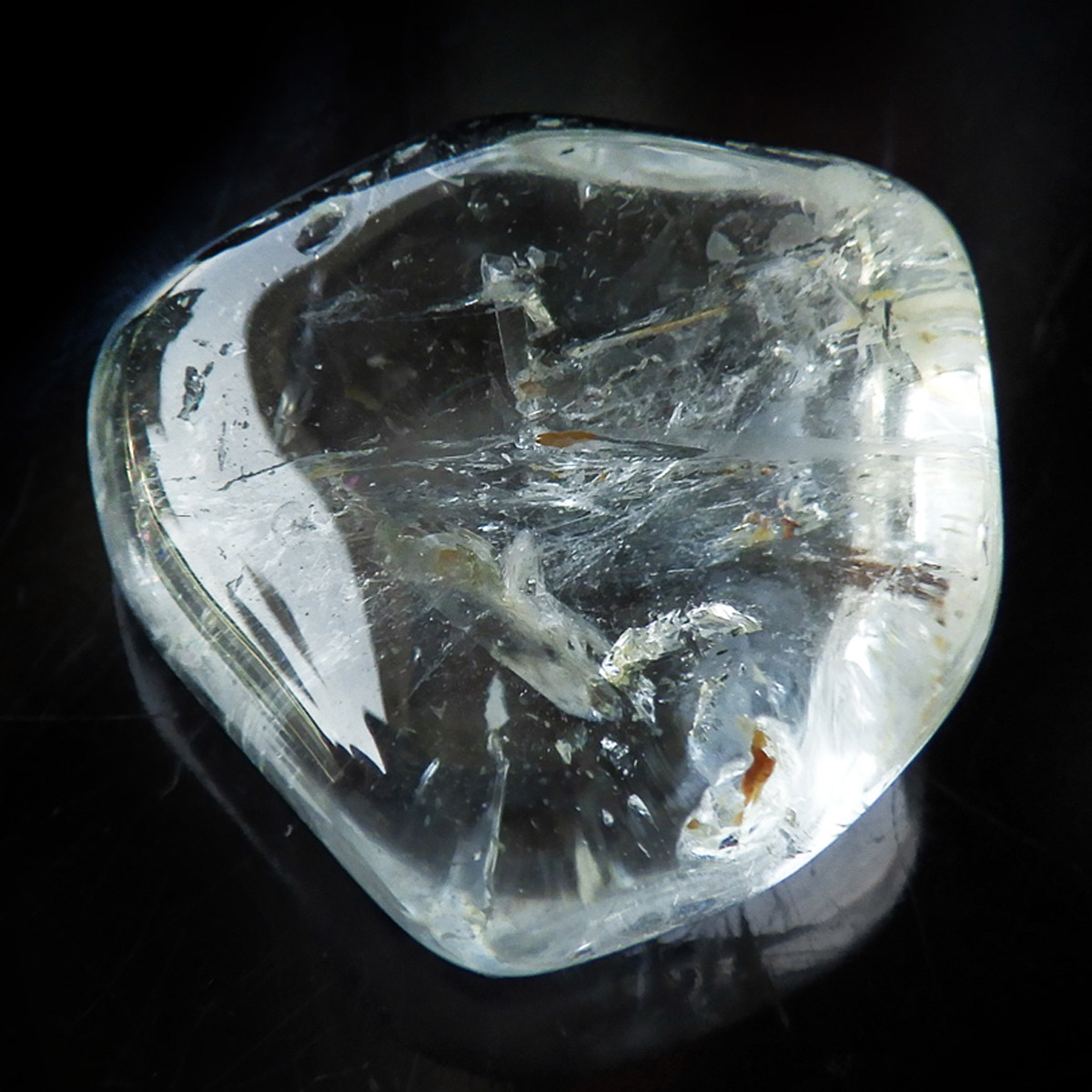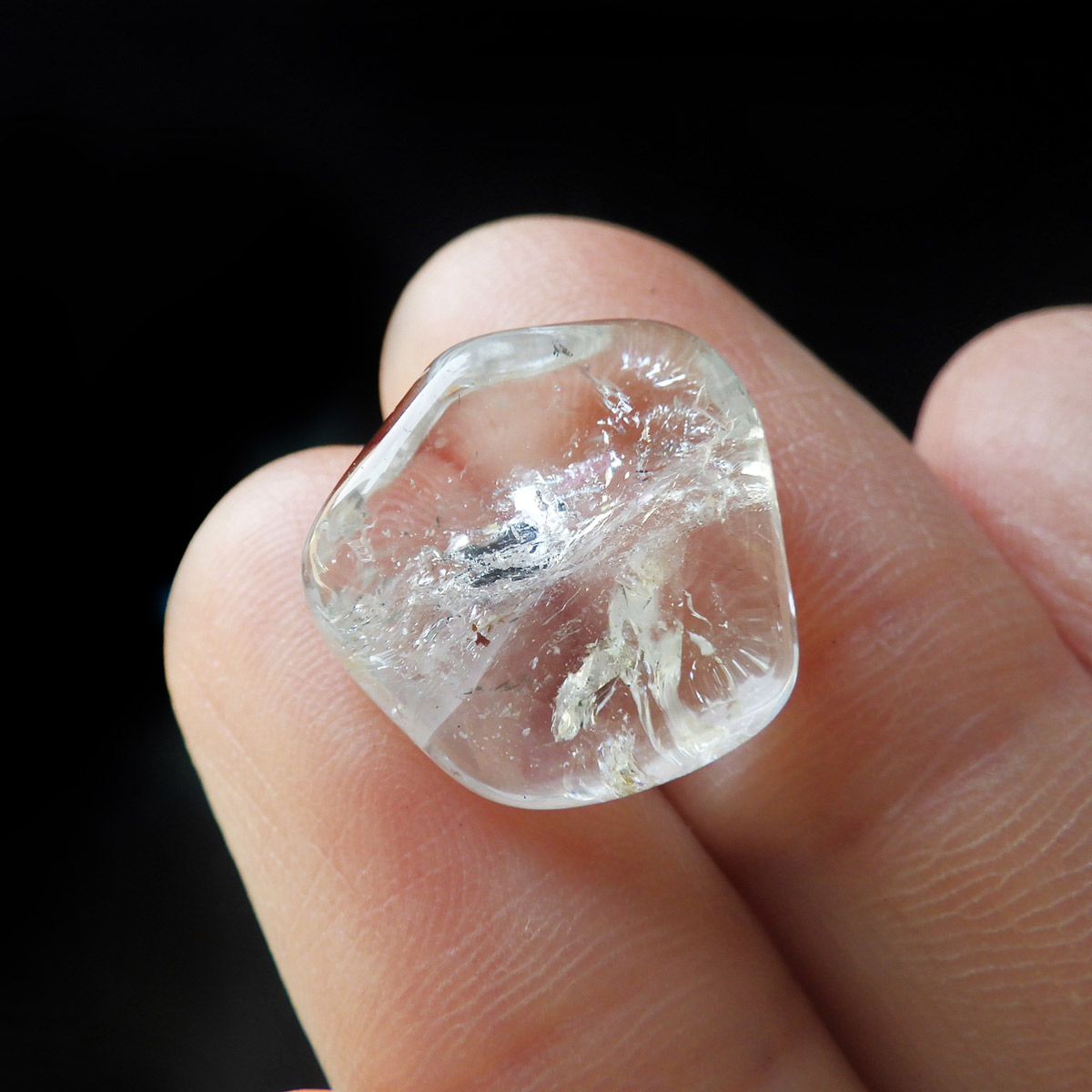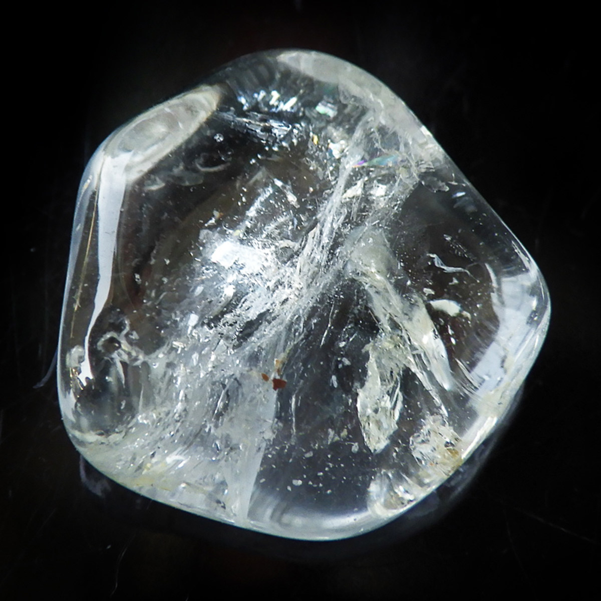 ブラジル産のブルートパーズ、タンブルです。トパーズは様々な色を持つ鉱物であり、和名を「黄玉(おうぎょく)」というように、本来は「黄色からオレンジ色」のトパーズがスタンダードなカラーとなっています。 その中でも、青色を発するものがブルートパーズと呼ばれています。しかし、青色のトパーズが天然で生まれることは大変希少であり、現在はほとんど見つかることがありません。 そのため、市場で流通しているブルートパーズのほとんどは、ホワイトトパーズに放射処理が施されています。今回ご用意したブルートパーズは、まさに天然のもので、大変希少価値の高いものです。