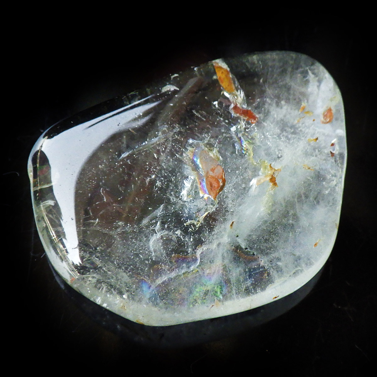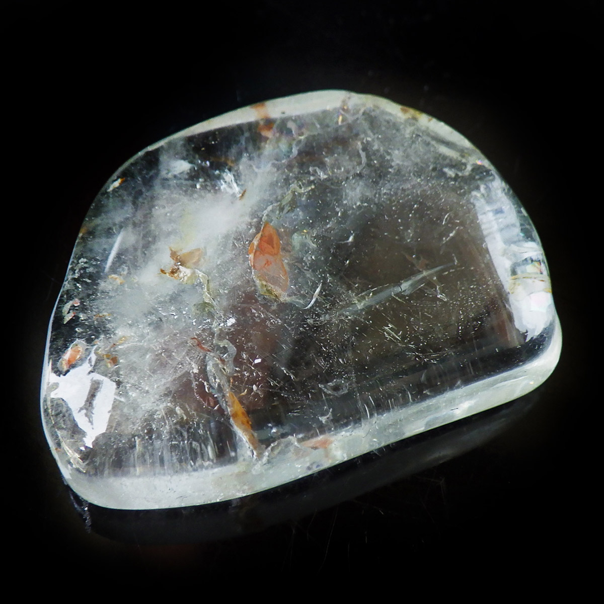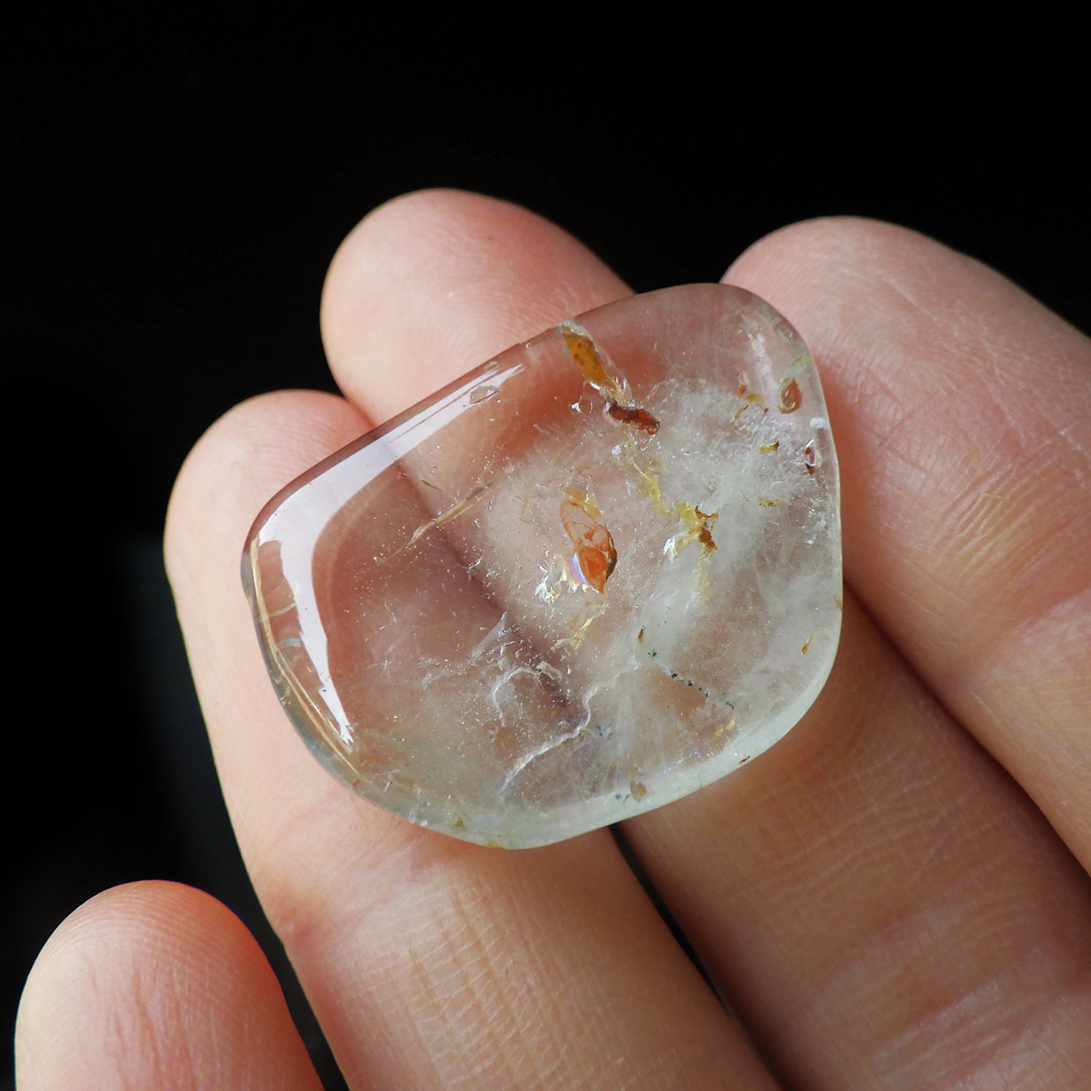 ブラジル産のブルートパーズ、タンブルです。トパーズは様々な色を持つ鉱物であり、和名を「黄玉(おうぎょく)」というように、本来は「黄色からオレンジ色」のトパーズがスタンダードなカラーとなっています。