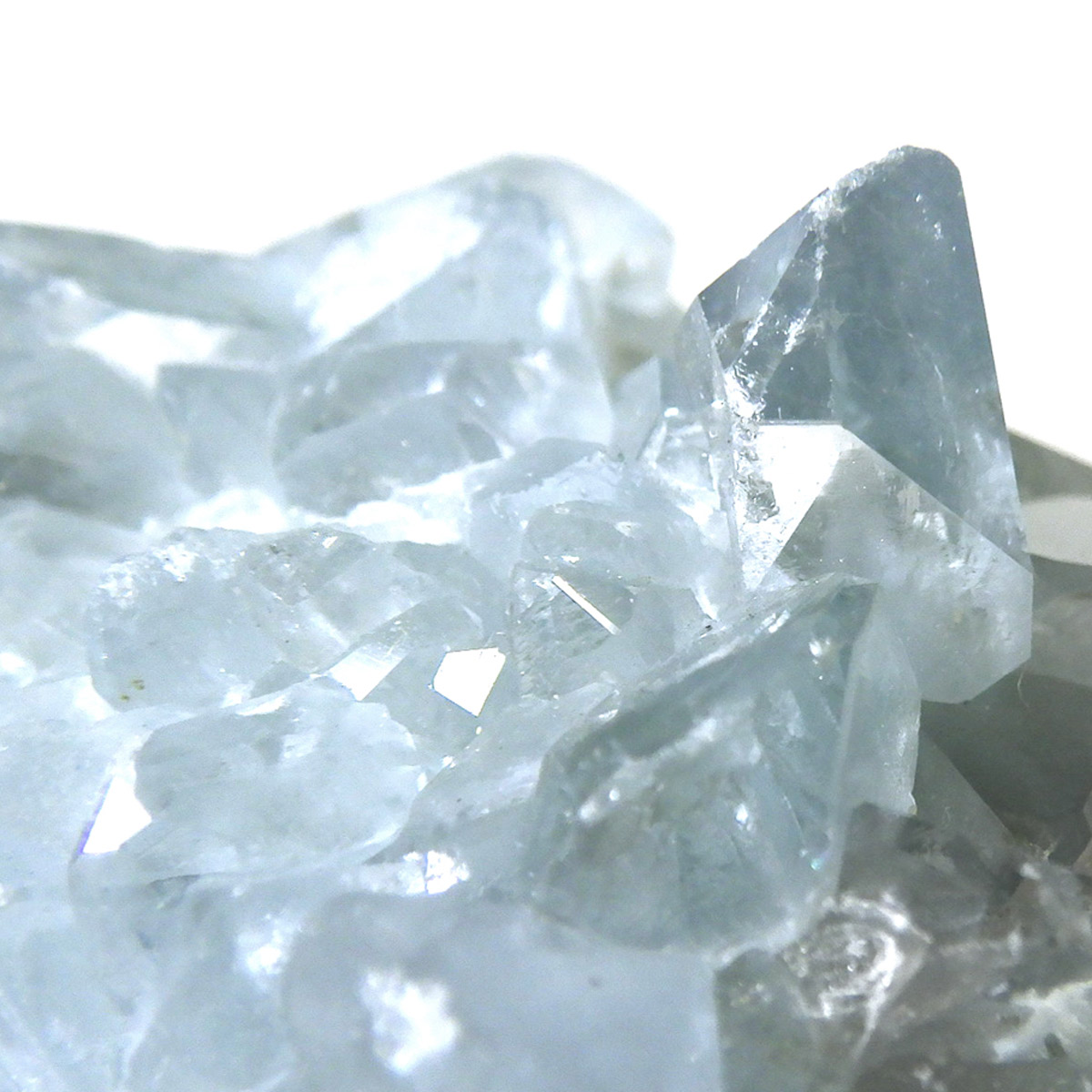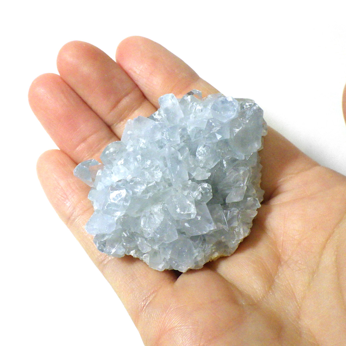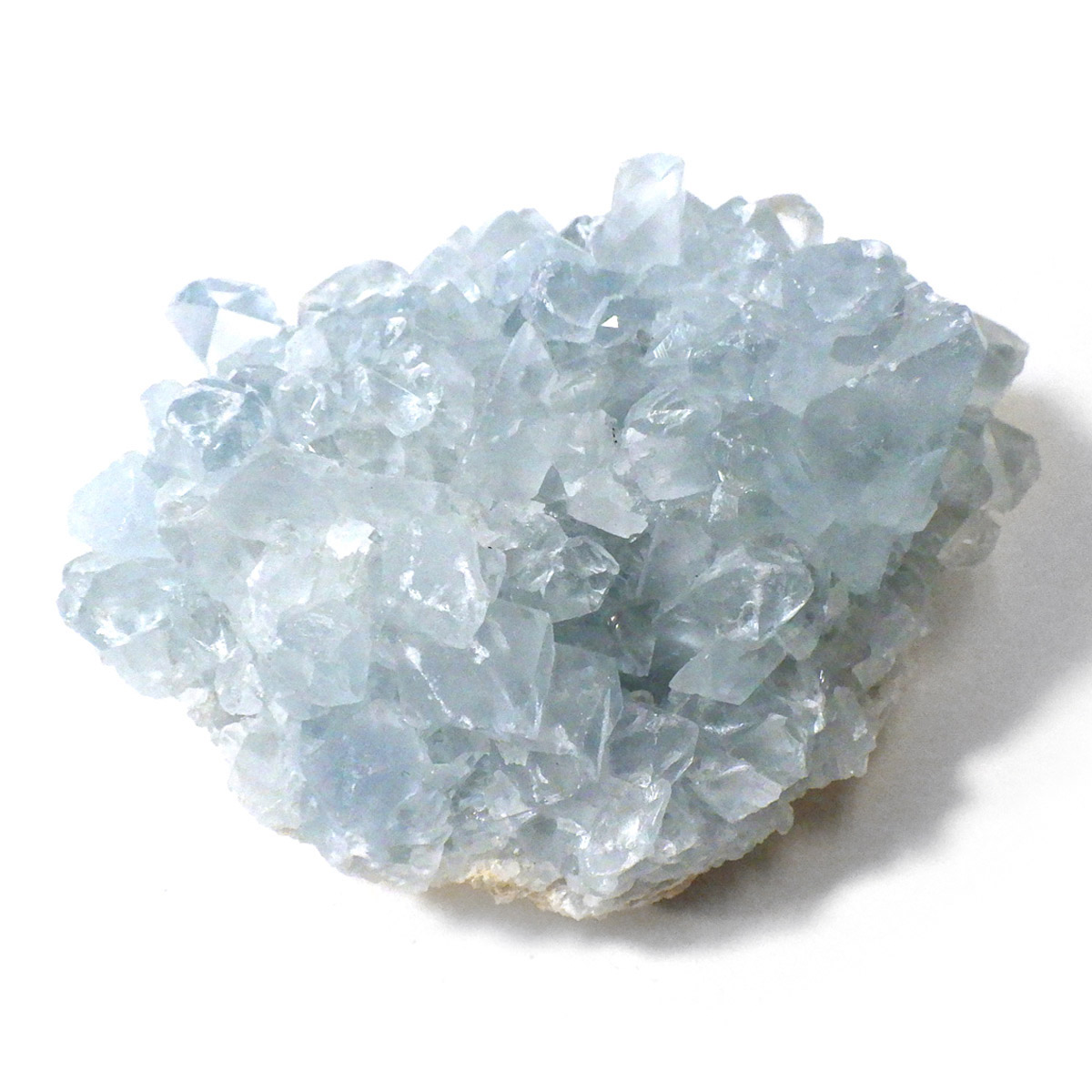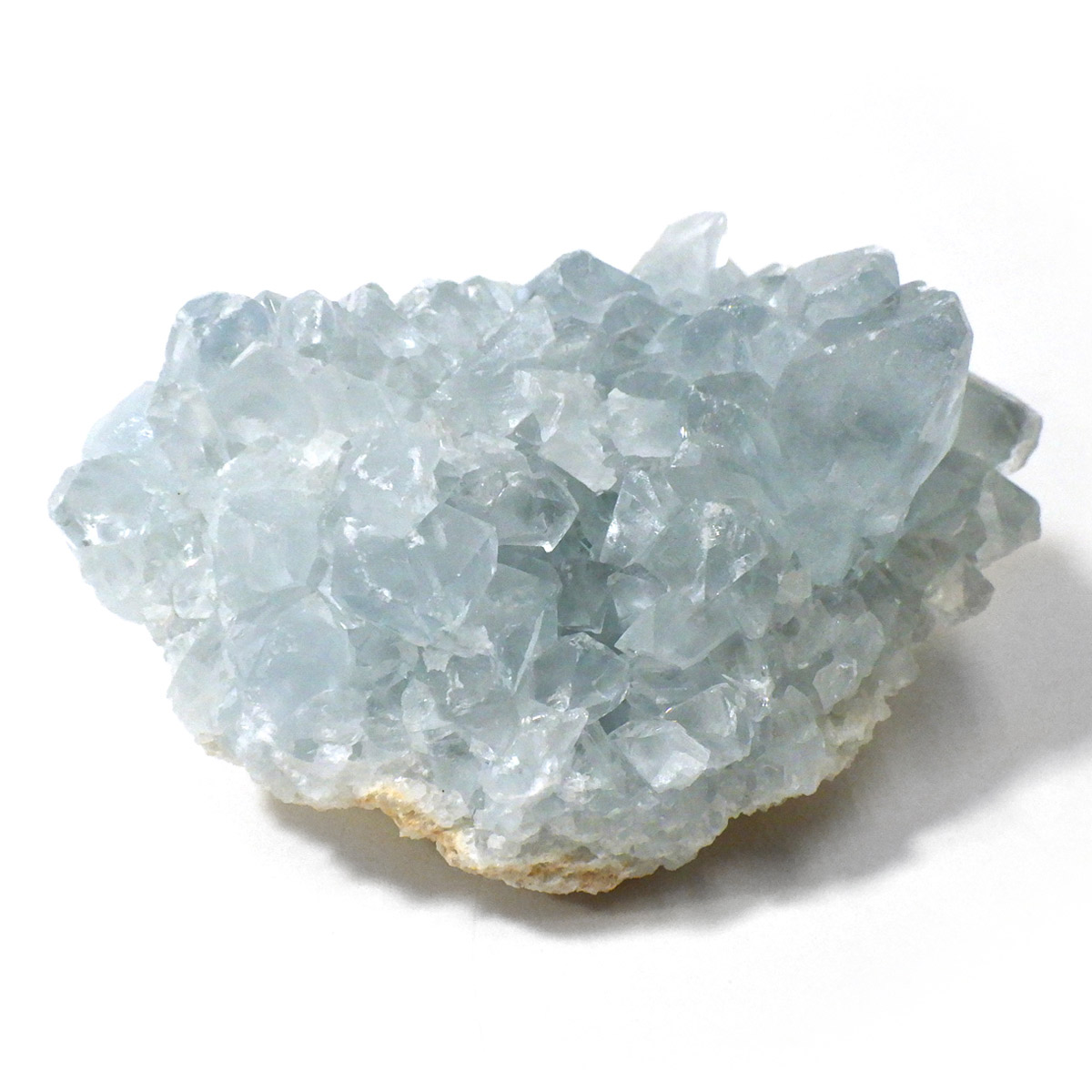 セレスタイト(天青石)母岩付きクラスターです。マダガスカル産のものは、母岩が丸みを帯びており、土台が白っぽいのが特徴です。 ころんとした可愛いサイズで、透明感あるブルーの結晶は非常に魅力的です。