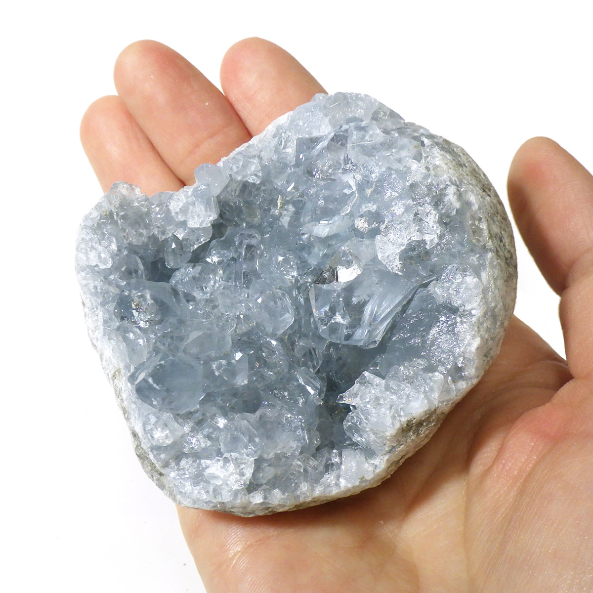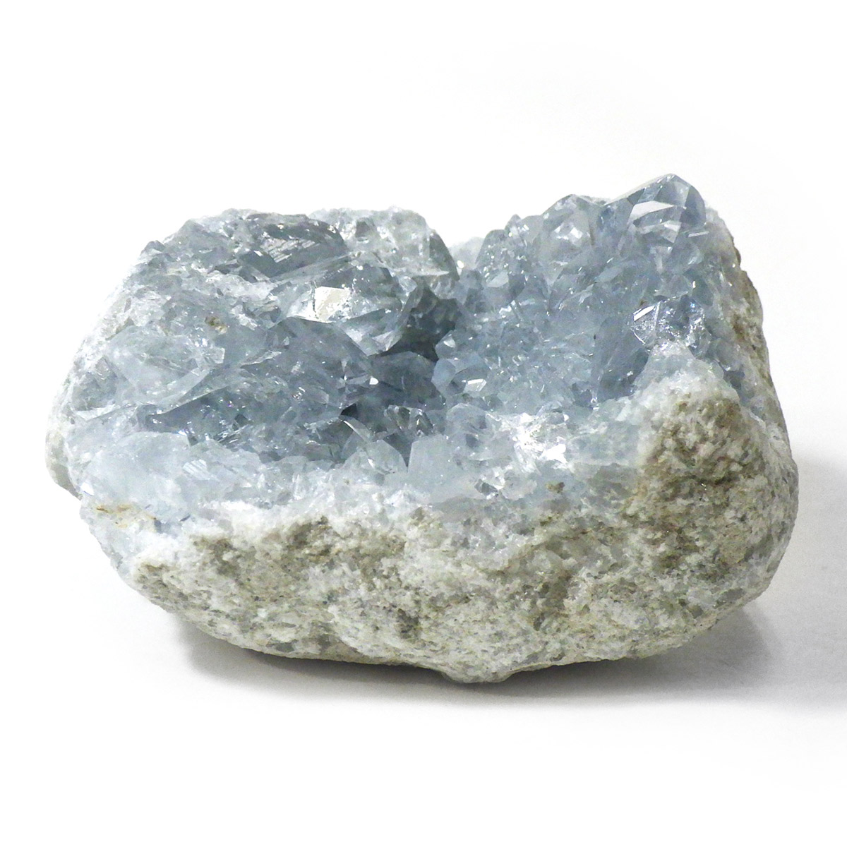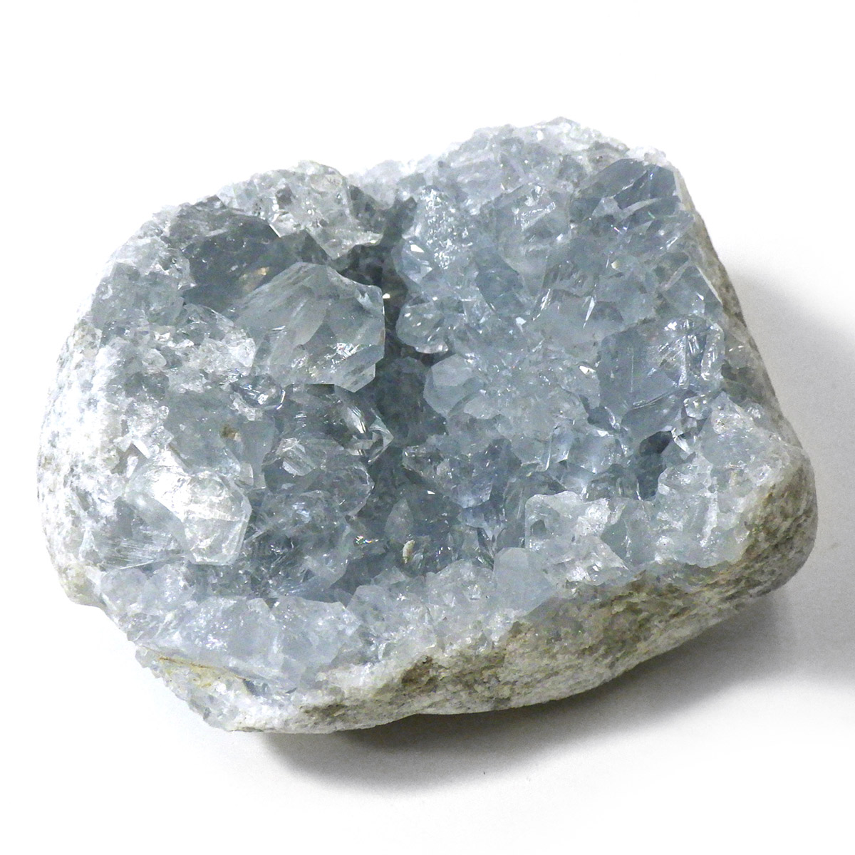 セレスタイト(天青石)母岩付きクラスターです。マダガスカル産のものは、母岩が丸みを帯びており、土台が白っぽいのが特徴です。 丸みを帯びた可愛いフォルムで、非常に高い透明度で濃いブルーの結晶は美しく魅力的です。
