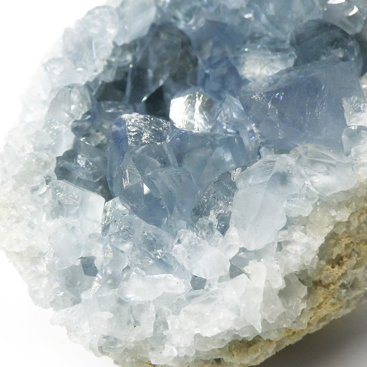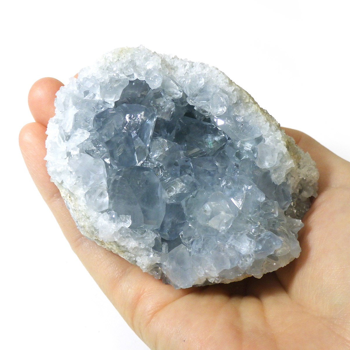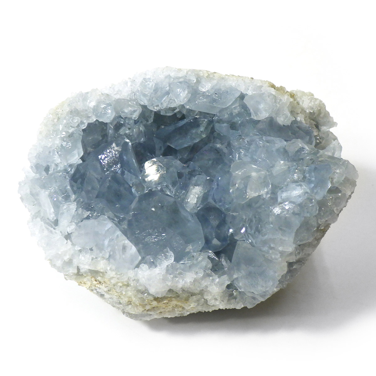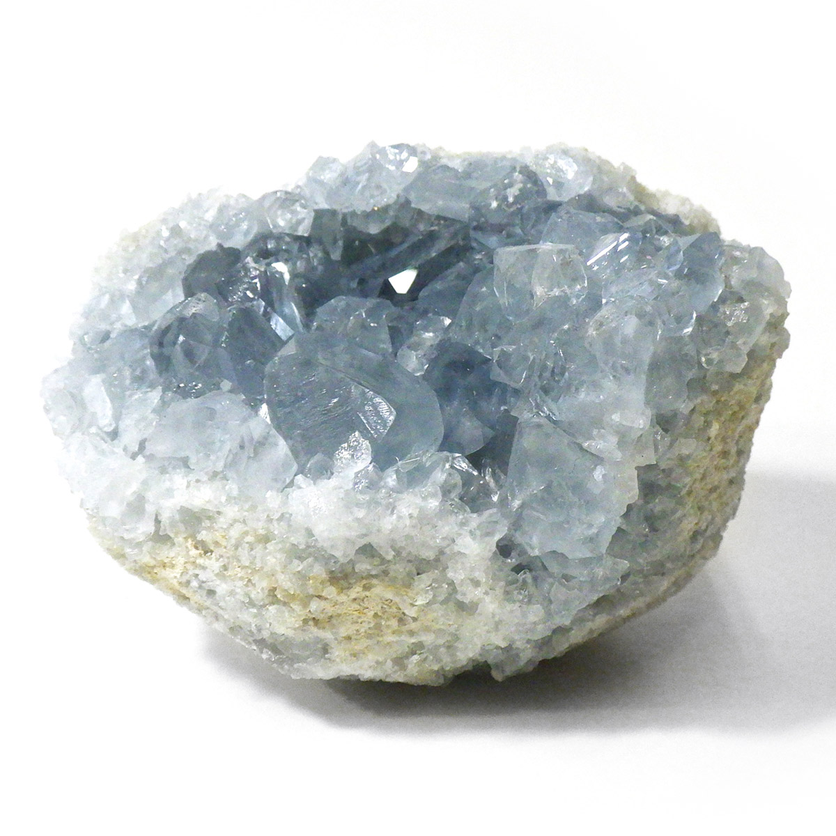 セレスタイト(天青石)母岩付きクラスターです。マダガスカル産のものは、母岩が丸みを帯びており、土台が白っぽいのが特徴です。 ころんとしたフォルムで、透明感あるブルーの結晶は非常に魅力的です。