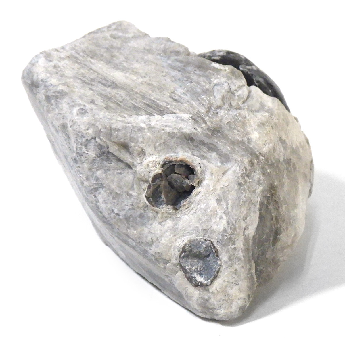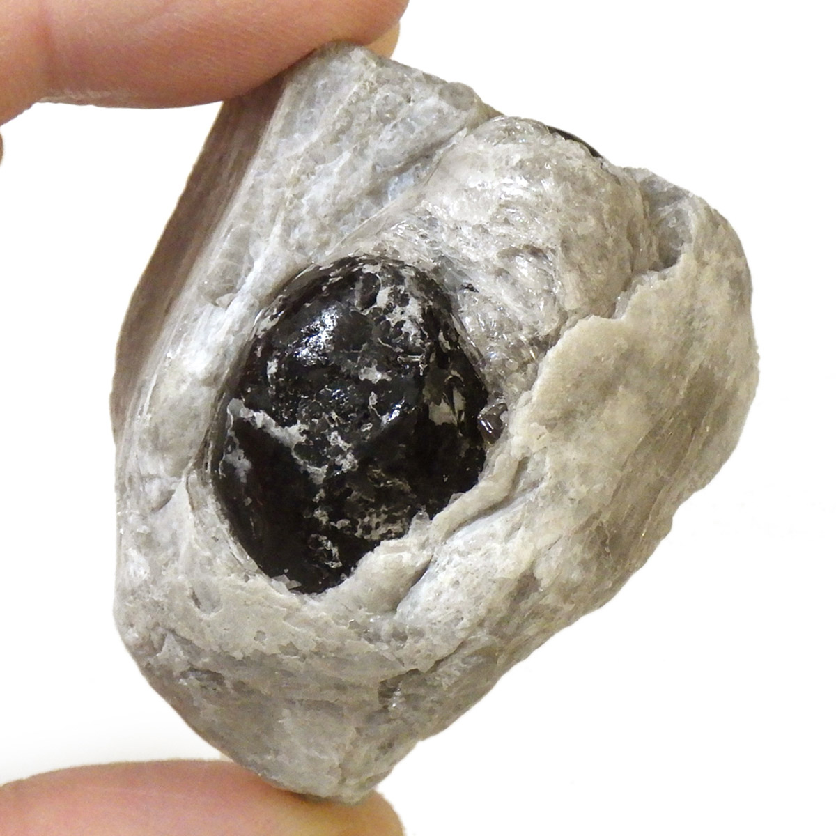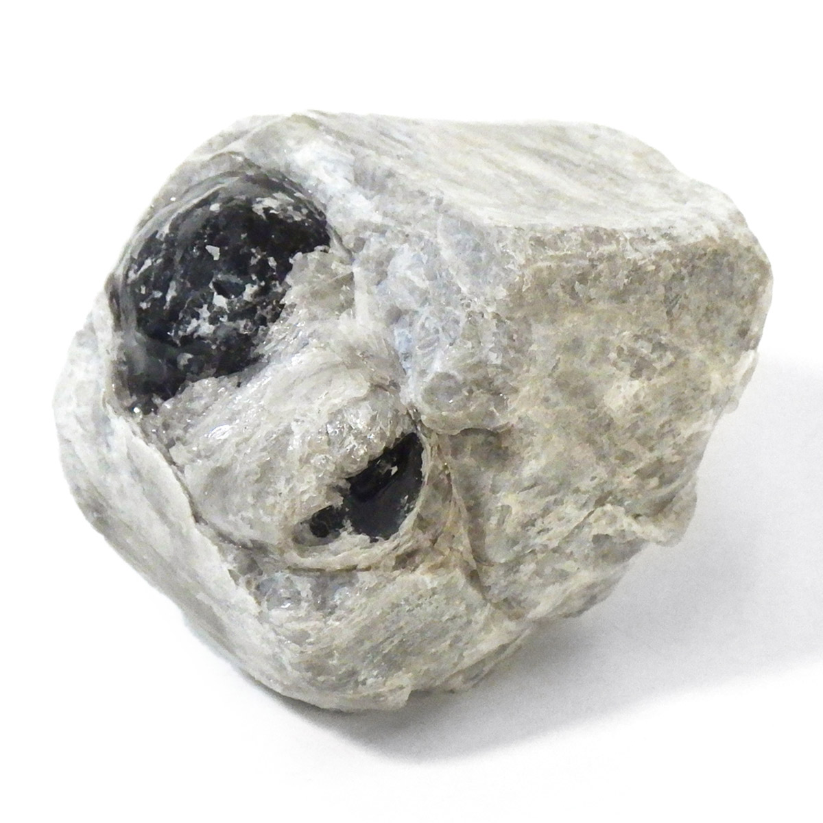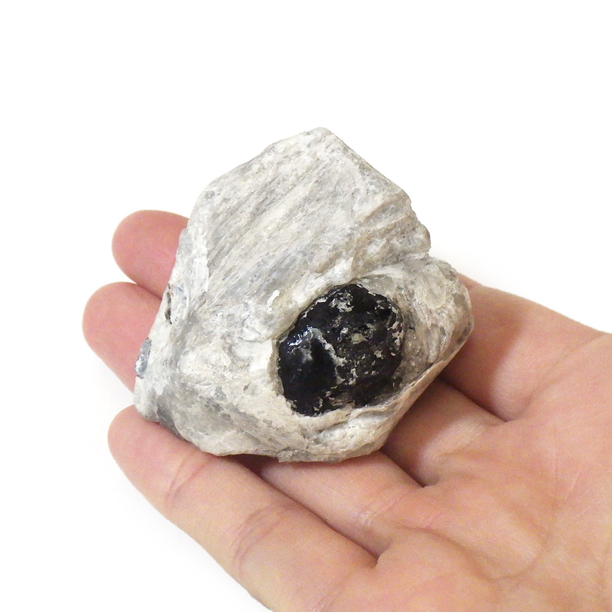 アメリカ・アリゾナ州産のアパッチティアーズ原石です。アパッチティアーズはオブシディアンの一種ですが、通常のオブシディアンとは違い、粘性度の高い溶岩が急速に冷えてつくられる白い真珠岩に埋もれていて、砕くとドロップの形状で産出されます。オブシディアンは天然のガラスで、溶岩が地表付近で急速に冷えて、ガラス質になったものです。そのオブシディアンの中でも、アメリカのアリゾナ州やニューメキシコ州で見つかるものをアパッチティアーズと呼んでいます。アパッチとは、アメリカの先住民族であるネイティブ・アメリカンの部族の名前です。先住民族であるネイティブアメリカンのアパッチ族がヨーロッパの移民との戦争で聖地を追われ、多くの生命が奪われたり、奴隷にされたりした悲しみの黒い涙が地中で固まった涙の結晶と言い伝えられています。
