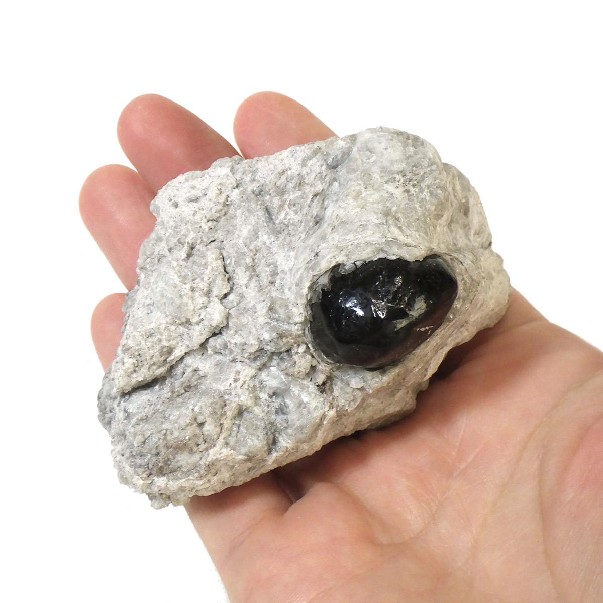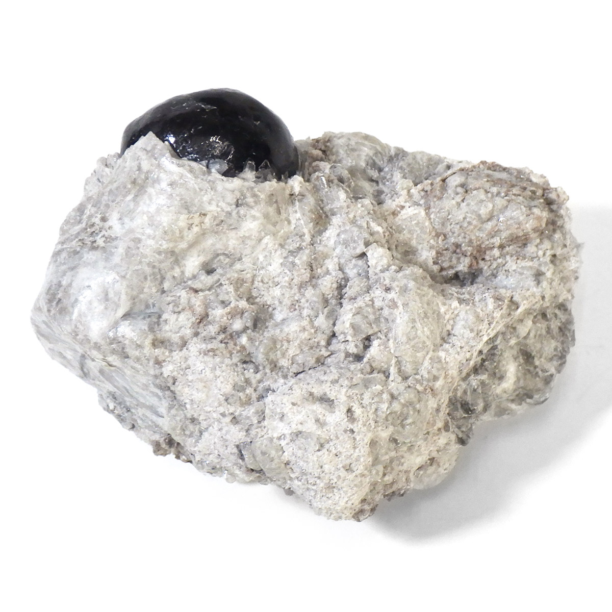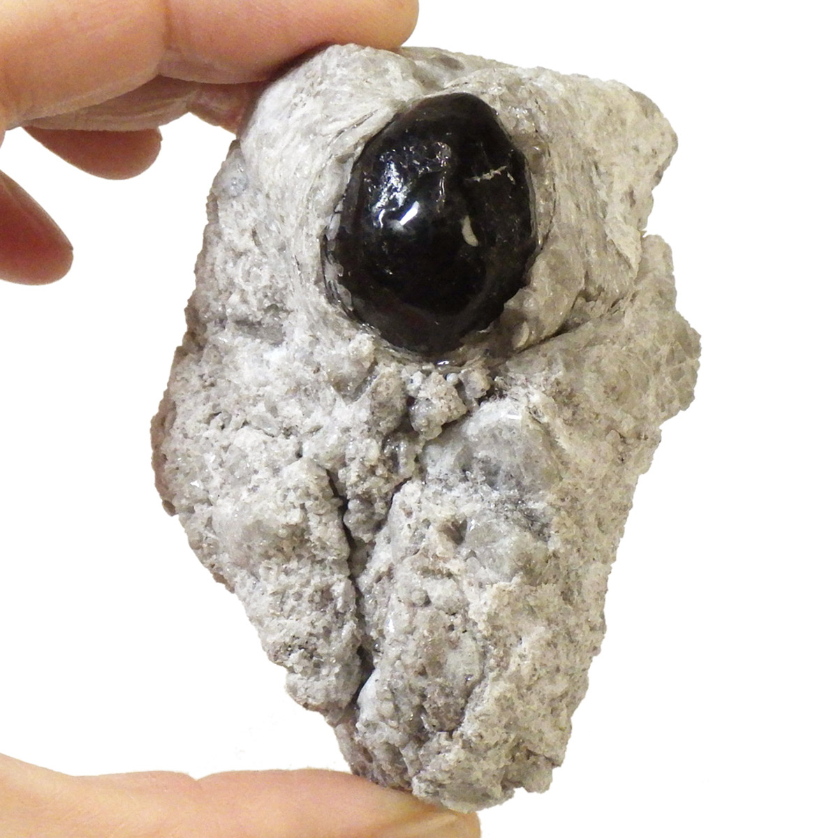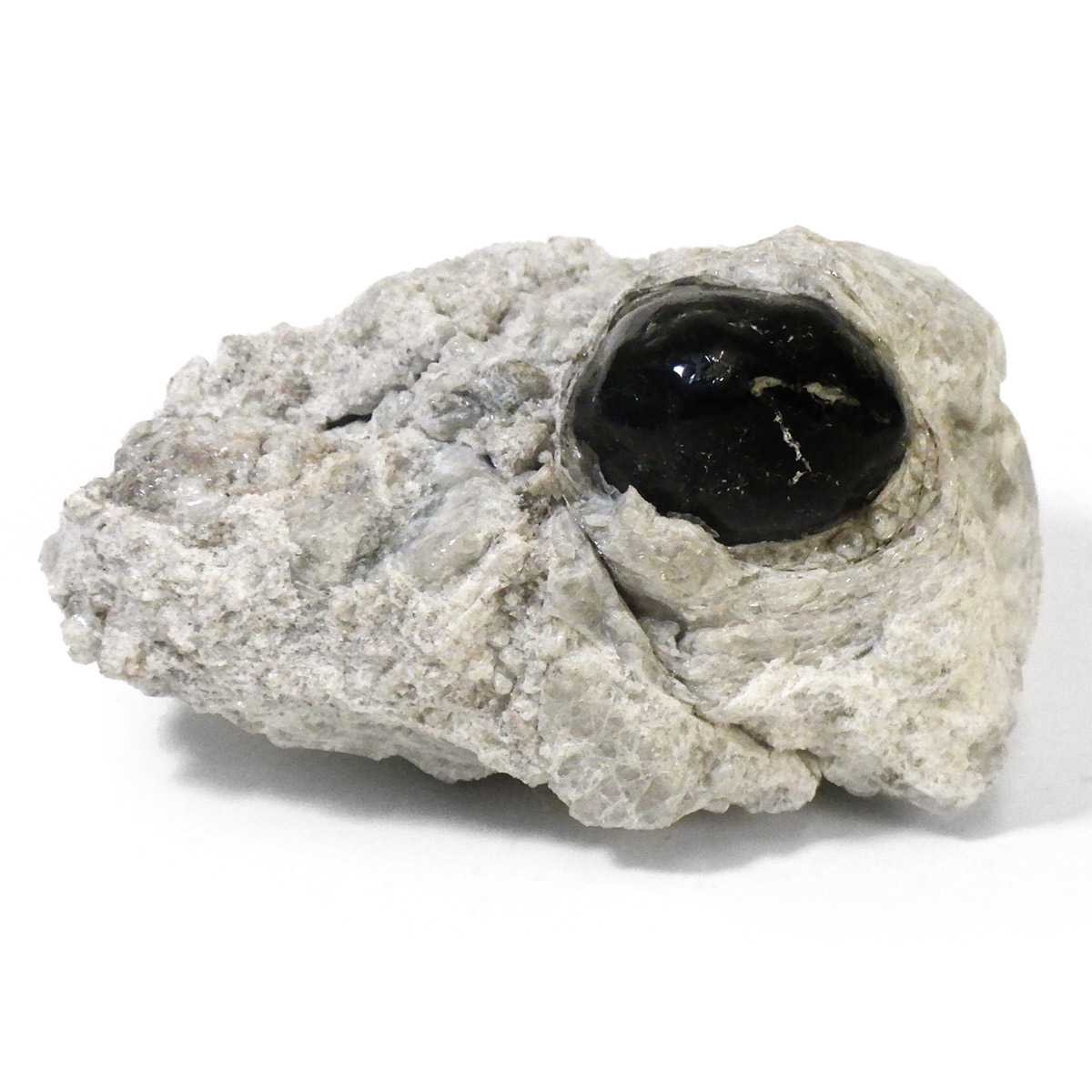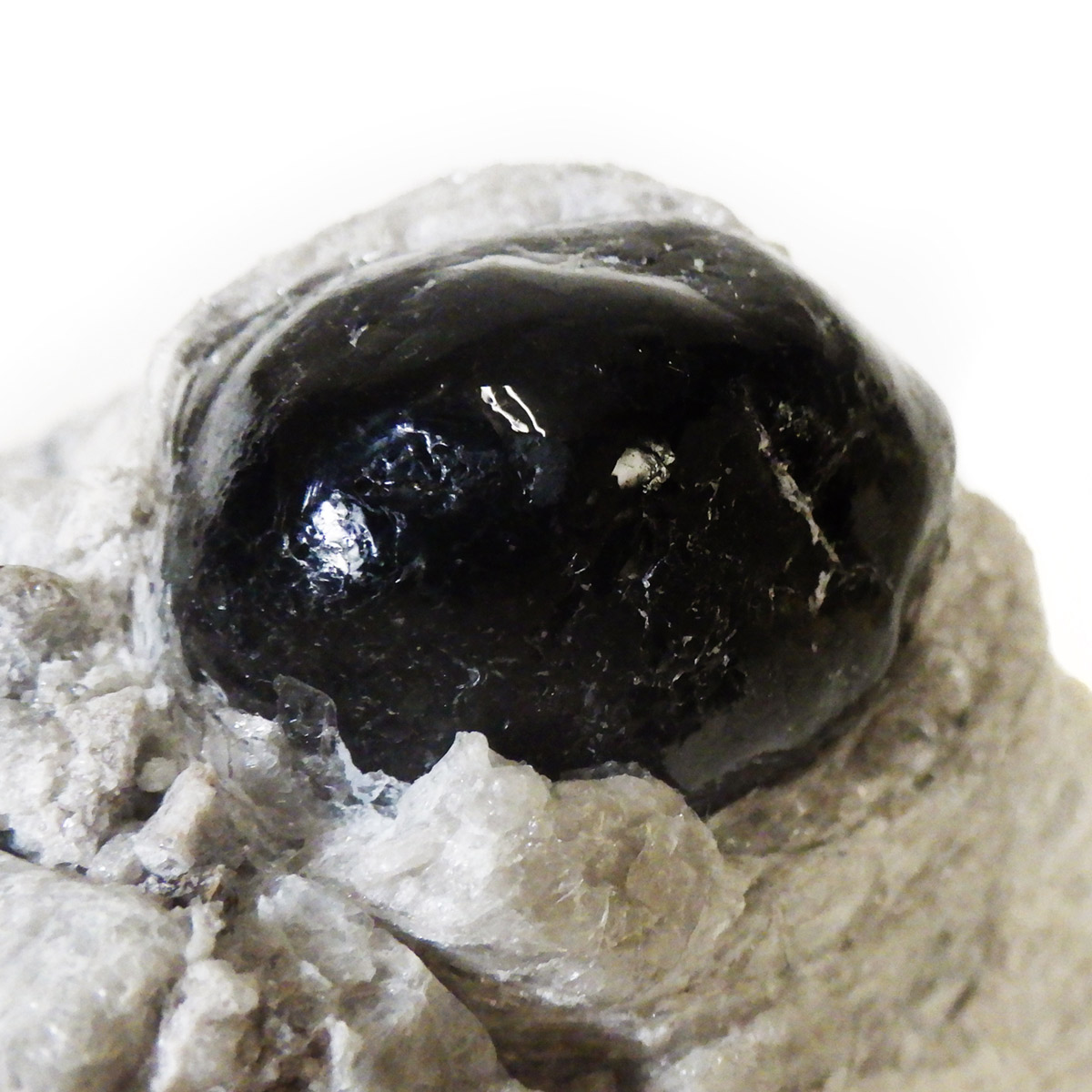 アメリカ・アリゾナ州産のアパッチティアーズ原石です。アパッチティアーズはオブシディアンの一種ですが、通常のオブシディアンとは違い、粘性度の高い溶岩が急速に冷えてつくられる白い真珠岩に埋もれていて、砕くとドロップの形状で産出されます。オブシディアンは天然のガラスで、溶岩が地表付近で急速に冷えて、ガラス質になったものです。そのオブシディアンの中でも、アメリカのアリゾナ州やニューメキシコ州で見つかるものをアパッチティアーズと呼んでいます。アパッチとは、アメリカの先住民族であるネイティブ・アメリカンの部族の名前です。先住民族であるネイティブアメリカンのアパッチ族がヨーロッパの移民との戦争で聖地を追われ、多くの生命が奪われたり、奴隷にされたりした悲しみの黒い涙が地中で固まった涙の結晶と言い伝えられています。