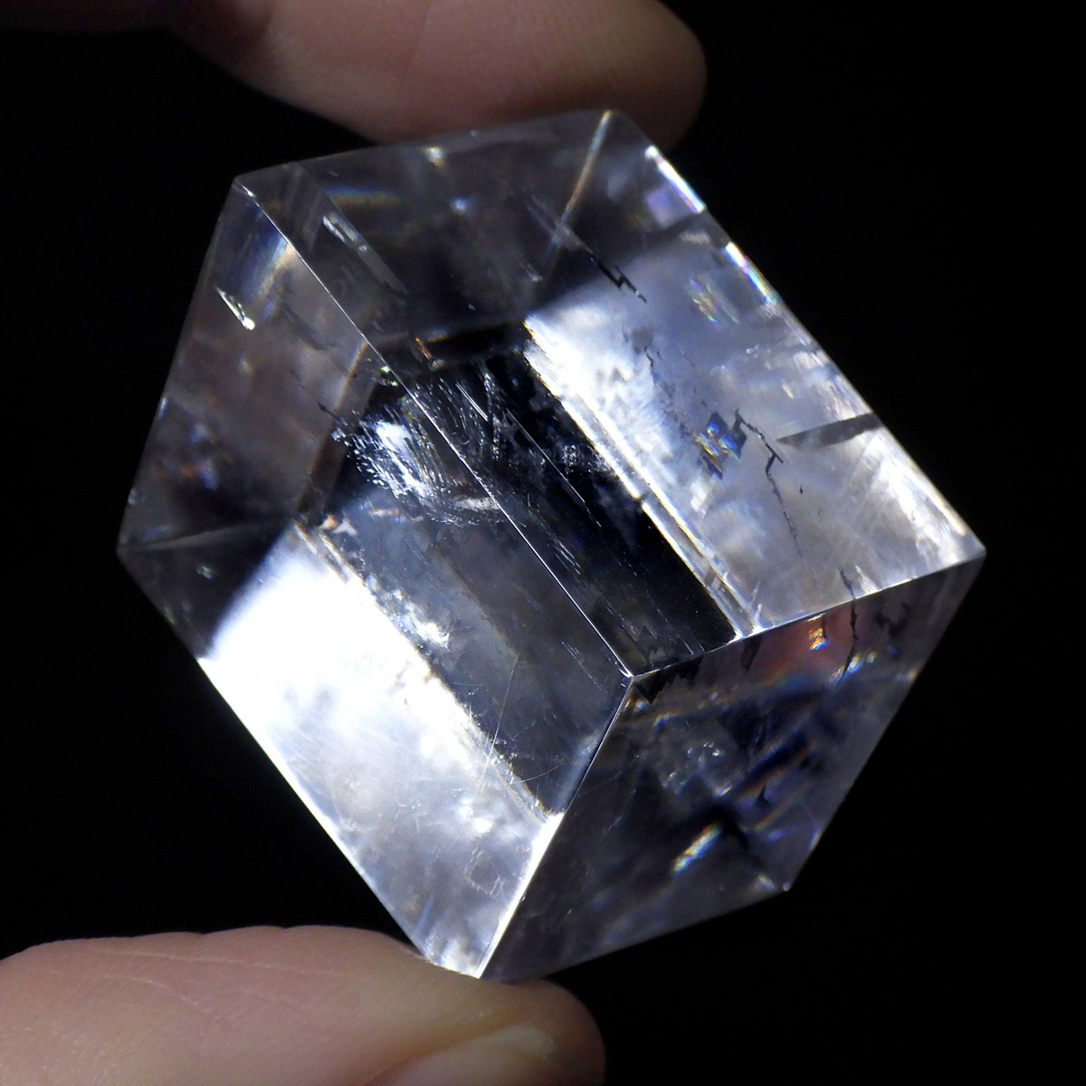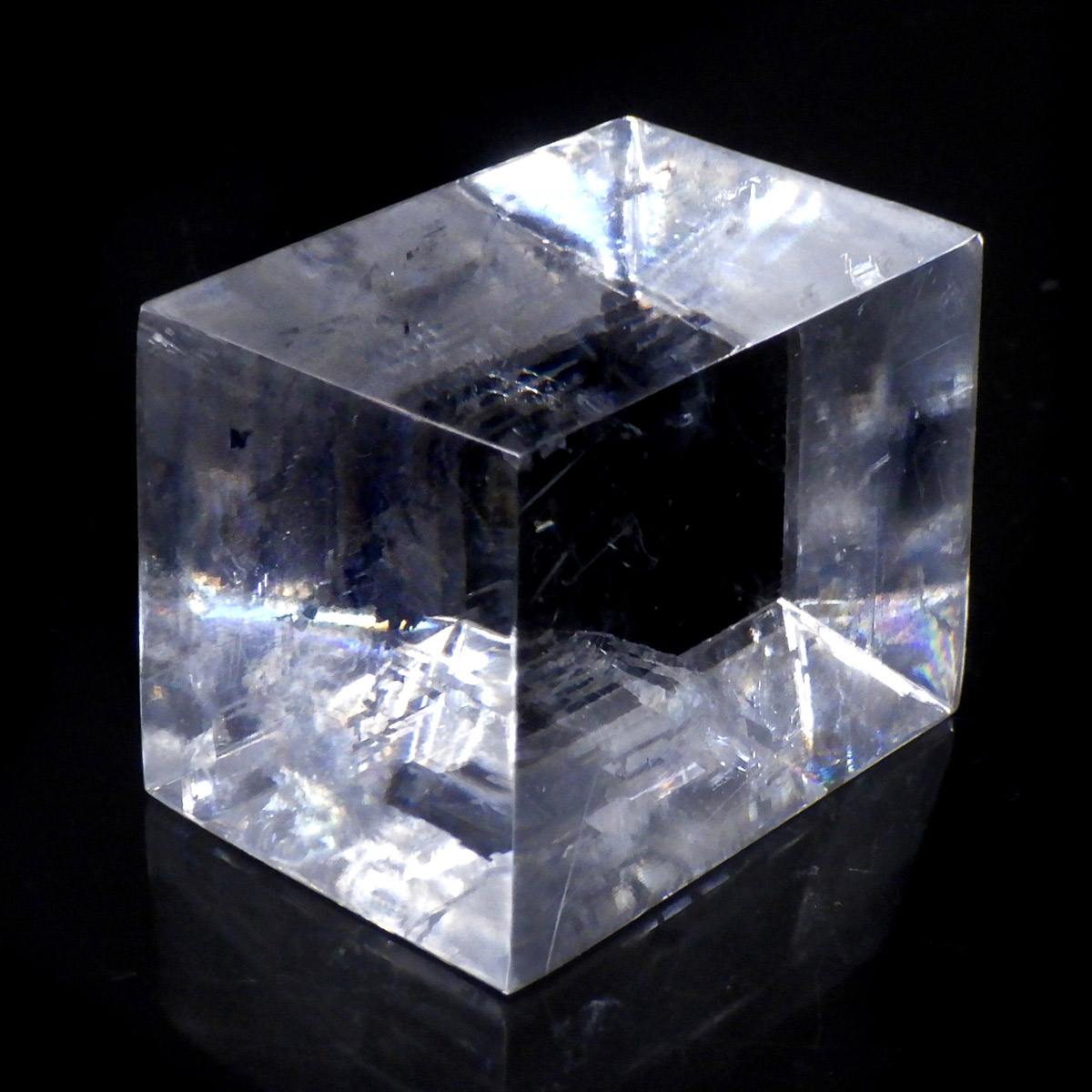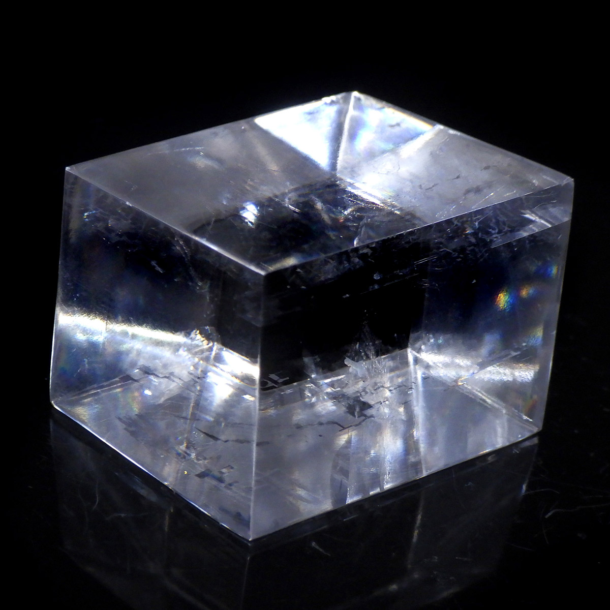 マダガスカル産のオプティカルカルサイトです。無色透明で良質のカルサイトのことをオプティカルカルサイトと呼びます。高い透明度を持ち、様々な角度からレインボーを見ることができます。複屈折という光学現象を持ち、文字の上に載せると二つにダブって見える「ダブリング(二重像現象)」のような現象を起こします。一定方向に向かって割れる劈開性によって平行四辺形の形になります。 他の産地のものよりマダガスカル産のオプティカルカルサイトはクラックが少なくきれいな印象です。