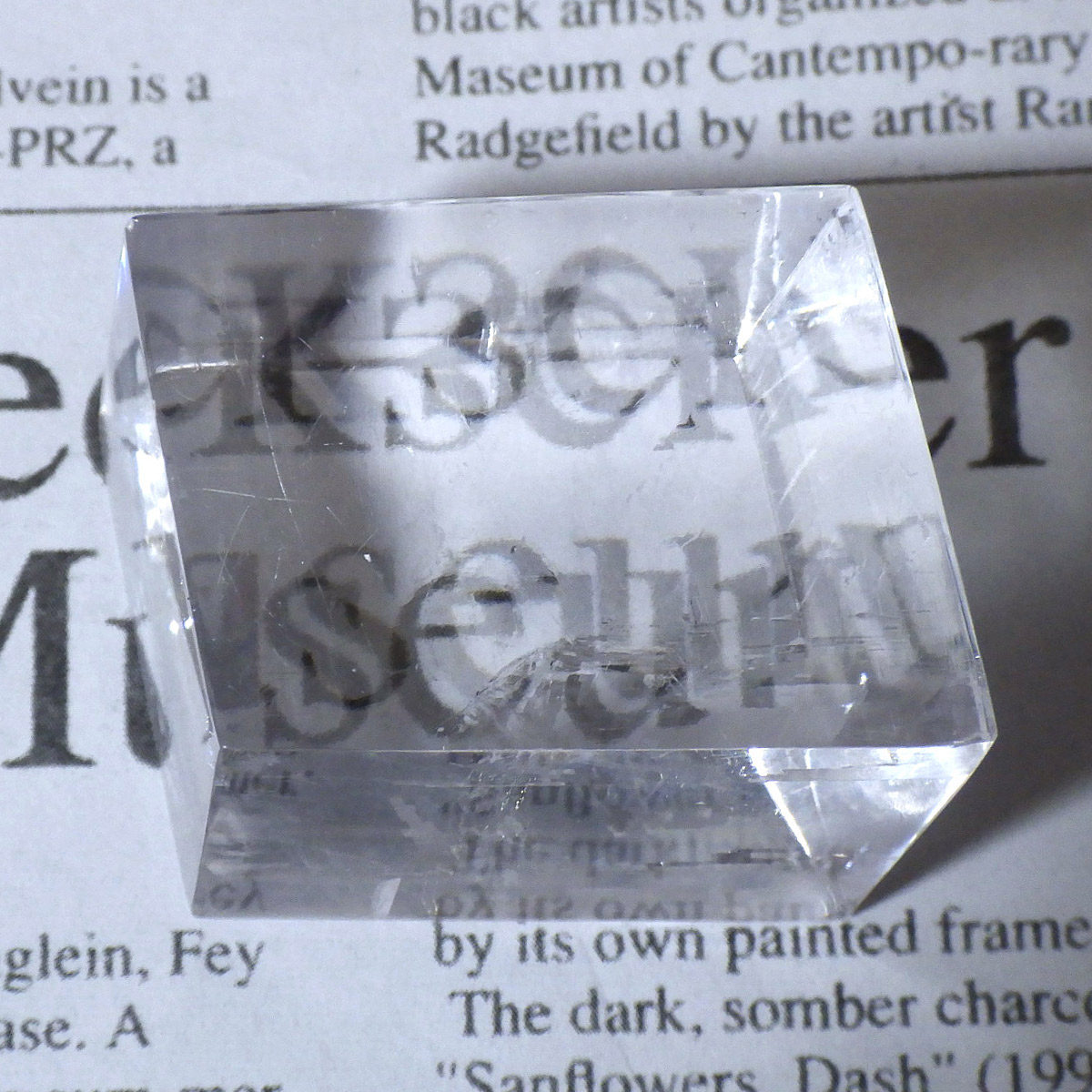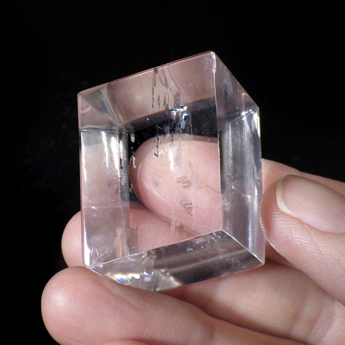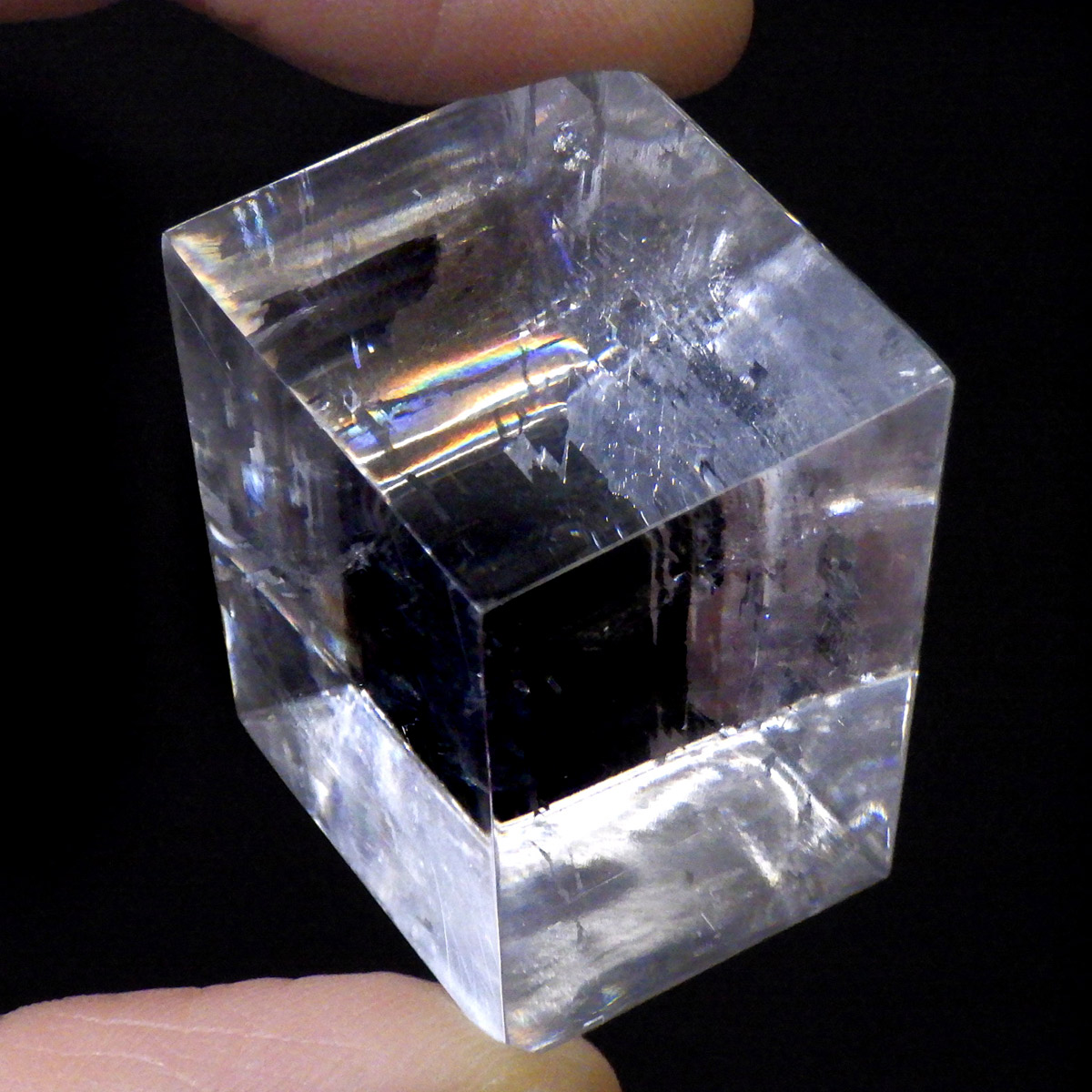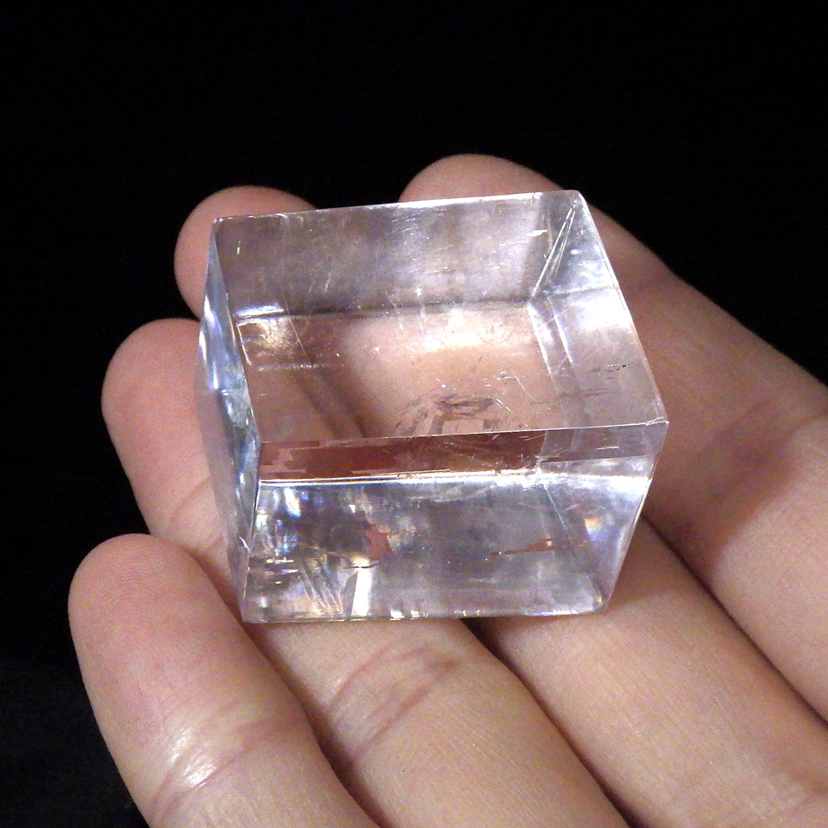 マダガスカル産のオプティカルカルサイトです。無色透明で良質のカルサイトのことをオプティカルカルサイトと呼びます。高い透明度を持ち、様々な角度からレインボーを見ることができます。複屈折という光学現象を持ち、文字の上に載せると二つにダブって見える「ダブリング(二重像現象)」のような現象を起こします。一定方向に向かって割れる劈開性によって平行四辺形の形になります。 他の産地のものよりマダガスカル産のオプティカルカルサイトはクラックが少なくきれいな印象です。