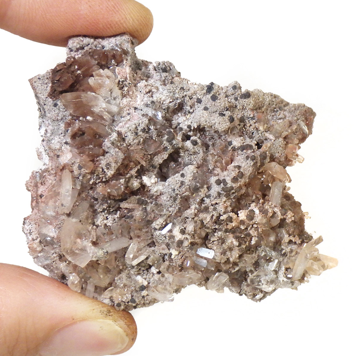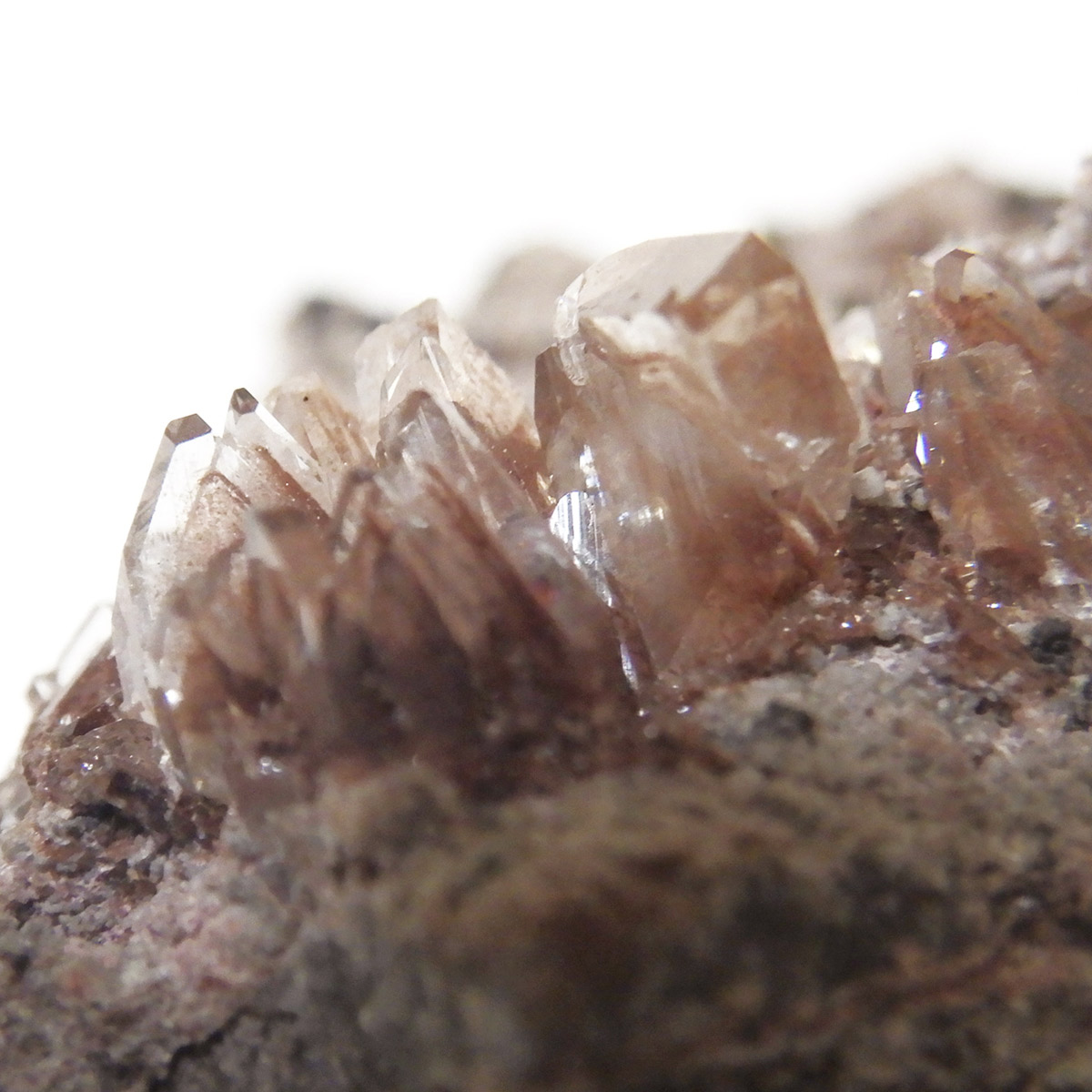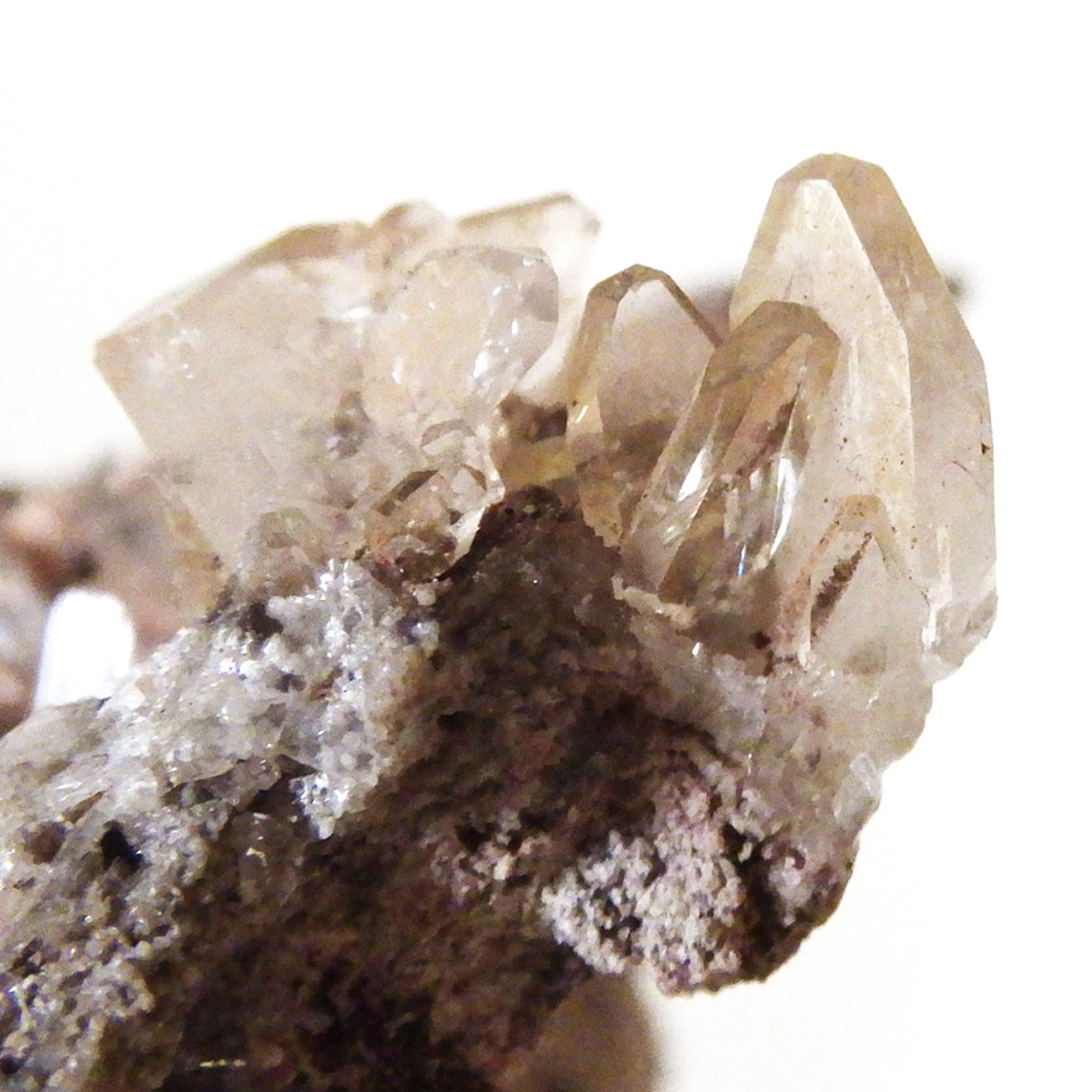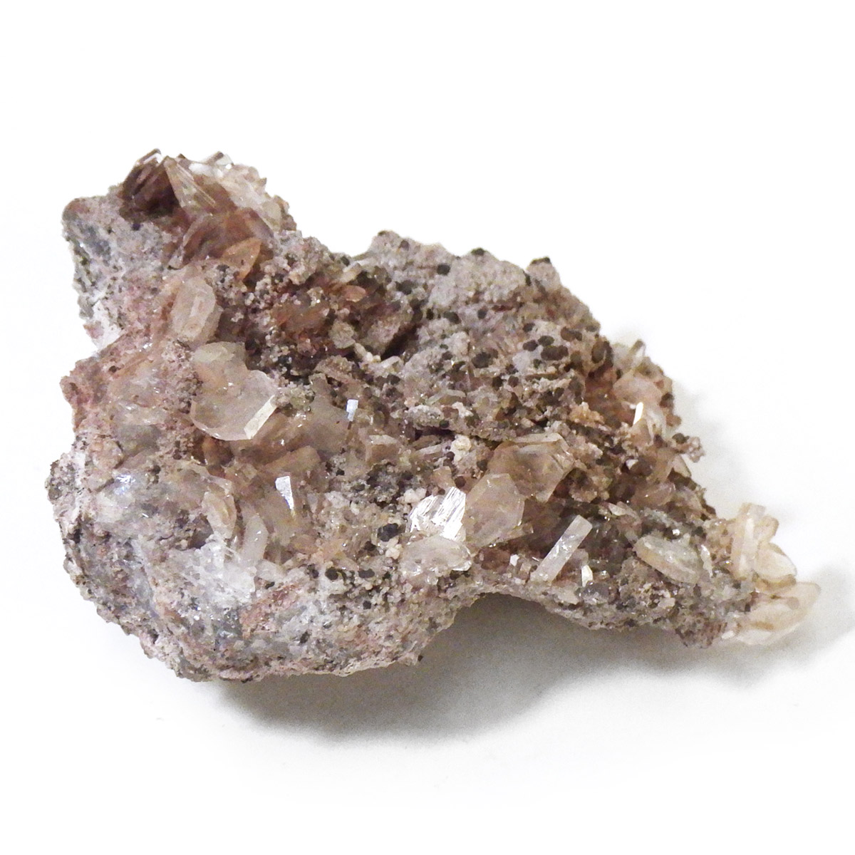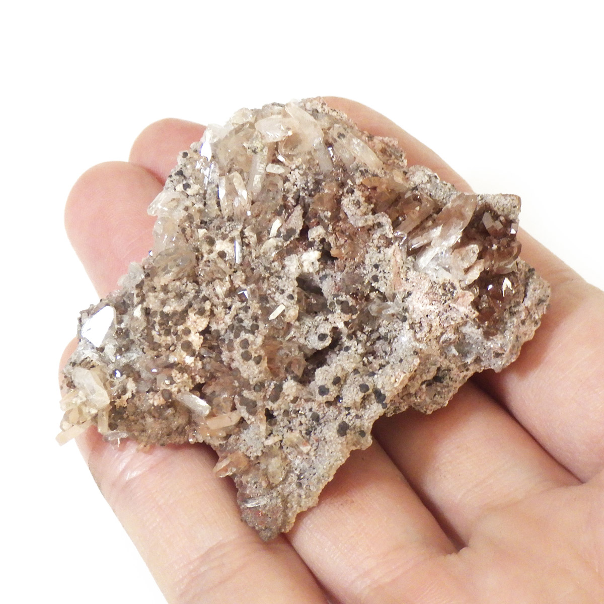 メキシコ産のヘミモルファイト原石です。和名は異極鉱。異なる形状の両端面を持つ鉱物というのが名前の由来です。このような結晶形態を持つ鉱物は少ないとされています。岩石基質の上に透明なヘミモルファイトの板状結晶の集合が見られます。透明の結晶がキラキラとかわいい表情を見せてくれます。