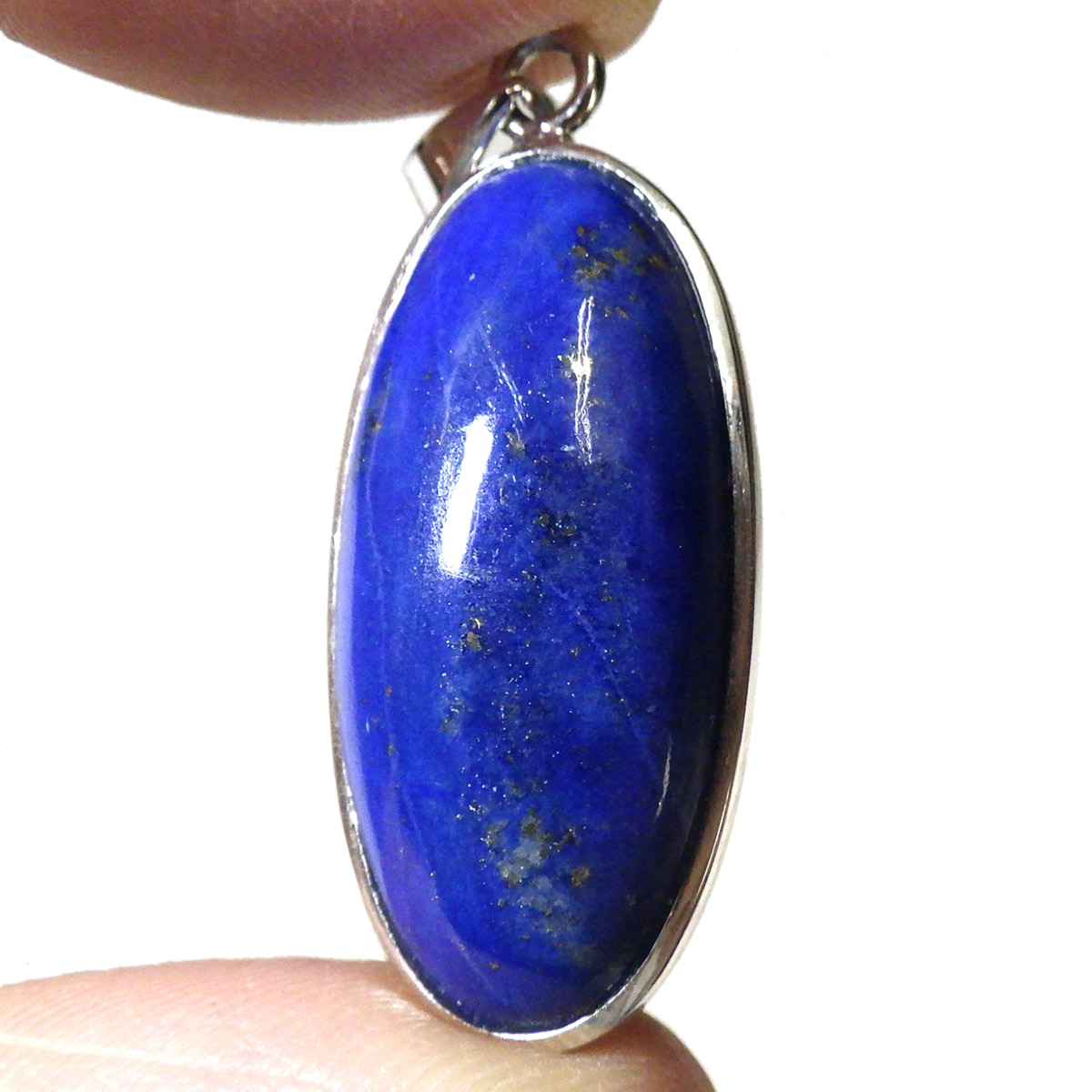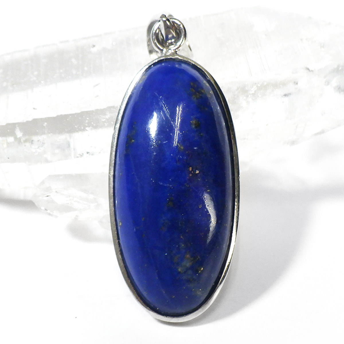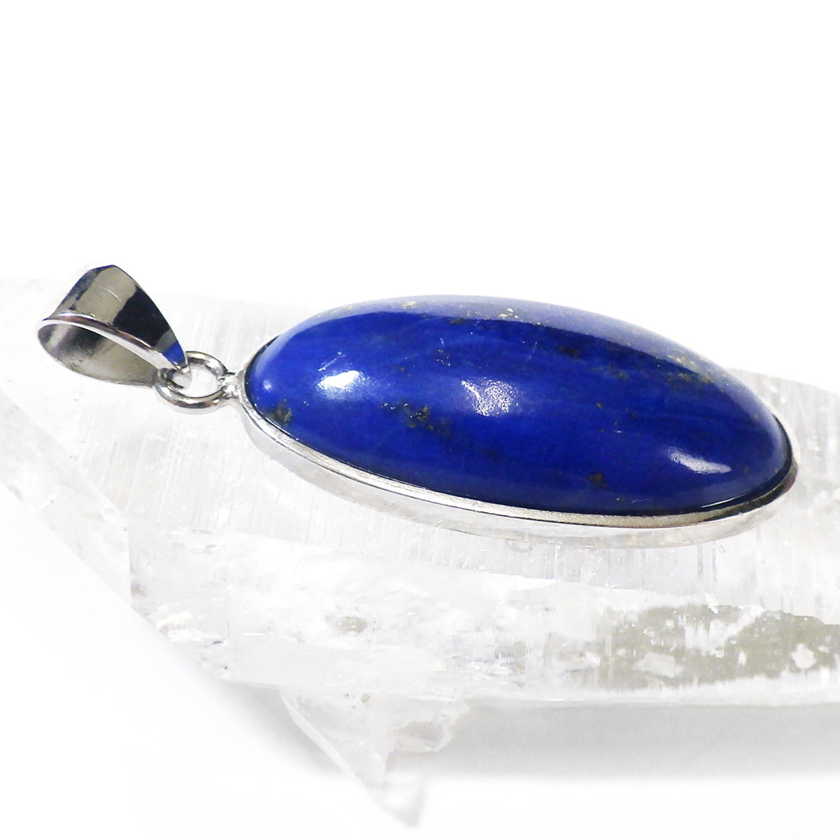 タジキスタン産のラピスラズリ、ペンダントトップです。アフガニスタンとタジキスタンなどにまたがるパミール高原から採れることからパミールラピスとも呼ばれております。形はオシャレなロングオーバル形で存在感のあるサイズ。ラピスラズリは、ラズライト・アウィン・ソーダライト・ノーゼライトが集合したものです。特に、ラズライトとノーゼライトを多く含有すると、深く美しい色彩のラピスラズリとなります。全体的に均一な色彩のものは少ないのですが、特に良い面をペンダントトップの表面にくるように加工しております。これぞラピスラズリというようなウルトラマリンブルーの品質の良いスペシャルピースのペンダントトップです。