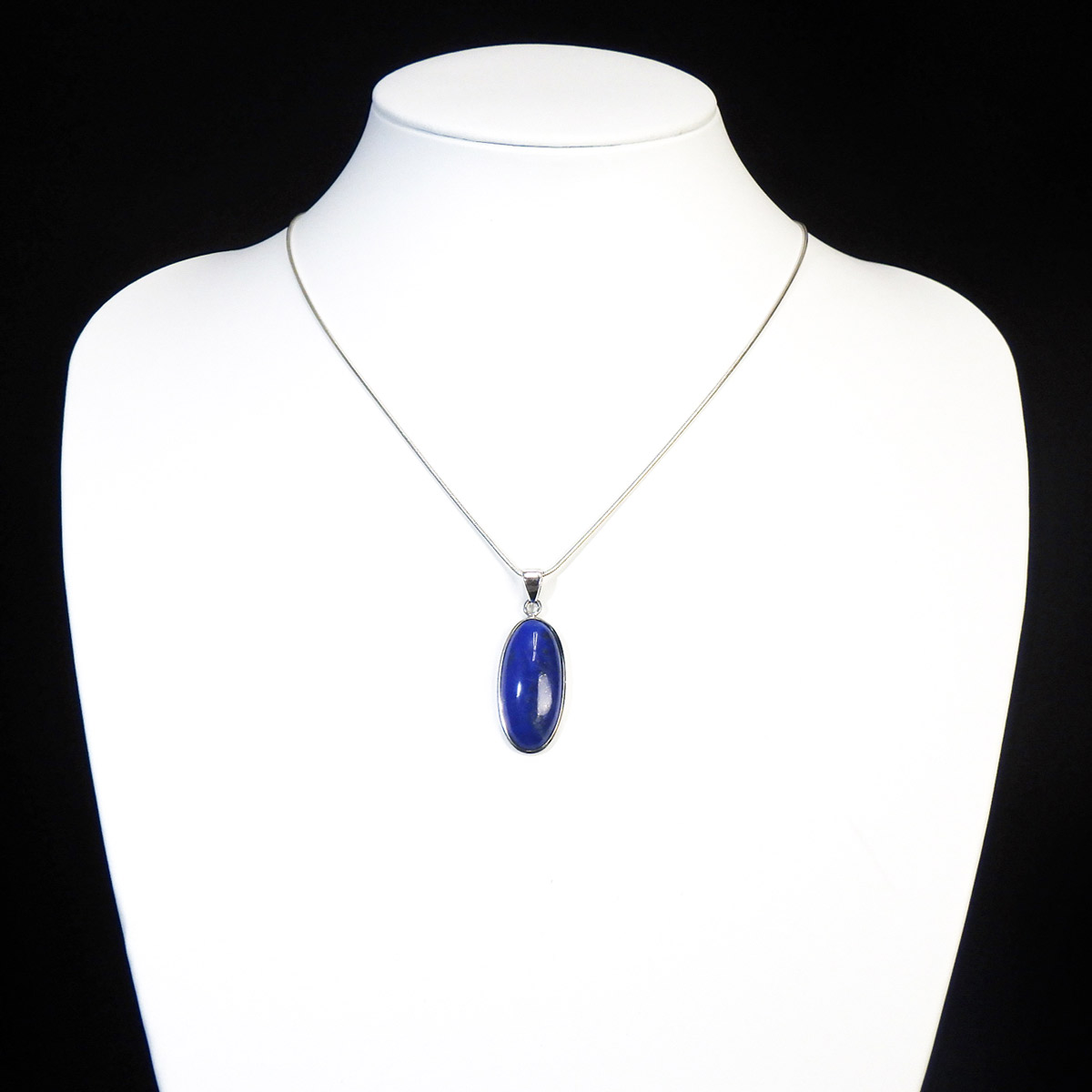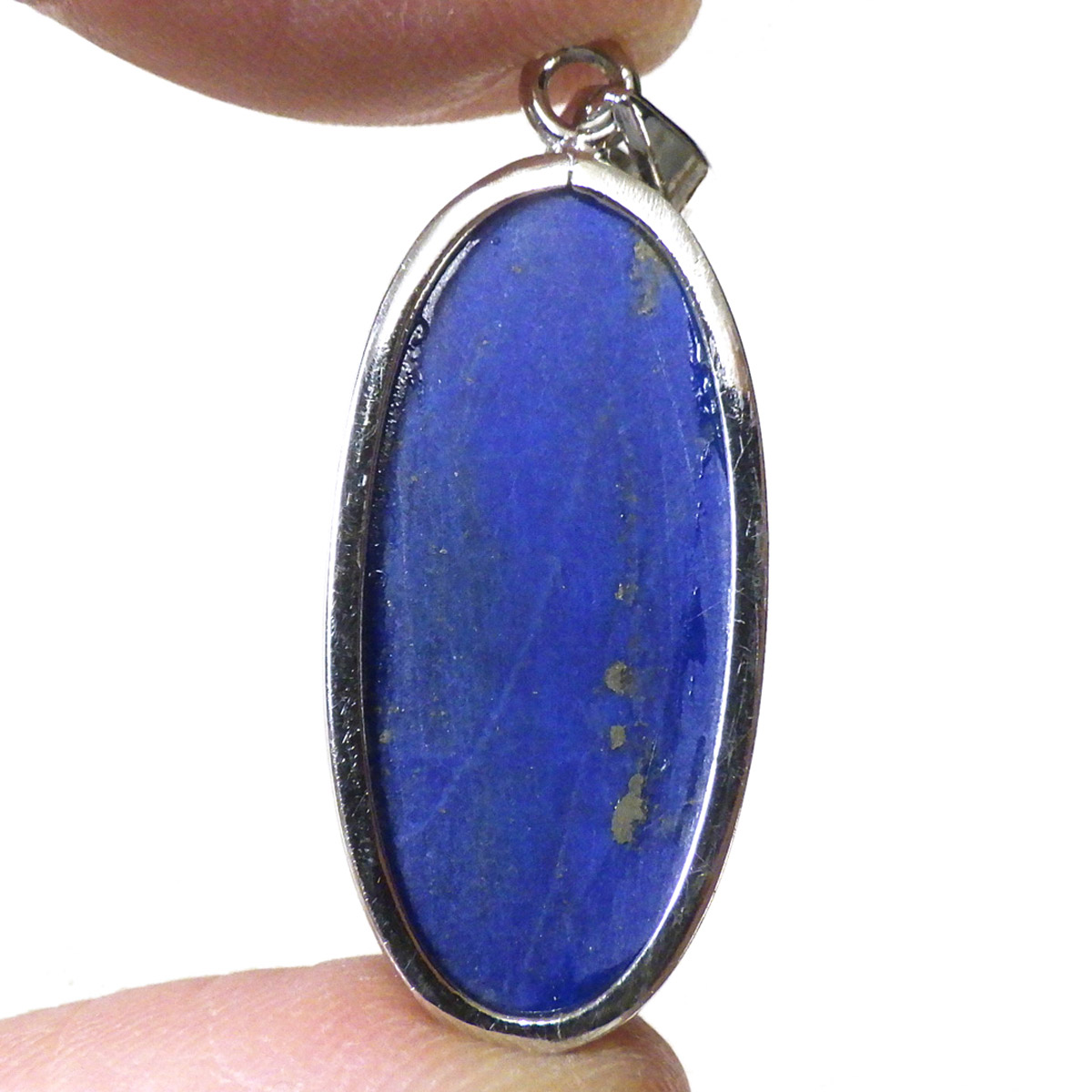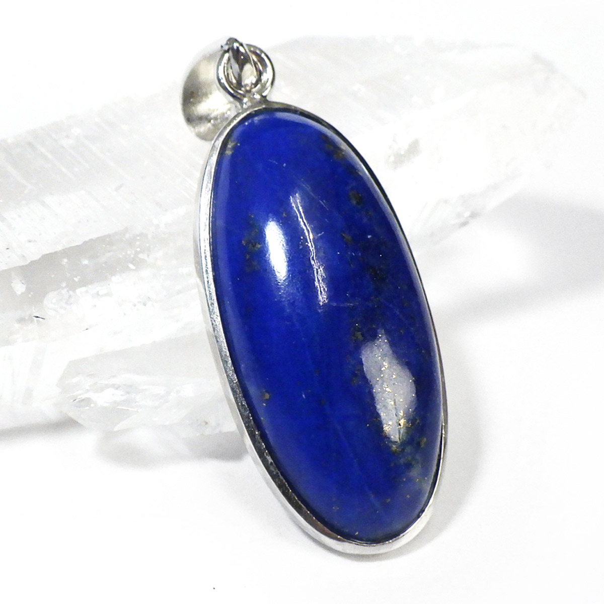 タジキスタン産のラピスラズリ、ペンダントトップです。アフガニスタンとタジキスタンなどにまたがるパミール高原から採れることからパミールラピスとも呼ばれております。形はオシャレなロングオーバル形で存在感のあるサイズ。ラピスラズリは、ラズライト・アウィン・ソーダライト・ノーゼライトが集合したものです。特に、ラズライトとノーゼライトを多く含有すると、深く美しい色彩のラピスラズリとなります。全体的に均一な色彩のものは少ないのですが、特に良い面をペンダントトップの表面にくるように加工しております。これぞラピスラズリというようなウルトラマリンブルーの品質の良いスペシャルピースのペンダントトップです。