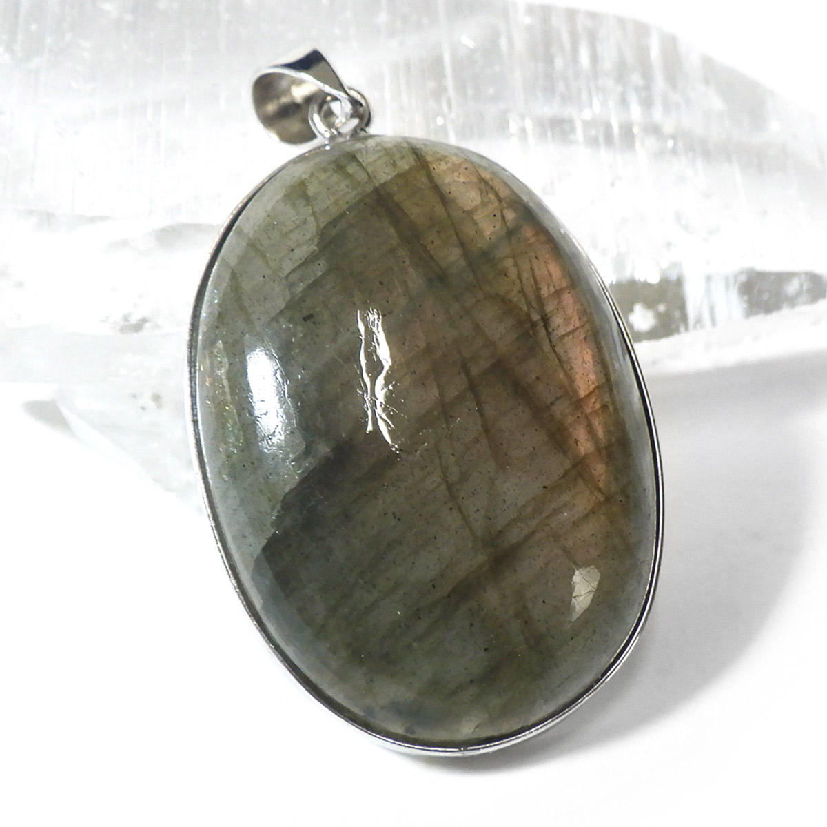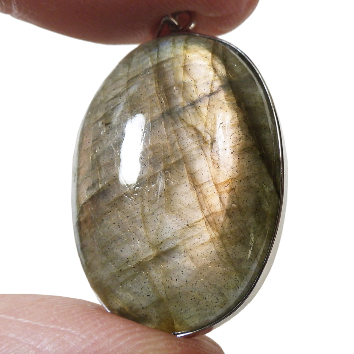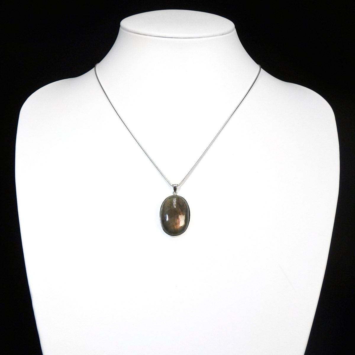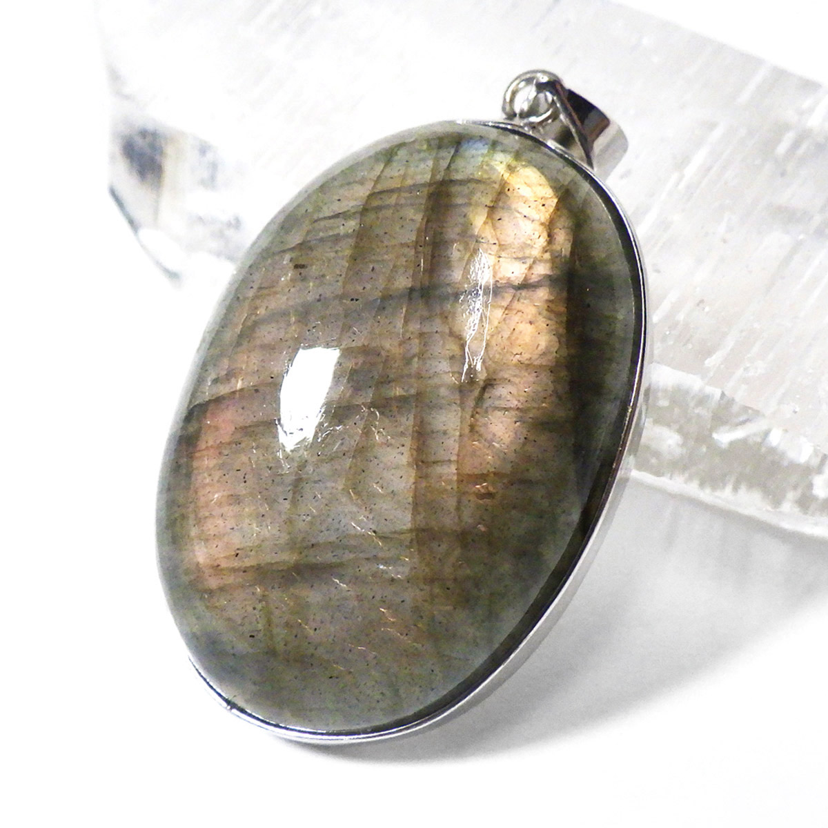 マダガスカル産ラブラドライトのペンダントトップです。イエローオレンジ系のラブラドレッセンスが見られます。よく見ると小さな内包物が星のようにキラキラと見られ、全体としてラブラドライトの大きな深みを感じます。光に透かしても面白いです。石の加工はオーバル形に艶やかな研磨を施しております。どの角度から見てもラブラドレッセンスがしっかりと輝き、表情の移り変わりが楽しいペンダントトップです。