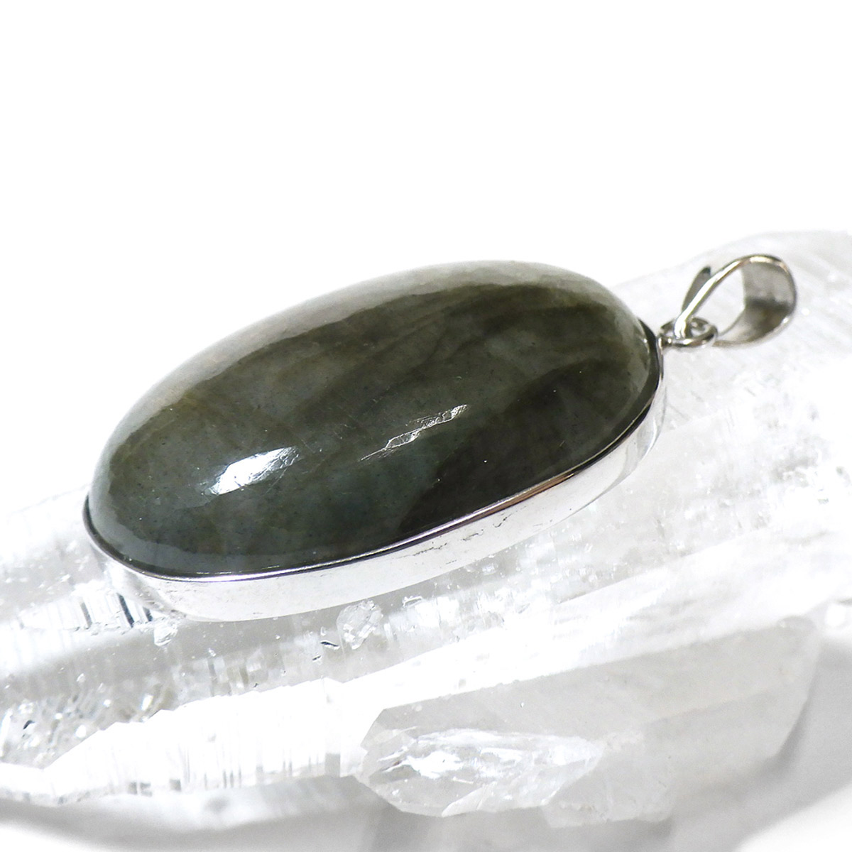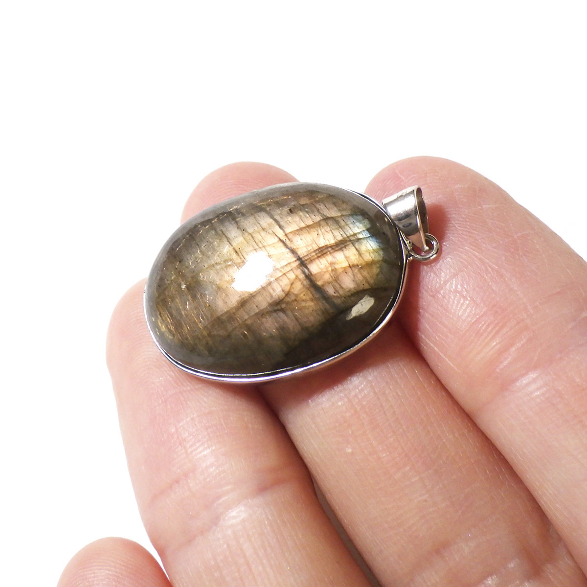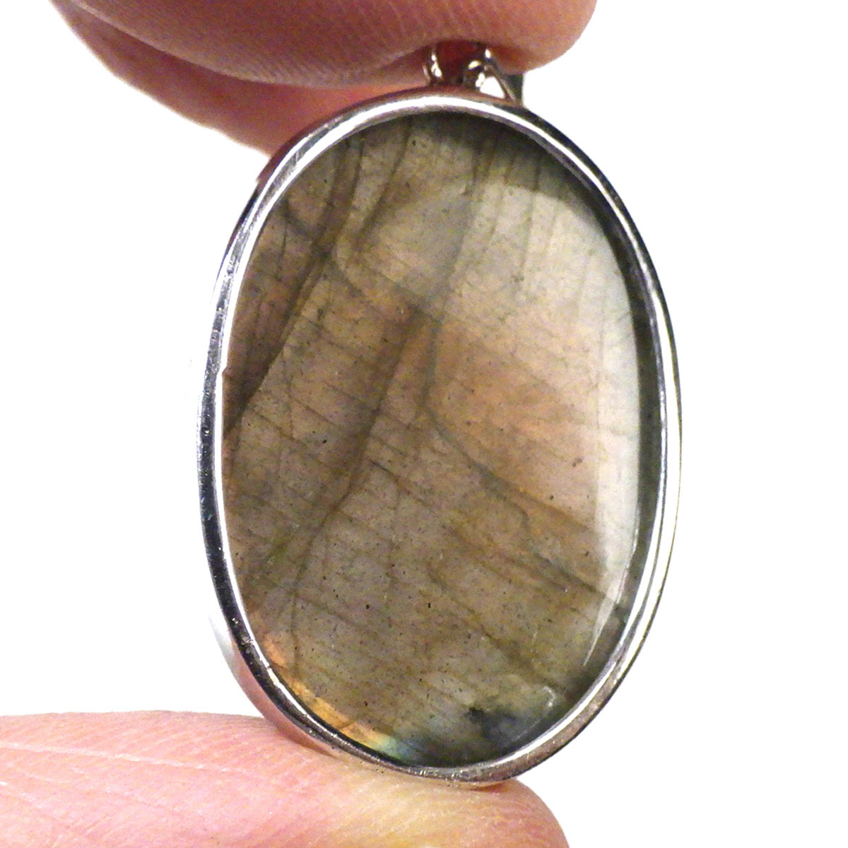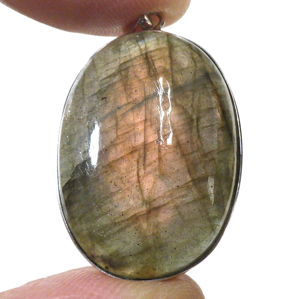 マダガスカル産ラブラドライトのペンダントトップです。イエローオレンジ系のラブラドレッセンスが見られます。よく見ると小さな内包物が星のようにキラキラと見られ、全体としてラブラドライトの大きな深みを感じます。光に透かしても面白いです。石の加工はオーバル形に艶やかな研磨を施しております。どの角度から見てもラブラドレッセンスがしっかりと輝き、表情の移り変わりが楽しいペンダントトップです。