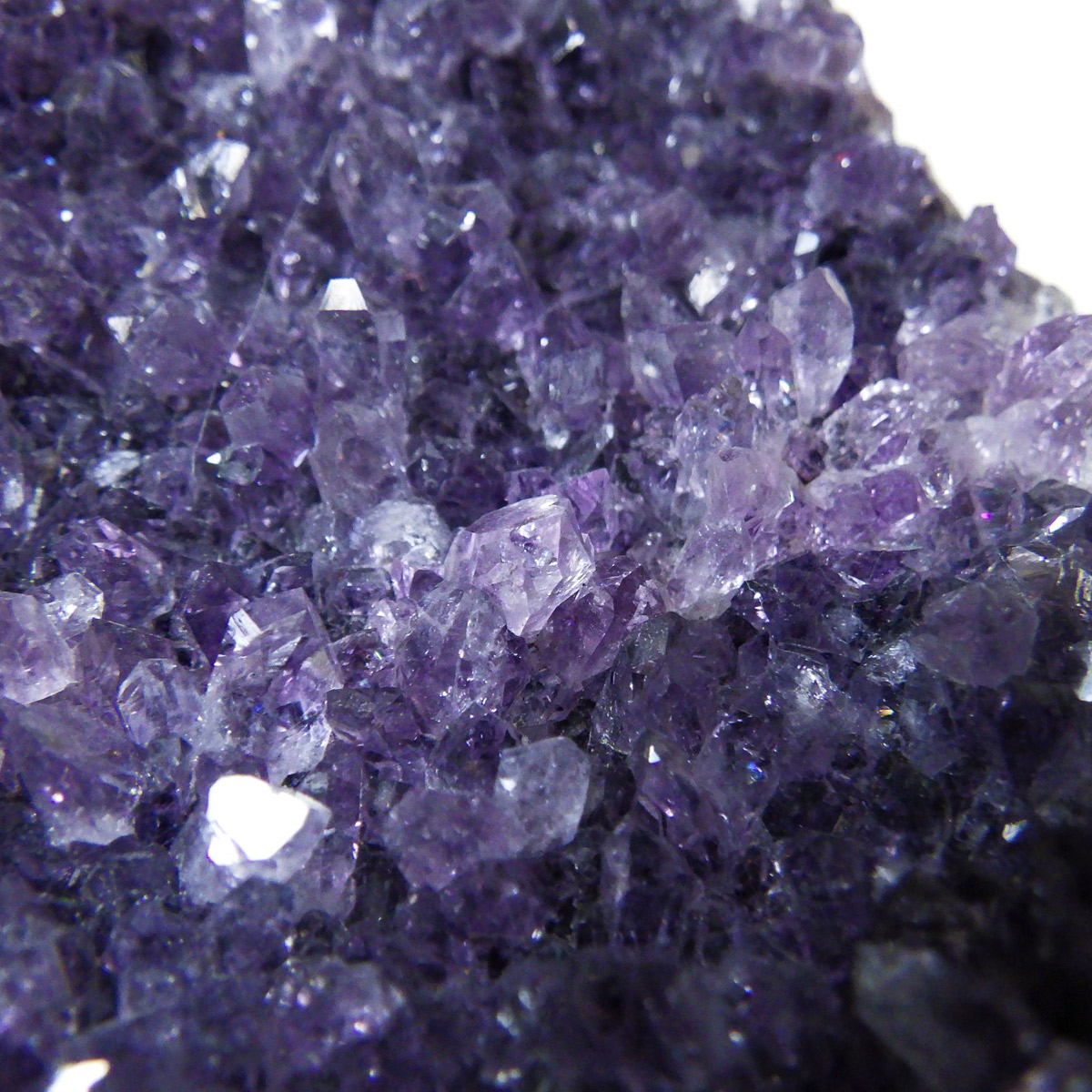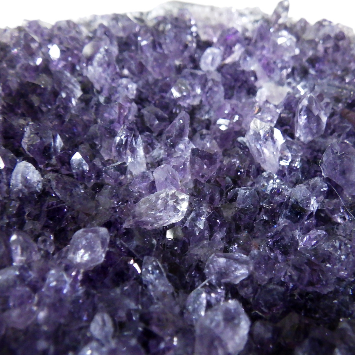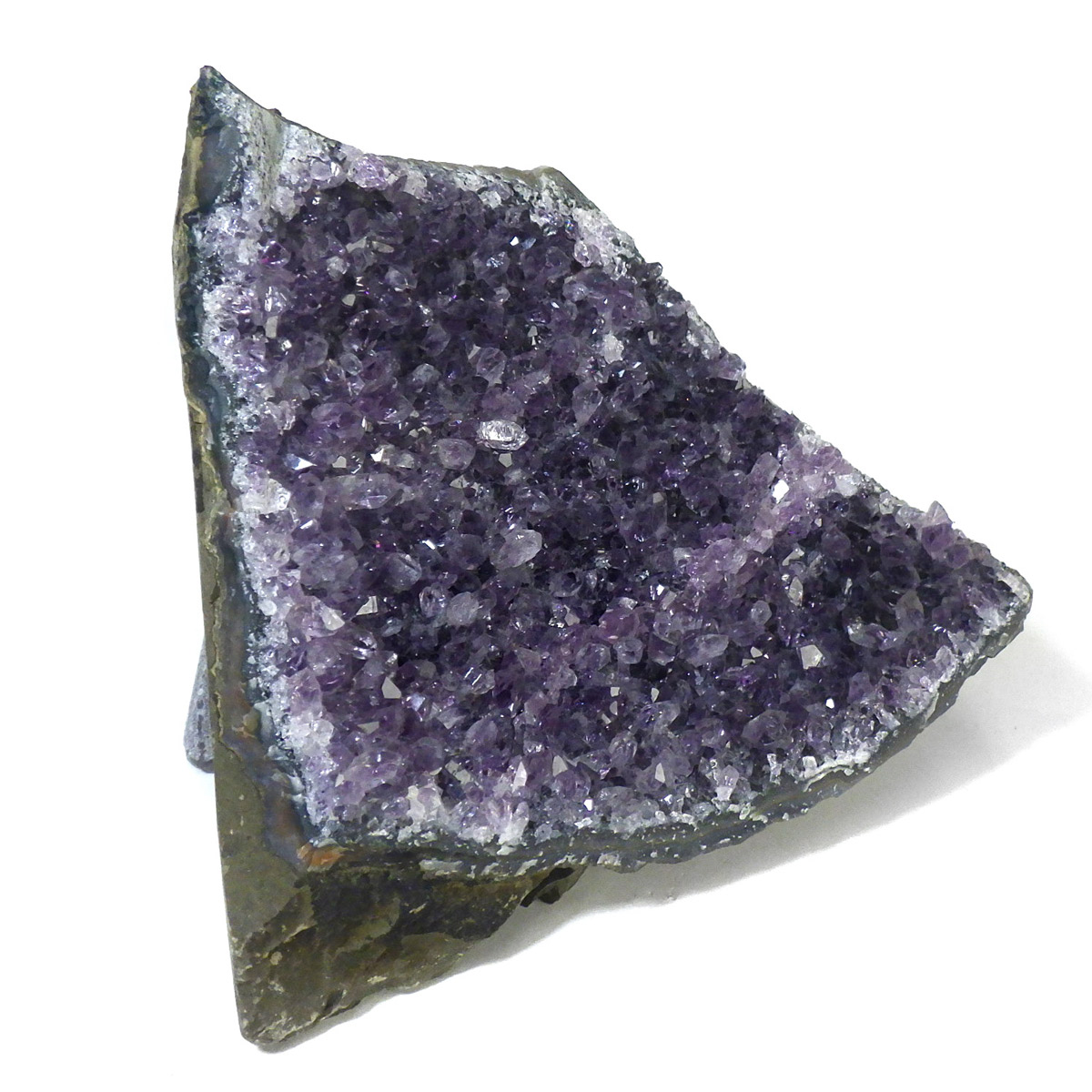 ウルグアイ産のアメジストクラスターです。一つ一つの結晶が細かく光の反射で美しくキラキラと輝きます。良質なアメジストの証である紫の色がしっかりと入っていて、座りがよいので安定感があります。