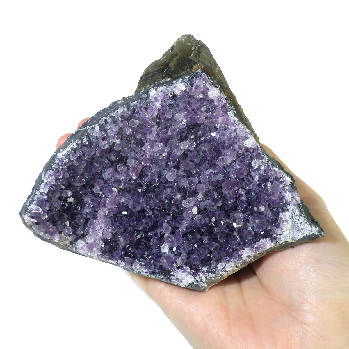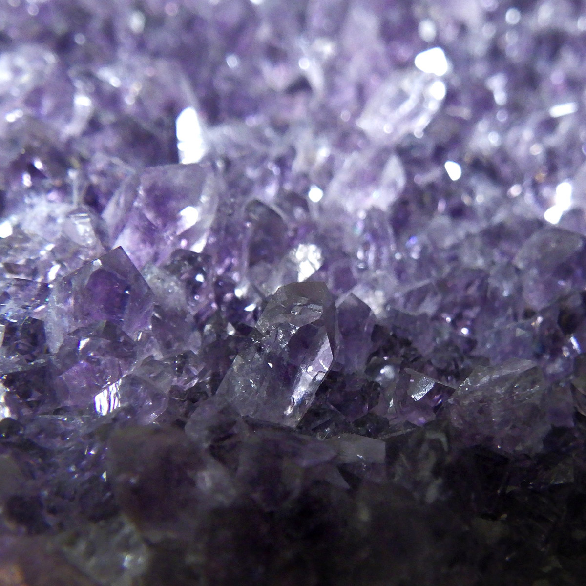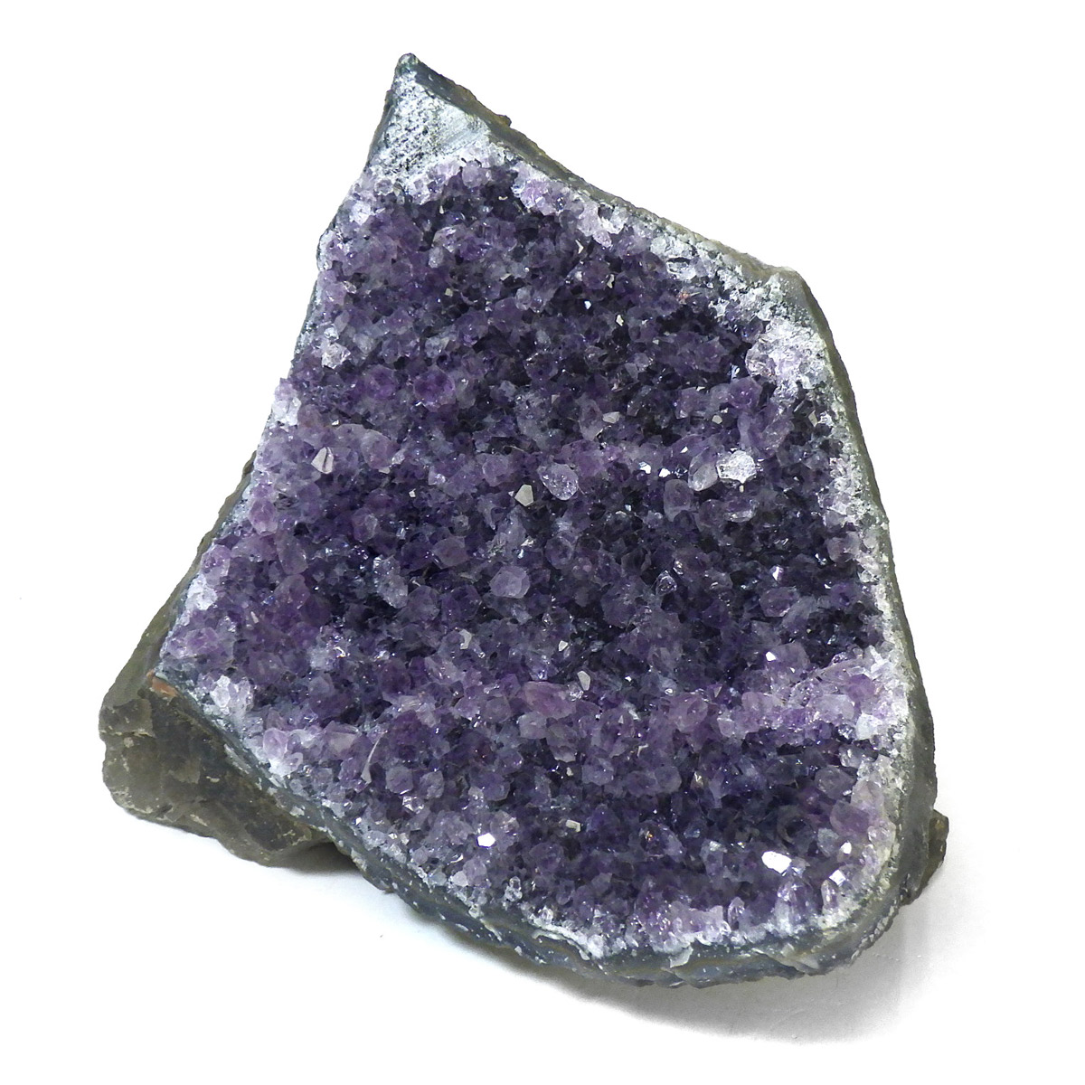 ウルグアイ産のアメジストクラスターです。一つ一つの結晶が細かく光の反射で美しくキラキラと輝きます。良質なアメジストの証である紫の色がしっかりと入っていて、座りがよいので安定感があります。