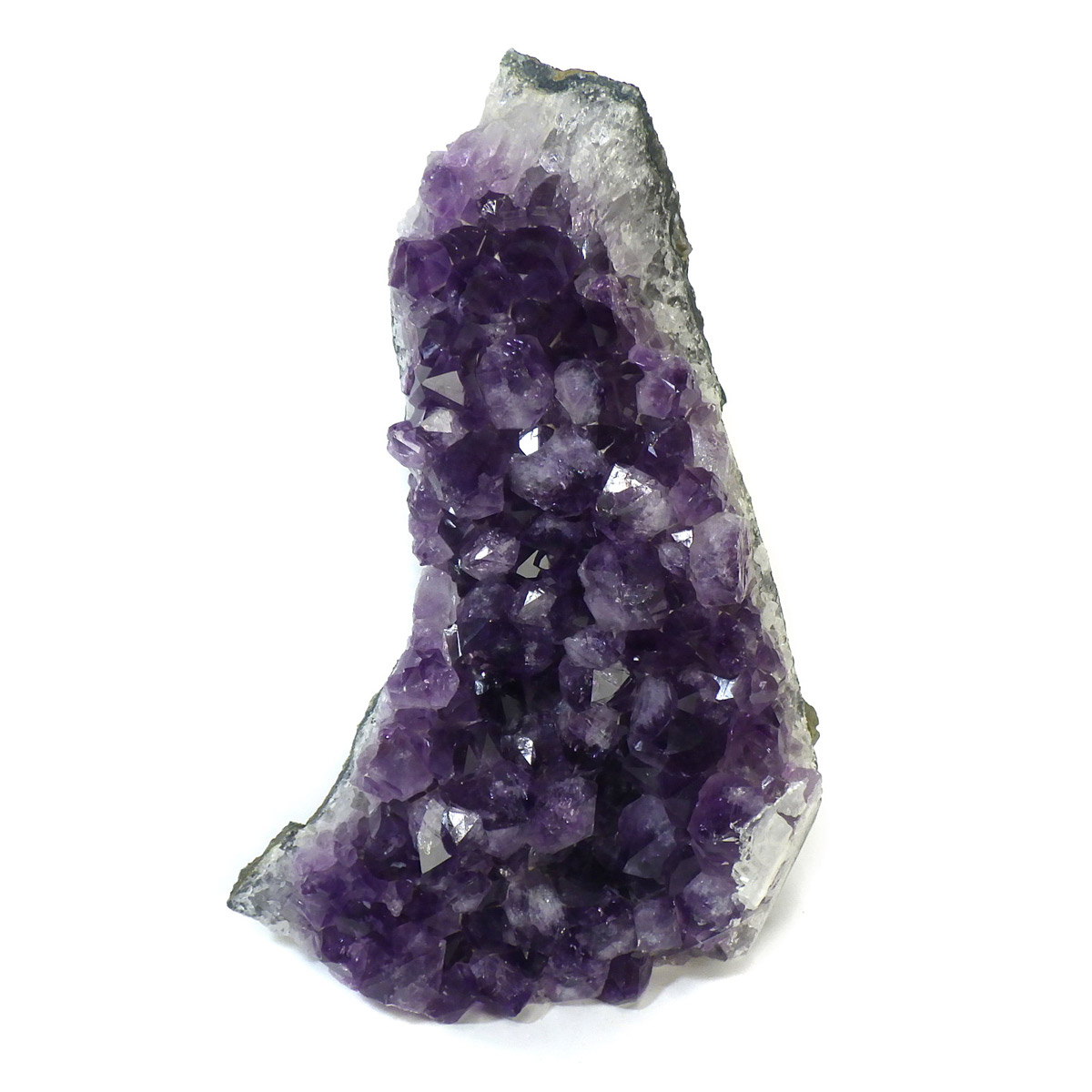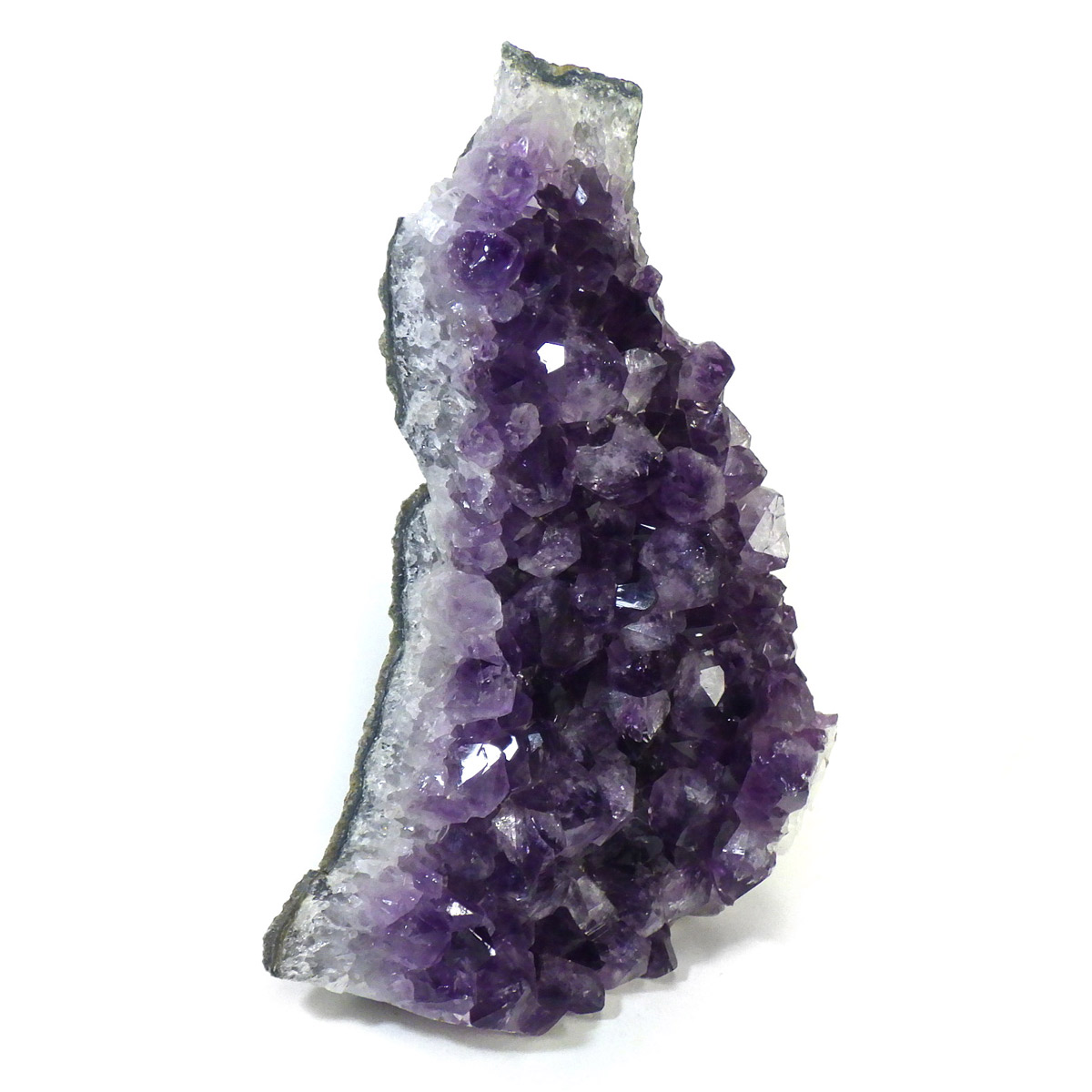ウルグアイ産のアメジストクラスターです。透明感が高くしっかりとした結晶が光の反射で美しくキラキラと輝きます。良質なアメジストの証である紫の色がしっかりと入っていています。カルサイトとの共生がみられます。