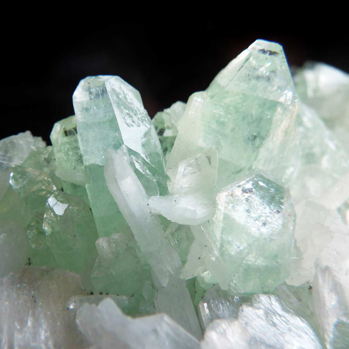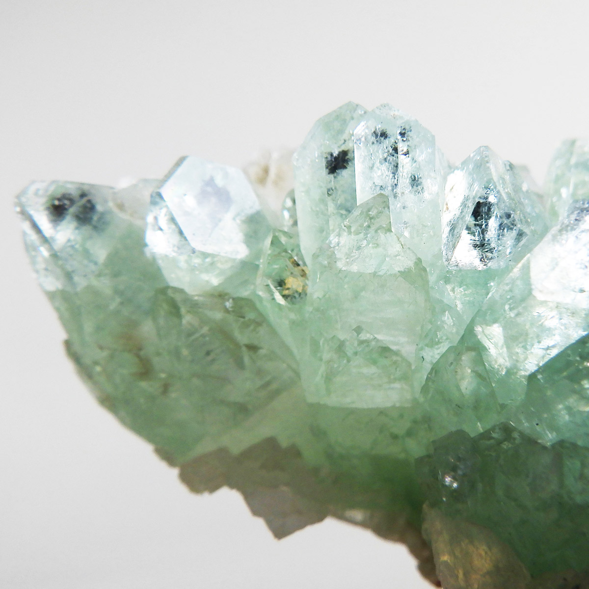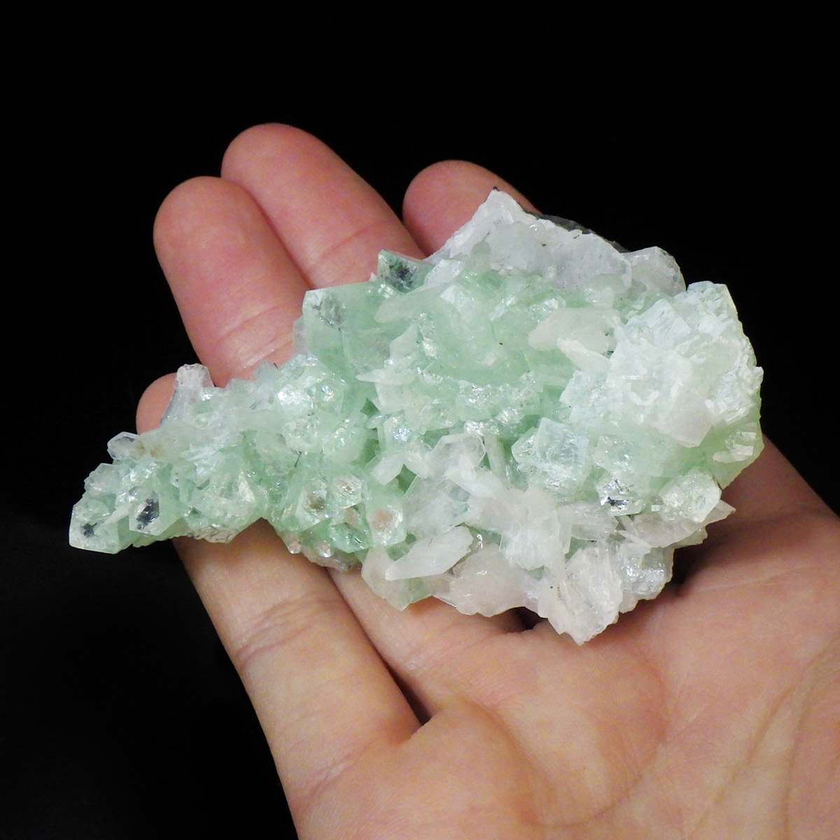 インド、プネー産のグリーンアポフィライト原石です。アポフィライトは、柱状や正方錘状の結晶を持ち、ひとつひとつの結晶が複雑に入り組んだ群晶が水晶とは違う神々しい輝きを魅せてくれます。透明度が非常に高くキラキラ輝き神秘的でとてもきれいです。