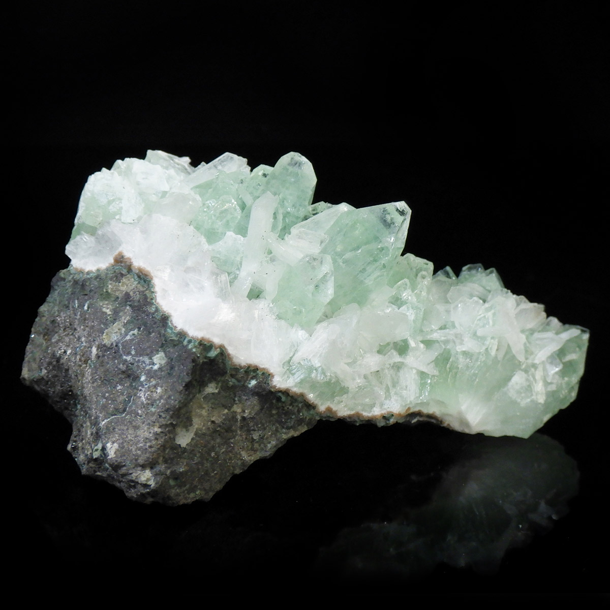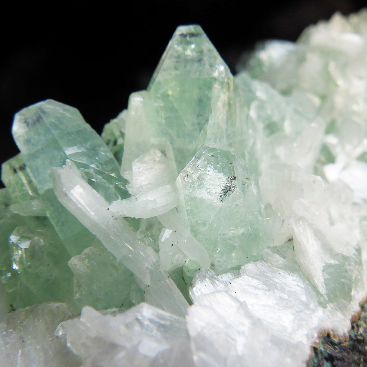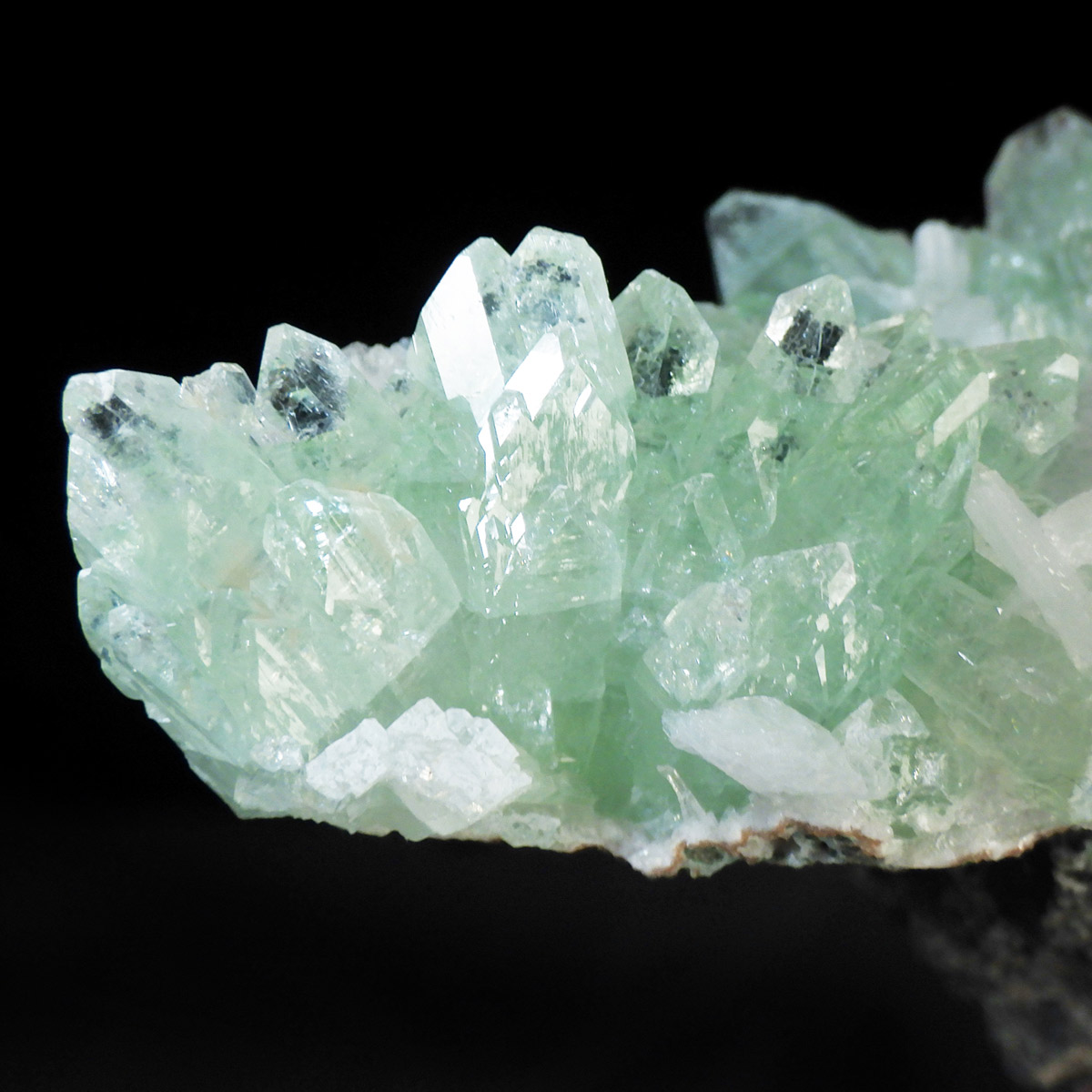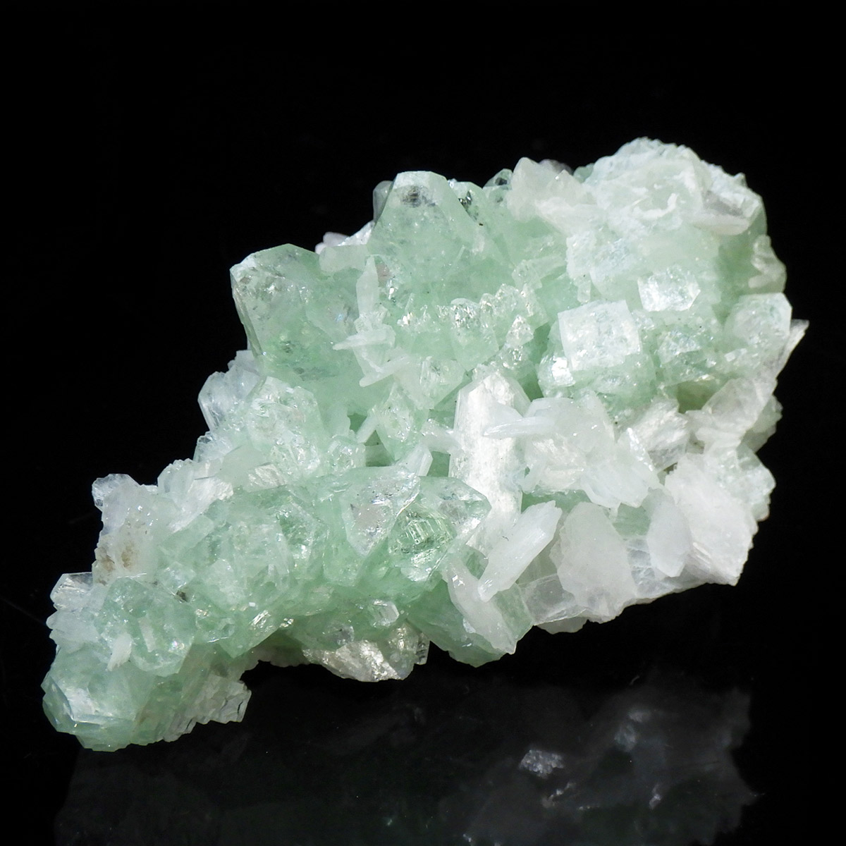 インド、プネー産のグリーンアポフィライト原石です。アポフィライトは、柱状や正方錘状の結晶を持ち、ひとつひとつの結晶が複雑に入り組んだ群晶が水晶とは違う神々しい輝きを魅せてくれます。透明度が非常に高くキラキラ輝き神秘的でとてもきれいです。