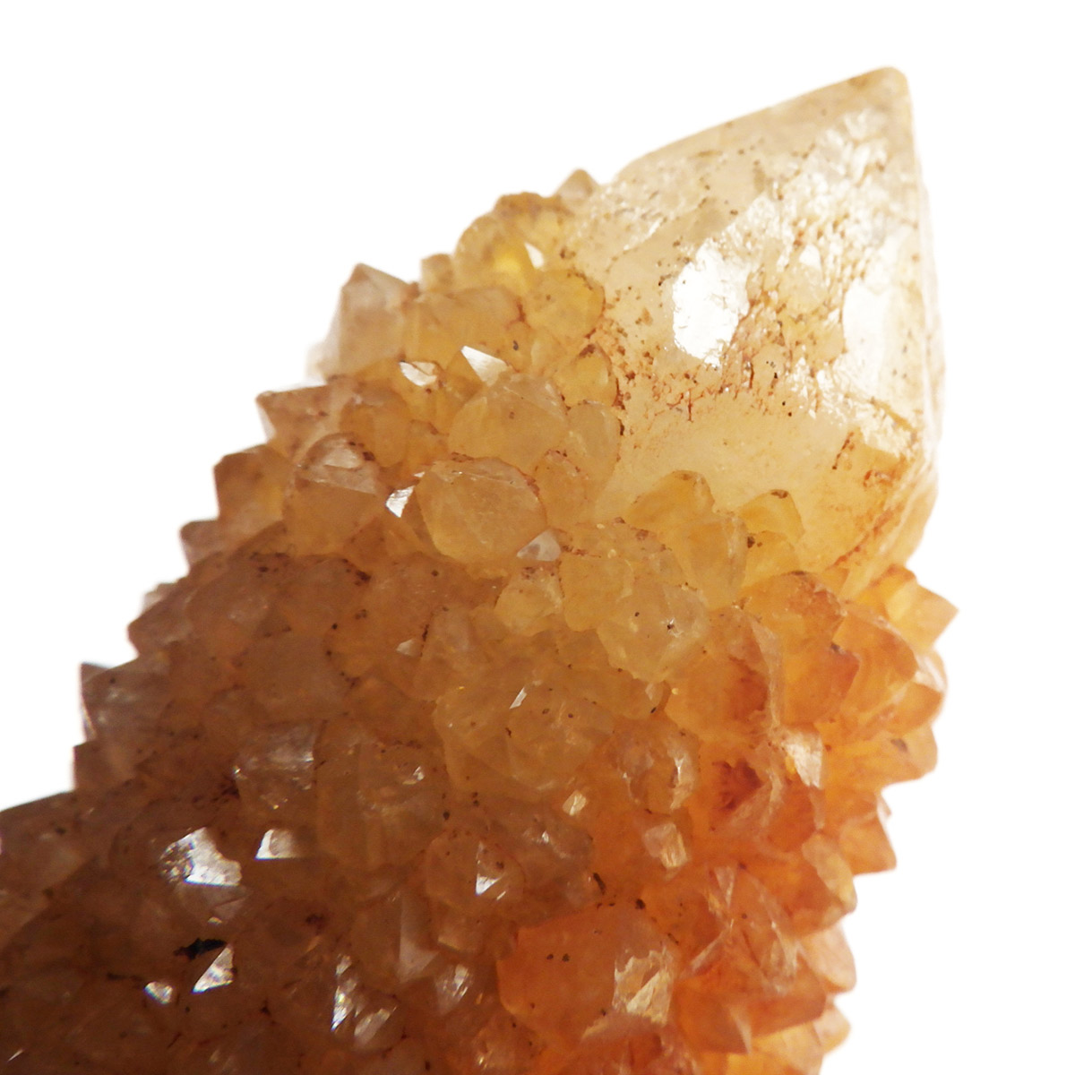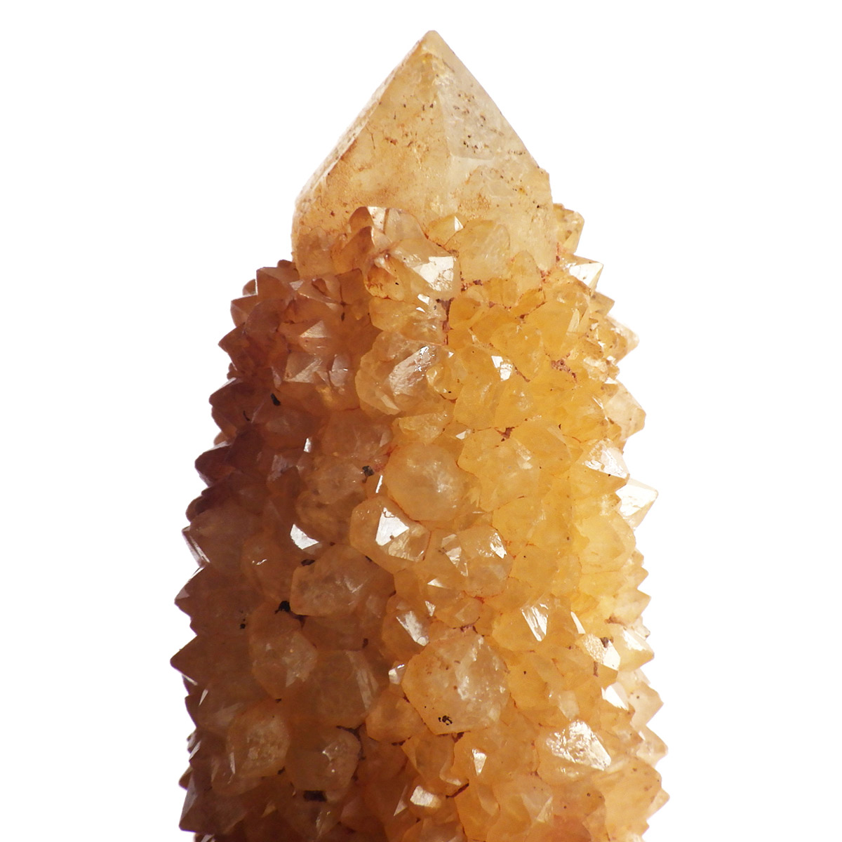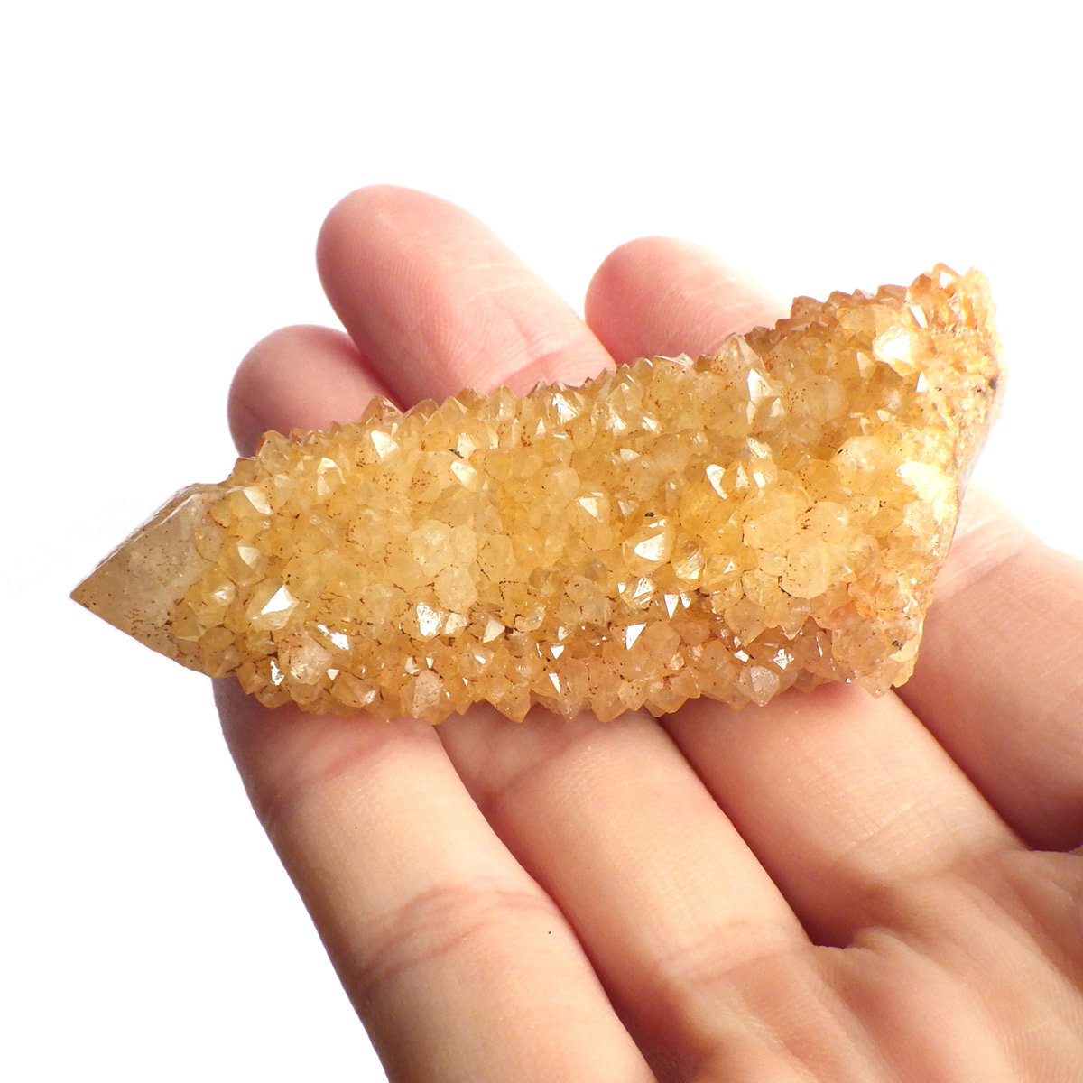 南アフリカ産カクタスリモーネ原石です。カクタスリモーネは、表面に黄色いリモナイトで覆われた水晶でかつ形状がカクタス状のもののことです。カクタスクォーツは芯のクォーツの側面が細かな結晶に包まれるように、先端にポイントが伸びている特徴的なクォーツです。カクタスリモーネはゴールデンヒーラースピリットクォーツやサンシャインクォーツなどとも呼ばれています。側面は細かな結晶で形成されており、キラキラと神秘的な輝きを放ちます。