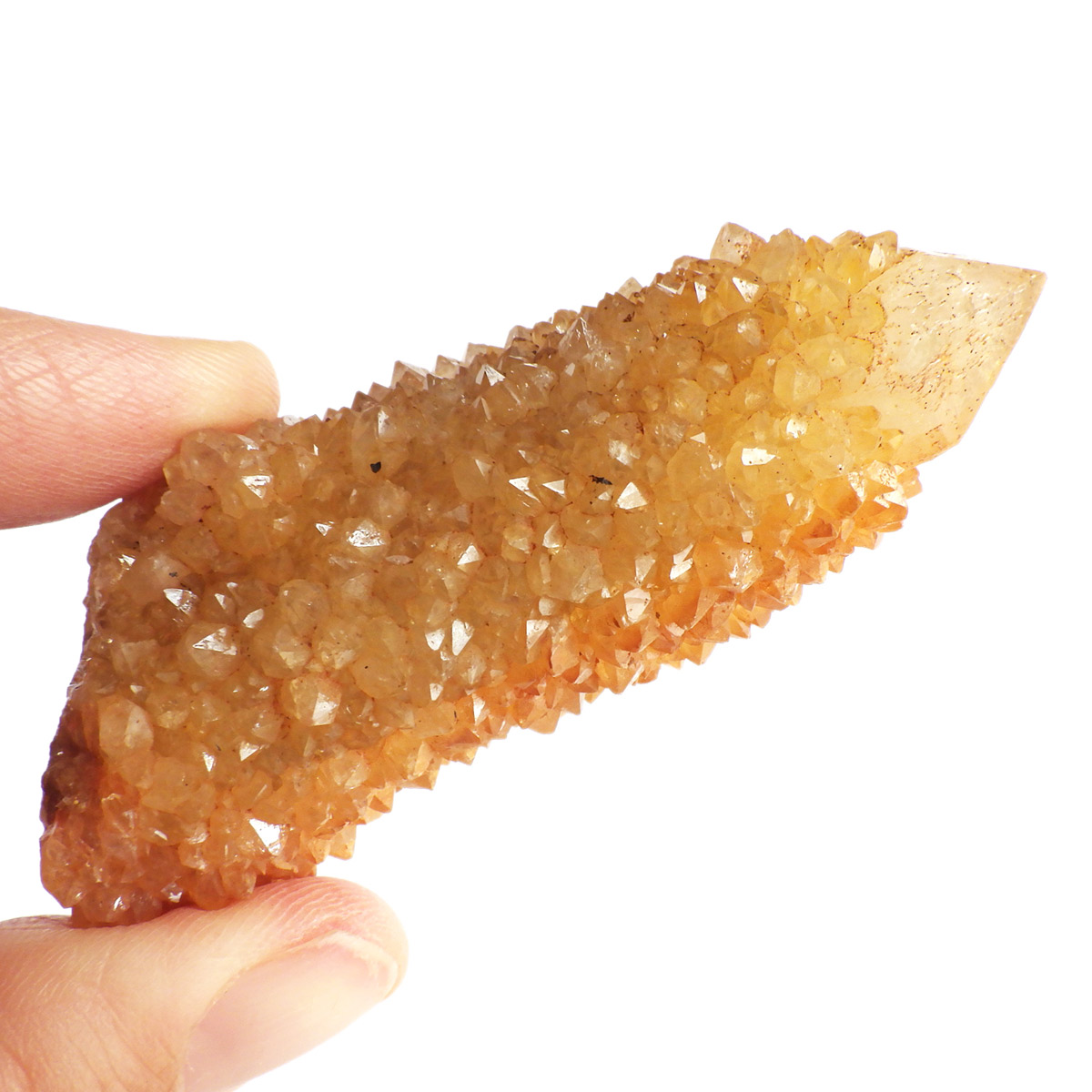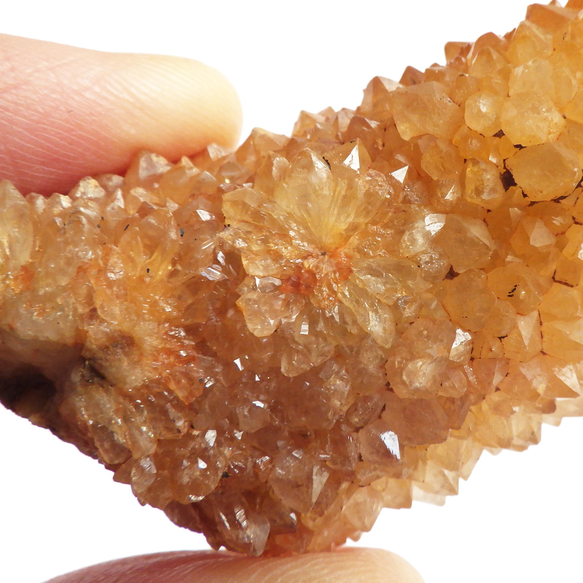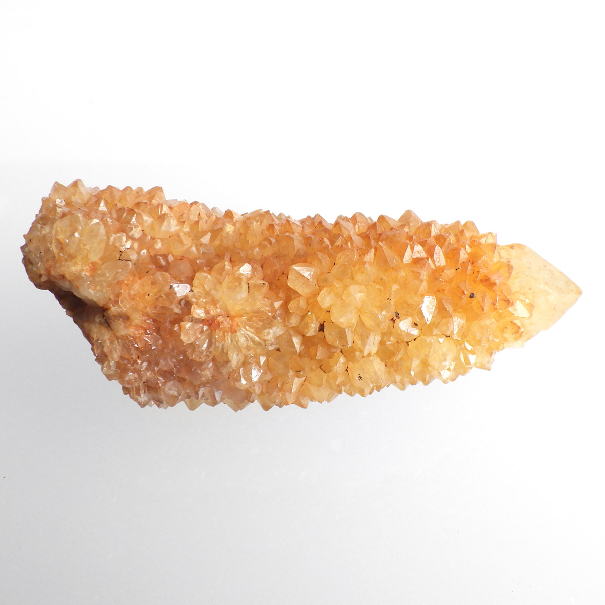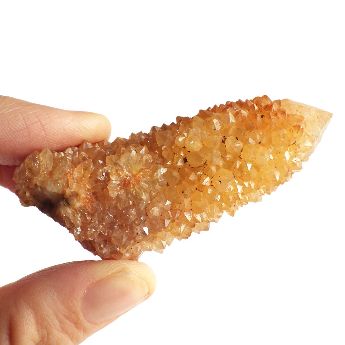 南アフリカ産カクタスリモーネ原石です。カクタスリモーネは、表面に黄色いリモナイトで覆われた水晶でかつ形状がカクタス状のもののことです。カクタスクォーツは芯のクォーツの側面が細かな結晶に包まれるように、先端にポイントが伸びている特徴的なクォーツです。カクタスリモーネはゴールデンヒーラースピリットクォーツやサンシャインクォーツなどとも呼ばれています。側面は細かな結晶で形成されており、キラキラと神秘的な輝きを放ちます。