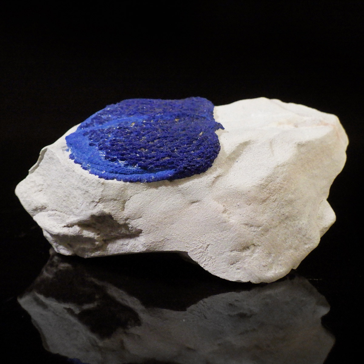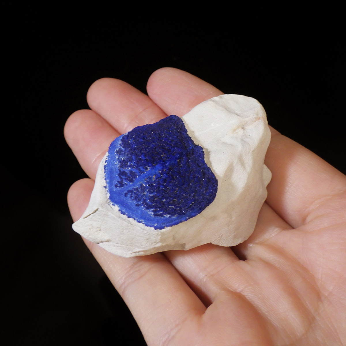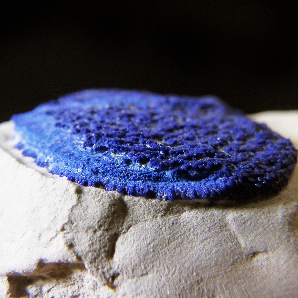 オーストラリア産アズライトサン原石です。アズライトサンは、銅系ミネラルであるアズライトが、太陽を彷彿させる円盤状に結晶したものです。アズライトは鮮やかなブルーの発色が魅力ですが、結晶がデリケートな為、美しいクリスタルは希少であり、価値も高くなります。このアズライトサンは、カオリナイト(カオリン)中の僅かなクラックなどを伝い、銅分が円盤状に拡がって出来た、大変ユニークな結晶です。色は比較的明るめのブルーで、ファンが多いにもかかわらず、マルバンガーという、個人所有の地域から産することから、流通量が非常にかぎられます。