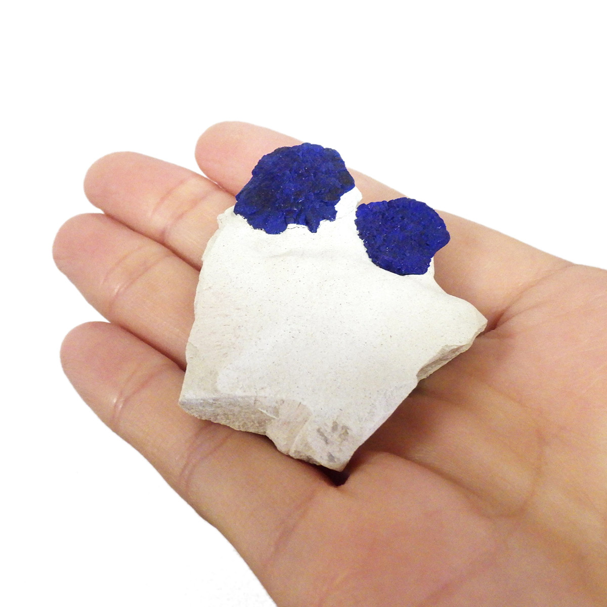 オーストラリア産アズライトサン原石です。アズライトサンは、銅系ミネラルであるアズライトが、太陽を彷彿させる円盤状に結晶したものです。アズライトは鮮やかなブルーの発色が魅力ですが、結晶がデリケートな為、美しいクリスタルは希少であり、価値も高くなります。このアズライトサンは、カオリナイト(カオリン)中の僅かなクラックなどを伝い、銅分が円盤状に拡がって出来た、大変ユニークな結晶です。色は比較的明るめのブルーで、ファンが多いにもかかわらず、マルバンガーという、個人所有の地域から産することから、流通量が非常にかぎられます。