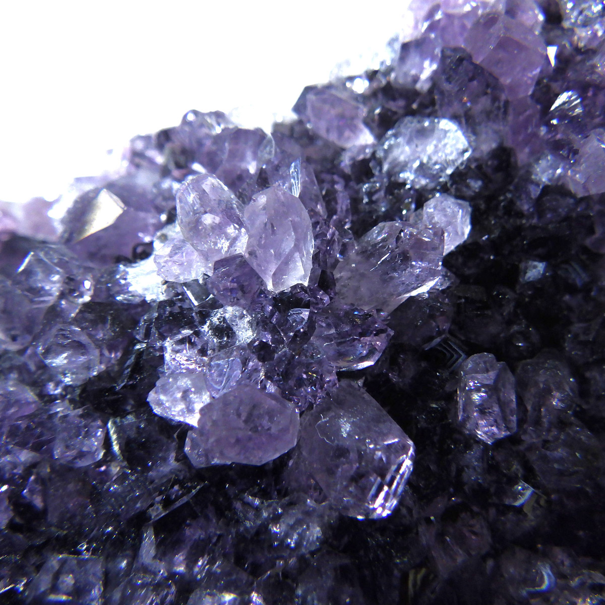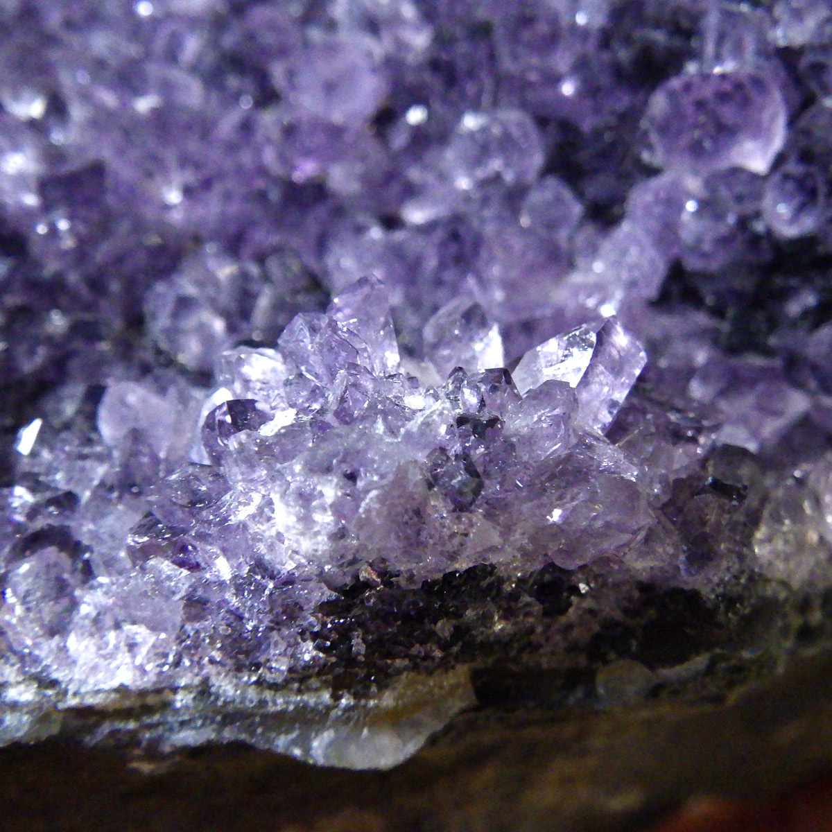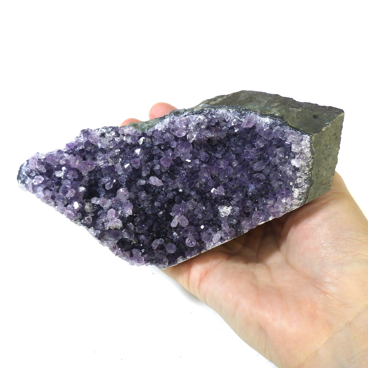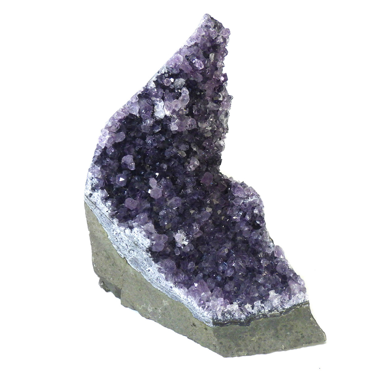 ウルグアイ産のアメジストクラスターです。一つ一つの結晶が細かく光の反射で美しくキラキラと輝きます。良質なアメジストの証である紫の色がしっかりと入っていて、座りがよく安定感があります。裏面にも透明度の高いアメジストが入っていて二方向で楽しめます。