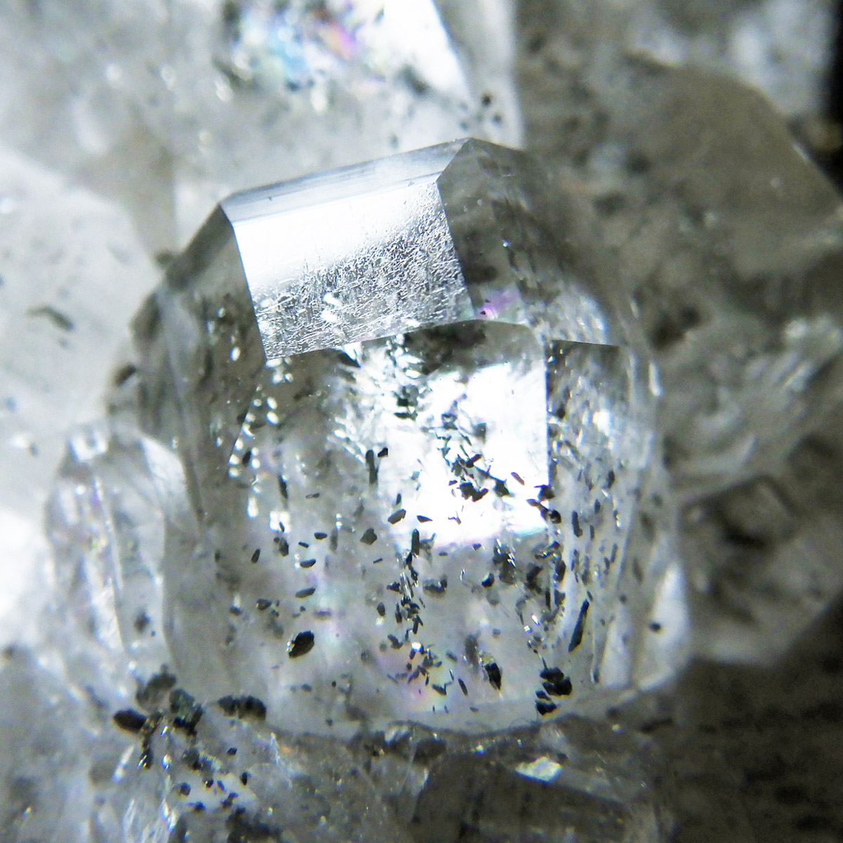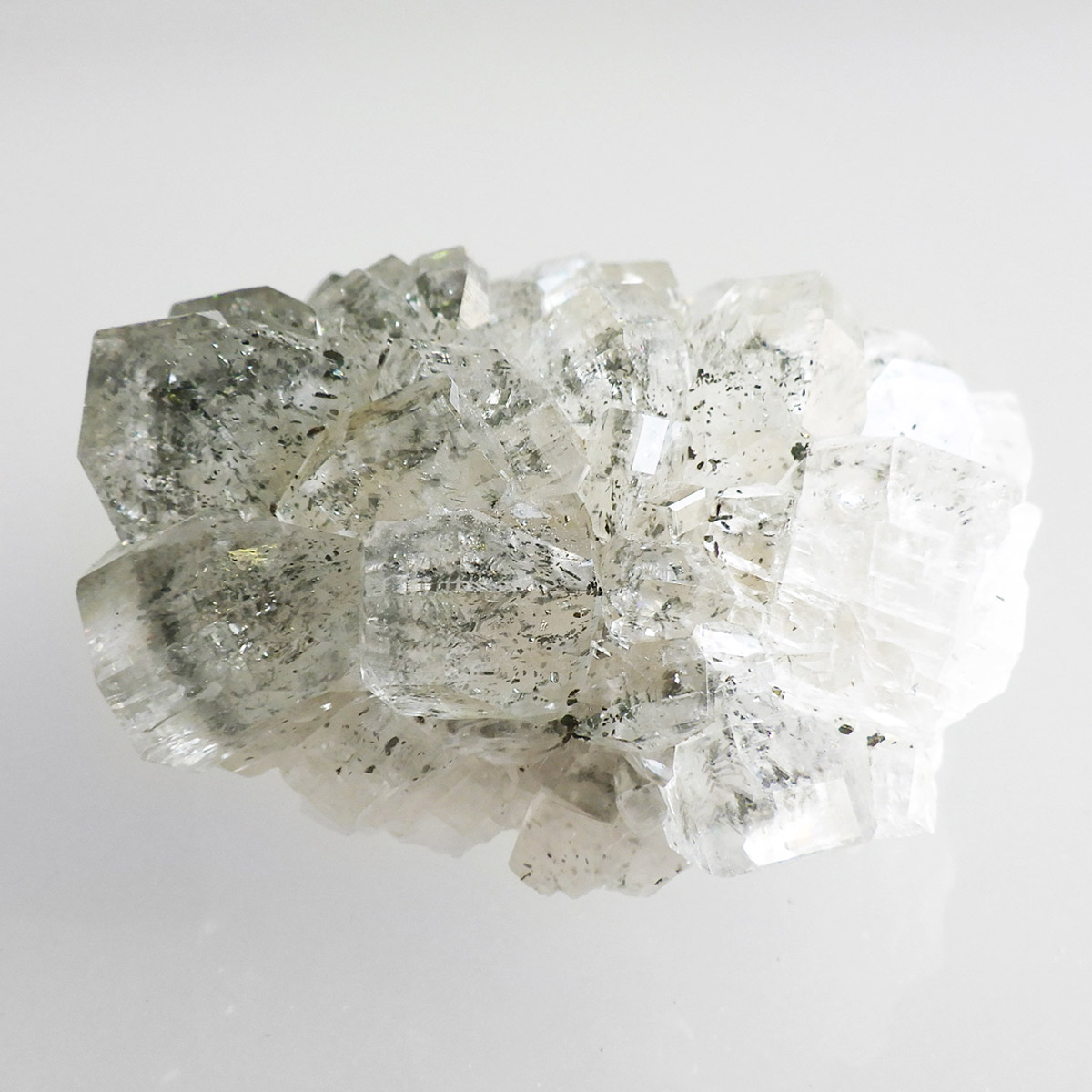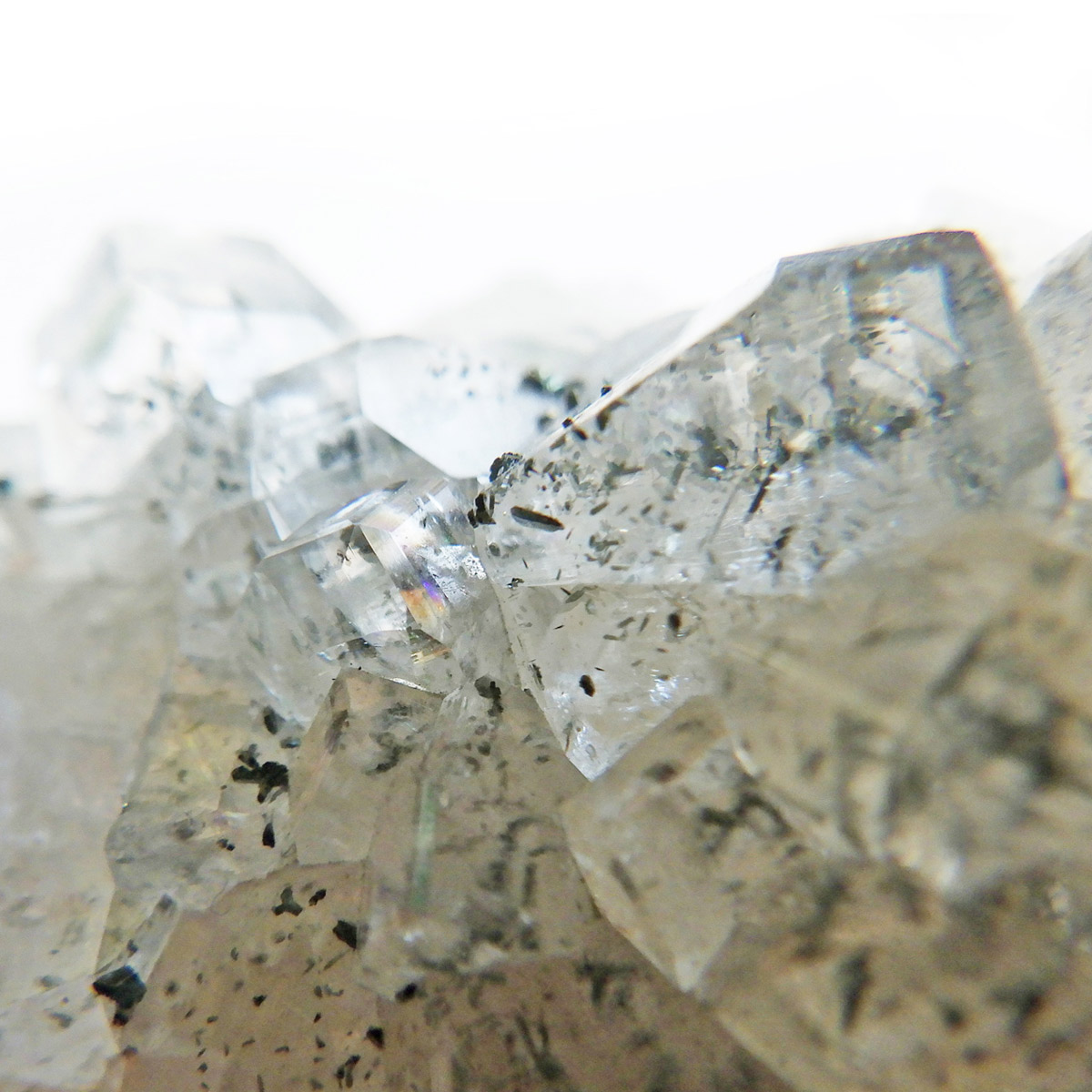 アメリカのアイオワ州バッファロー鉱山で産出された、マーカサイトを内包したカルサイトの結晶です。カルサイトのキューブ結晶は、素晴らしい煌きとテリとレインボーがみられます。複屈折という光学現象を持ち、文字の上に載せると二つにダブって見える「ダブリング(二重像現象)」のような現象を起こします。それによって内部のマーカサイトやレインボーがダブって見え、楽しい世界を見せてくれます。