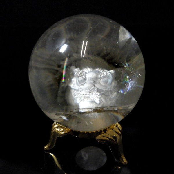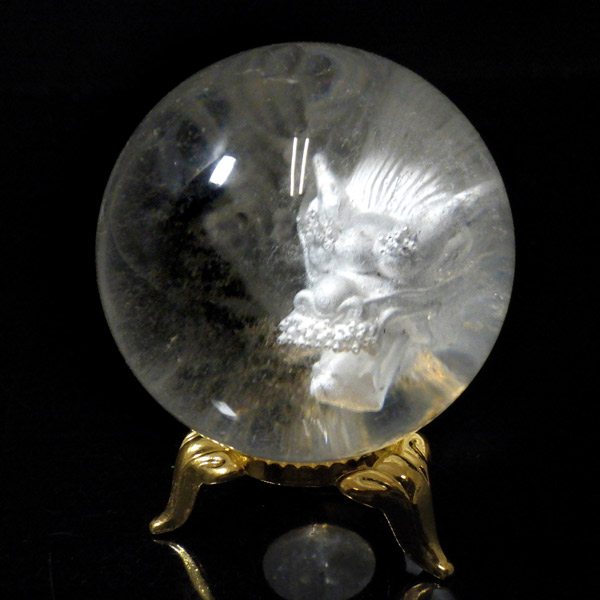水晶 丸玉 龍裏彫り 直径44mm 水晶球 スフィア 金属台付き