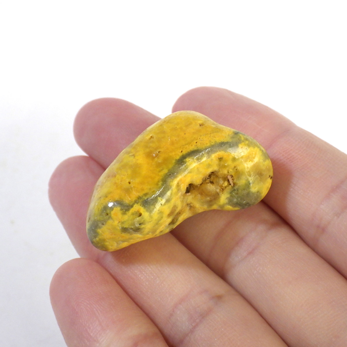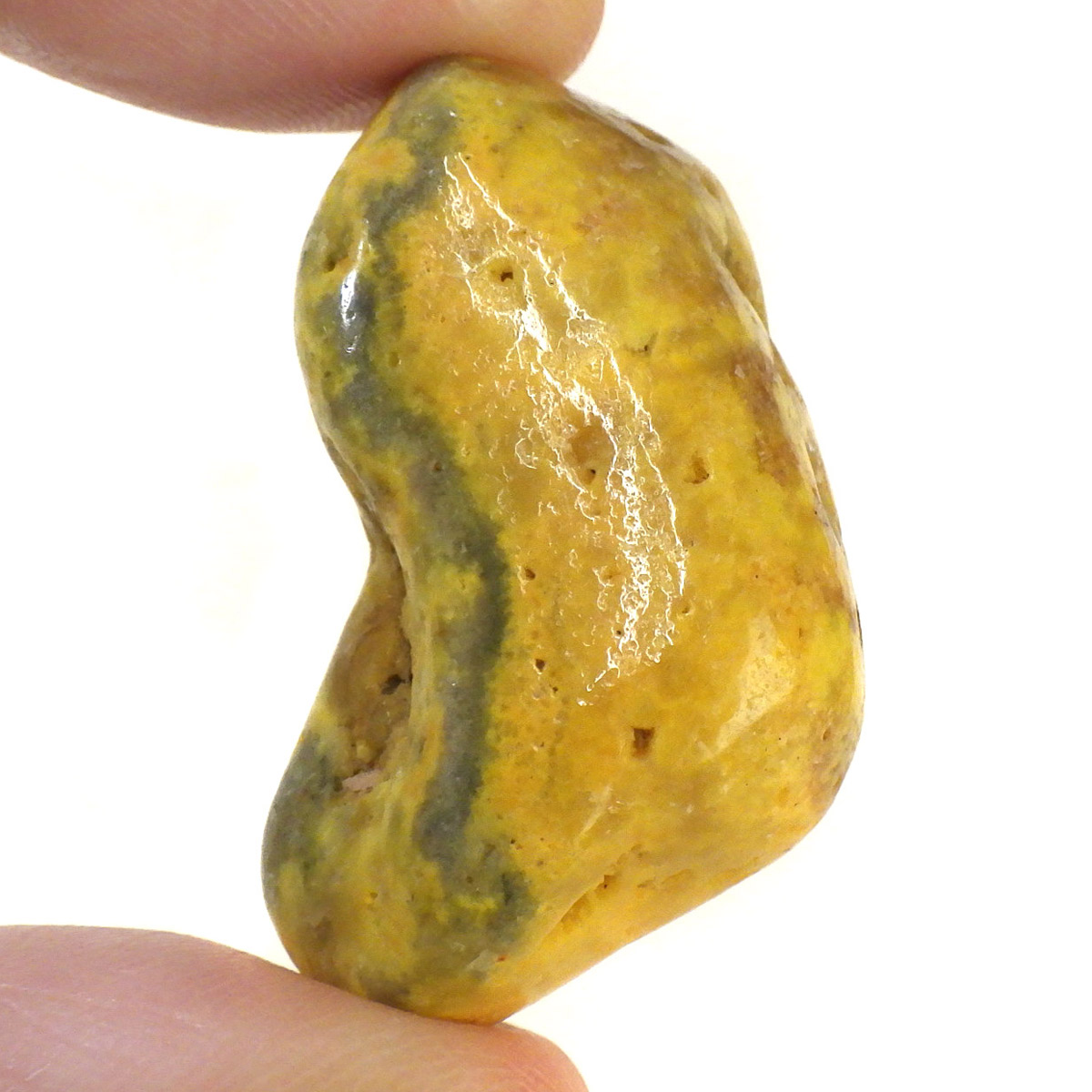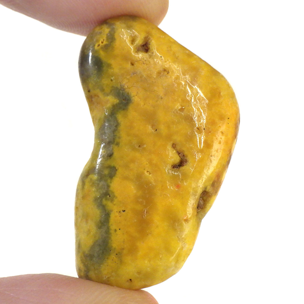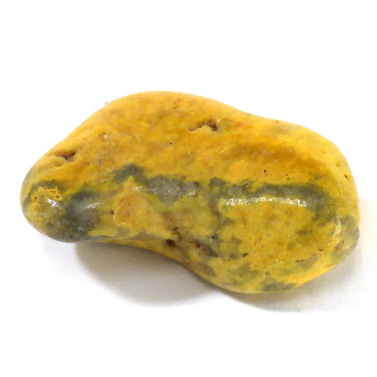 インドネシア産のバンブルビージャスパー、タンブルです。発色とグラデーションが美しいものを選りすぐりました。バンブルビージャスパー、別名エクリプスとも呼ばれます。「バンブルビー」とは、ミツバチの一種のマルハナバチのことで、黒地に蛍光色のイエローの模様からこの名前がつけられました。また、「エクリプス」とは、皆既日食を意味しています。主に硫黄がビビッドな発色を生み出すと言われ、クォーツと他の微量ミネラルで構成されています。世界的にもレアストーンとされていますが、特に日本市場での流通量は非常に少なく、入手困難な石なのです。もし気に入られた場合は、お早めにご購入されることをオススメします。所々に穴があり、ルーペで覗いてみると小さな結晶が見られます。