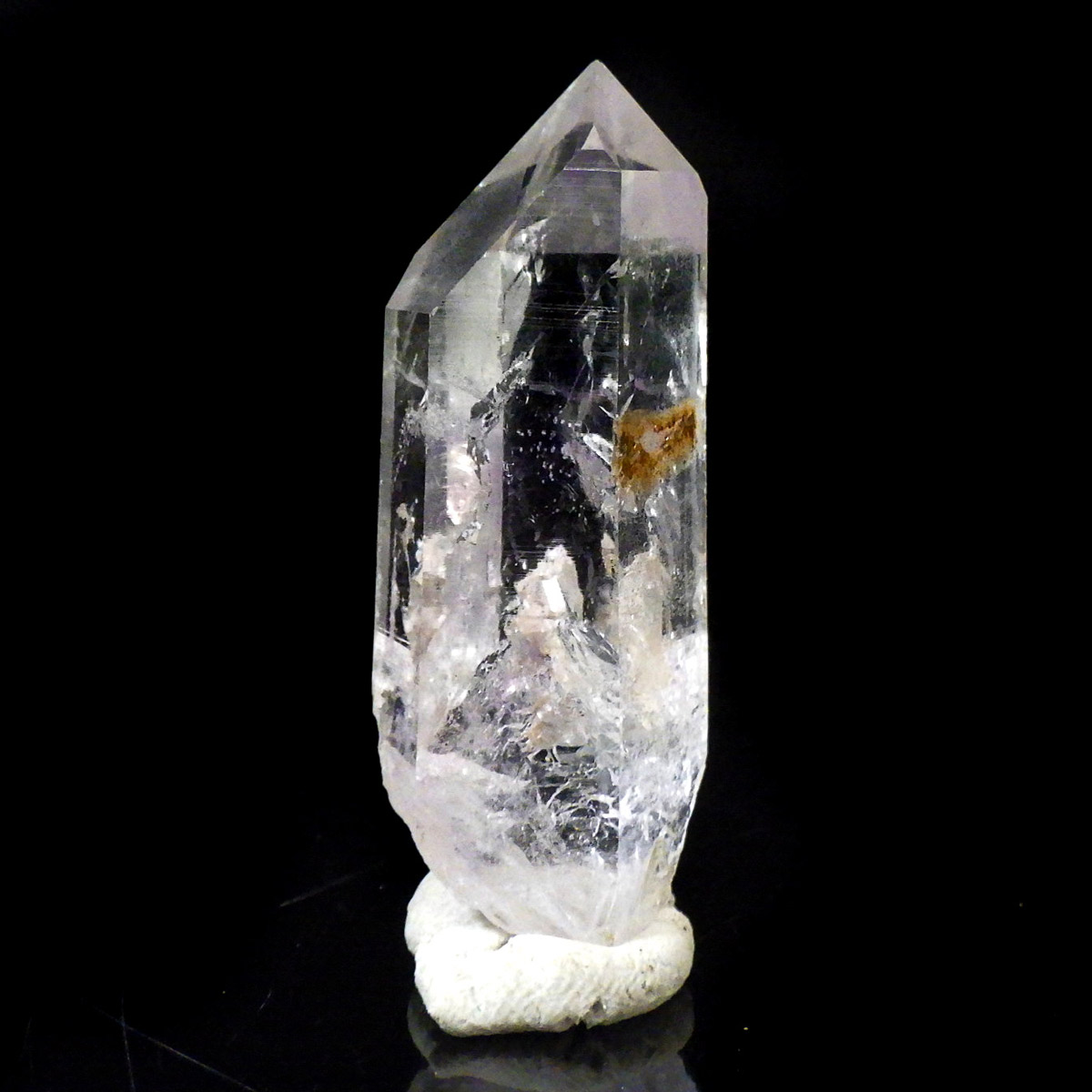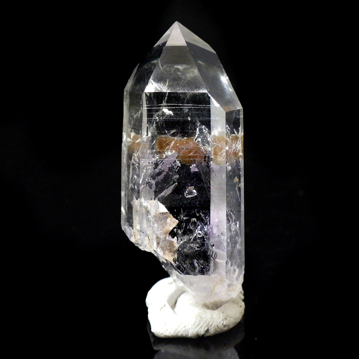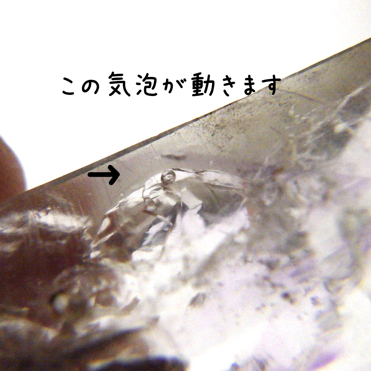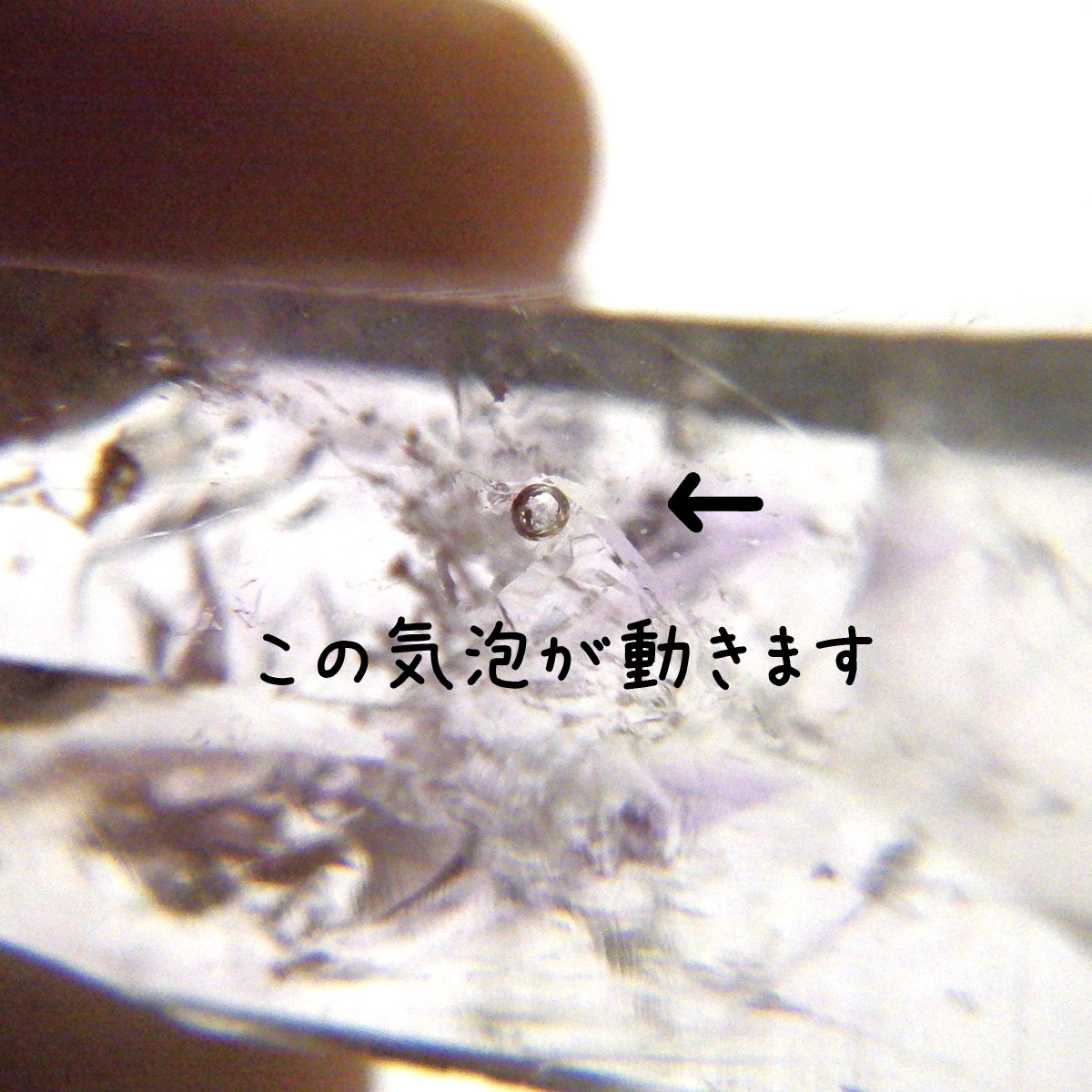 有名なナミビアのブランドバークから少し離れたところの新たな採掘場であるゴボボセブ産のアメジストのポイントです。ブランドバークに負けないくらい、硬くて瑞々しく透明感のあるアメジストがよく産出されます。非常に透明度が高く、ファントム、レインボー、レムリアンなどいろいろな表情を見せてくれるとてもきれいな一点です。 このアメジストポイントは、2か所水が内包されていて気泡が動く様子が確認できました。