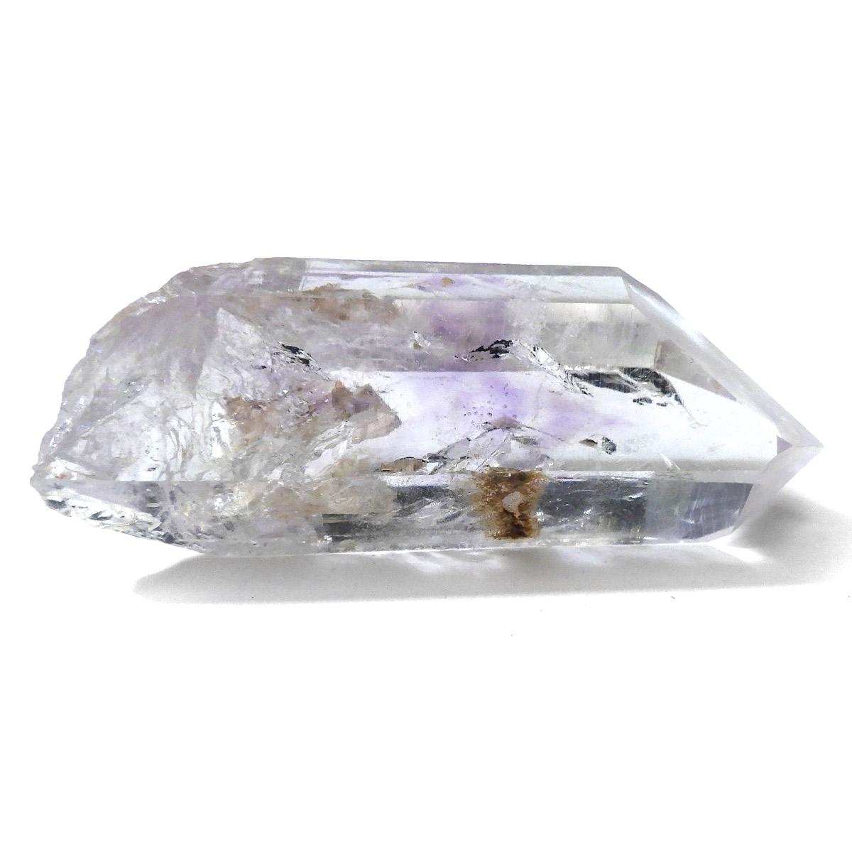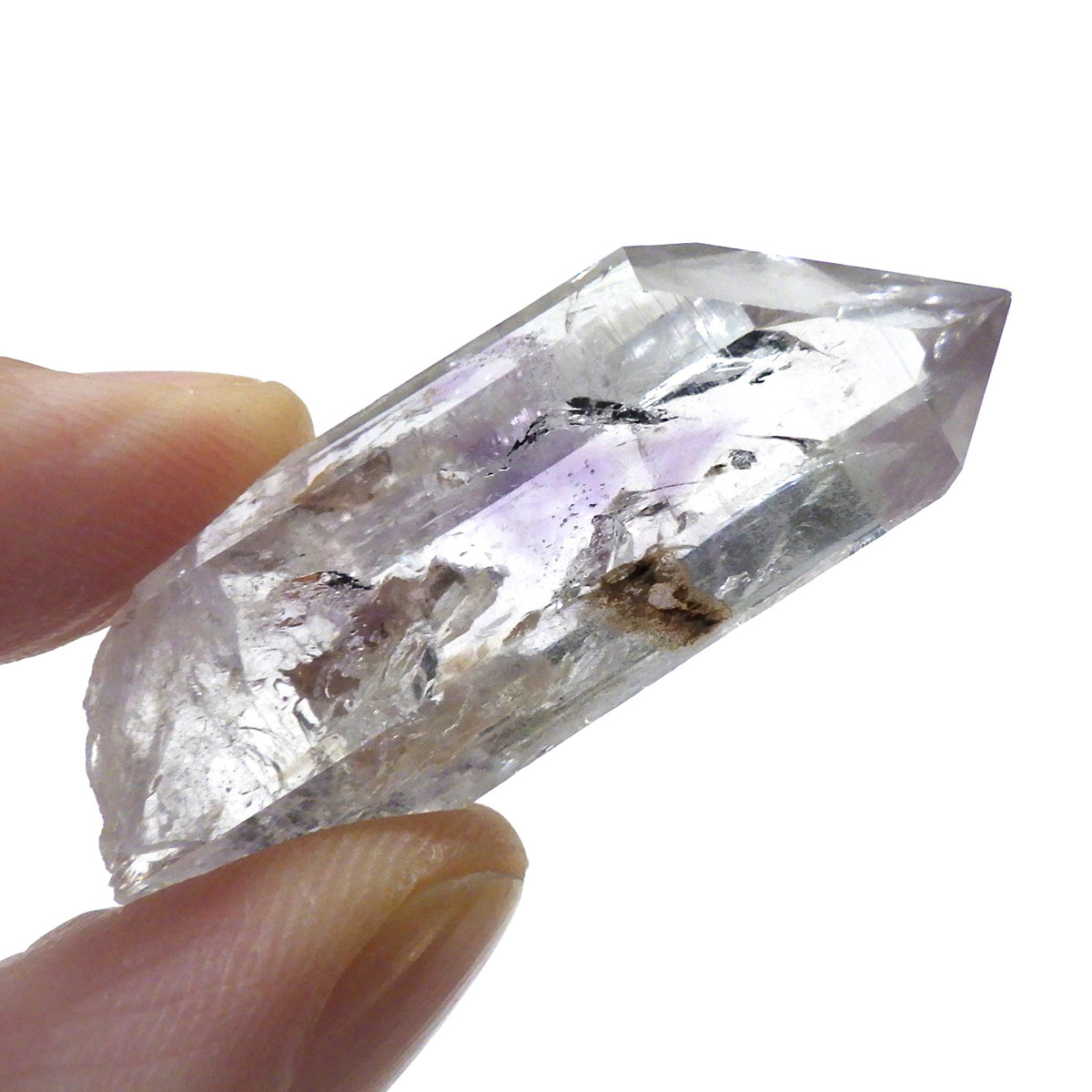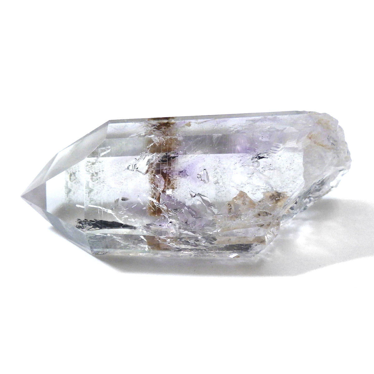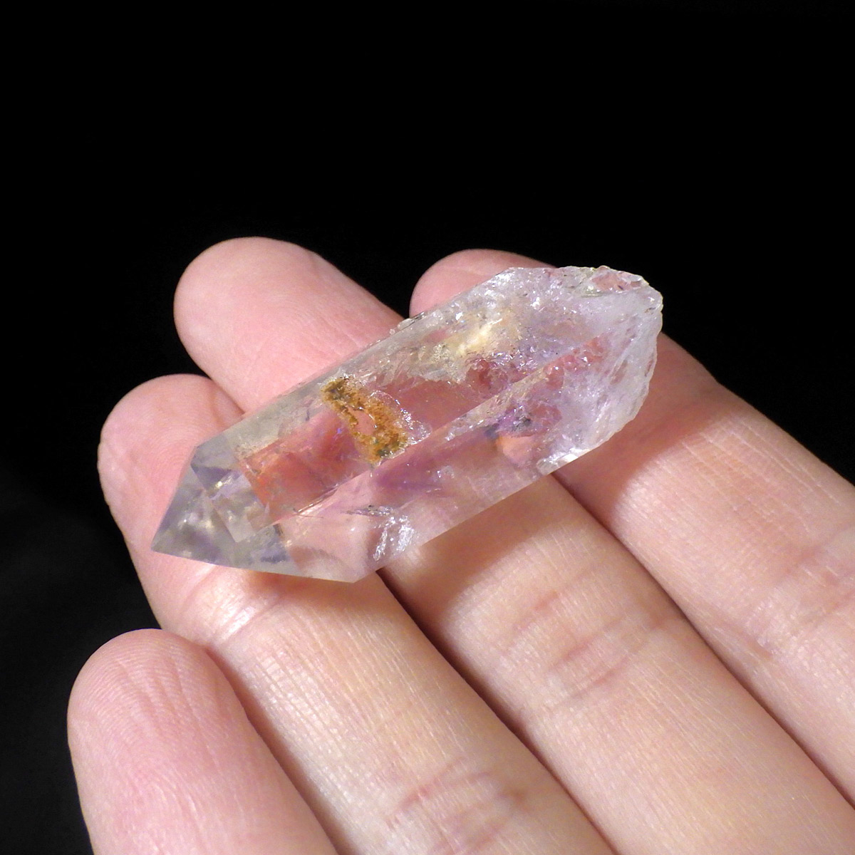 有名なナミビアのブランドバークから少し離れたところの新たな採掘場であるゴボボセブ産のアメジストのポイントです。ブランドバークに負けないくらい、硬くて瑞々しく透明感のあるアメジストがよく産出されます。非常に透明度が高く、ファントム、レインボー、レムリアンなどいろいろな表情を見せてくれるとてもきれいな一点です。 このアメジストポイントは、2か所水が内包されていて気泡が動く様子が確認できました。