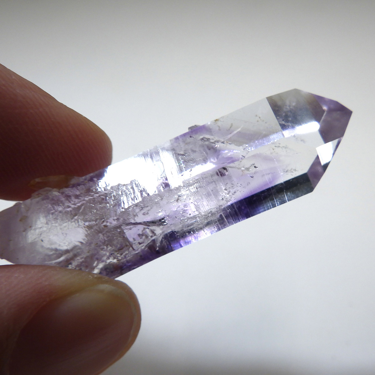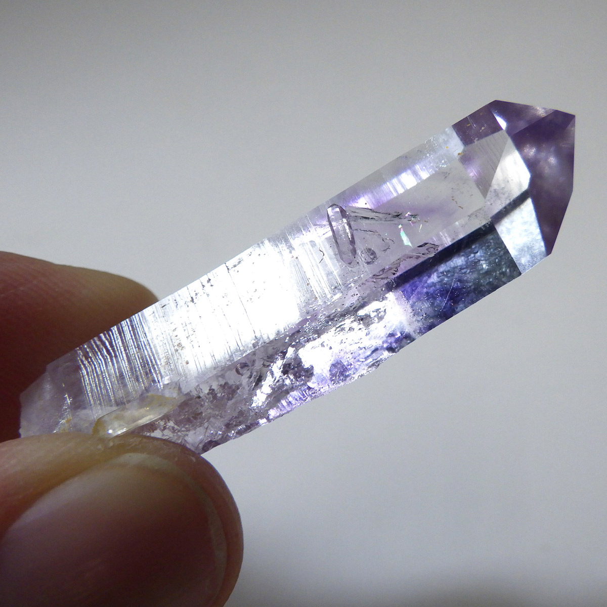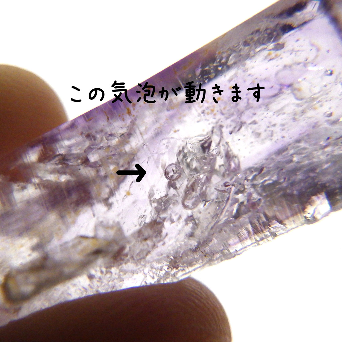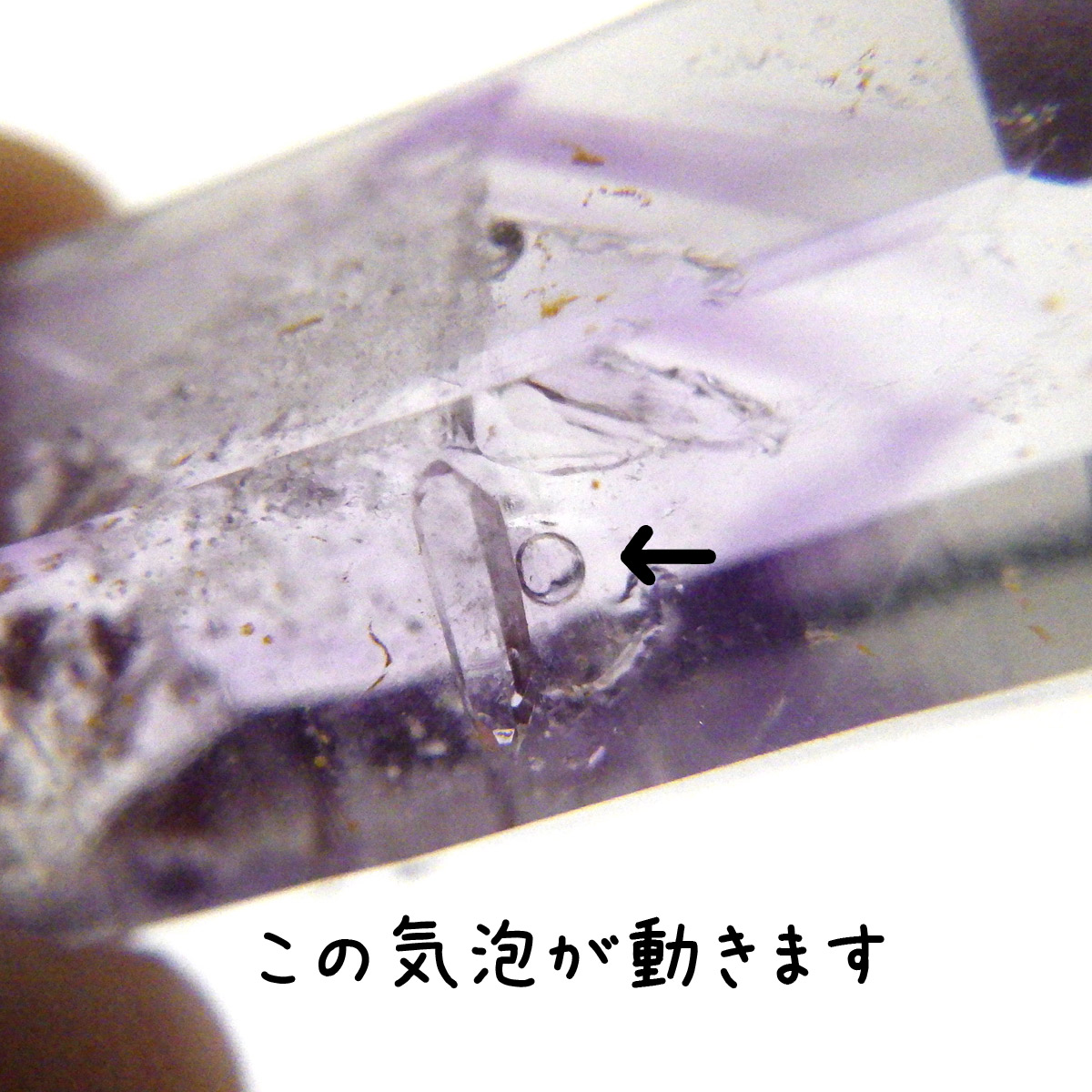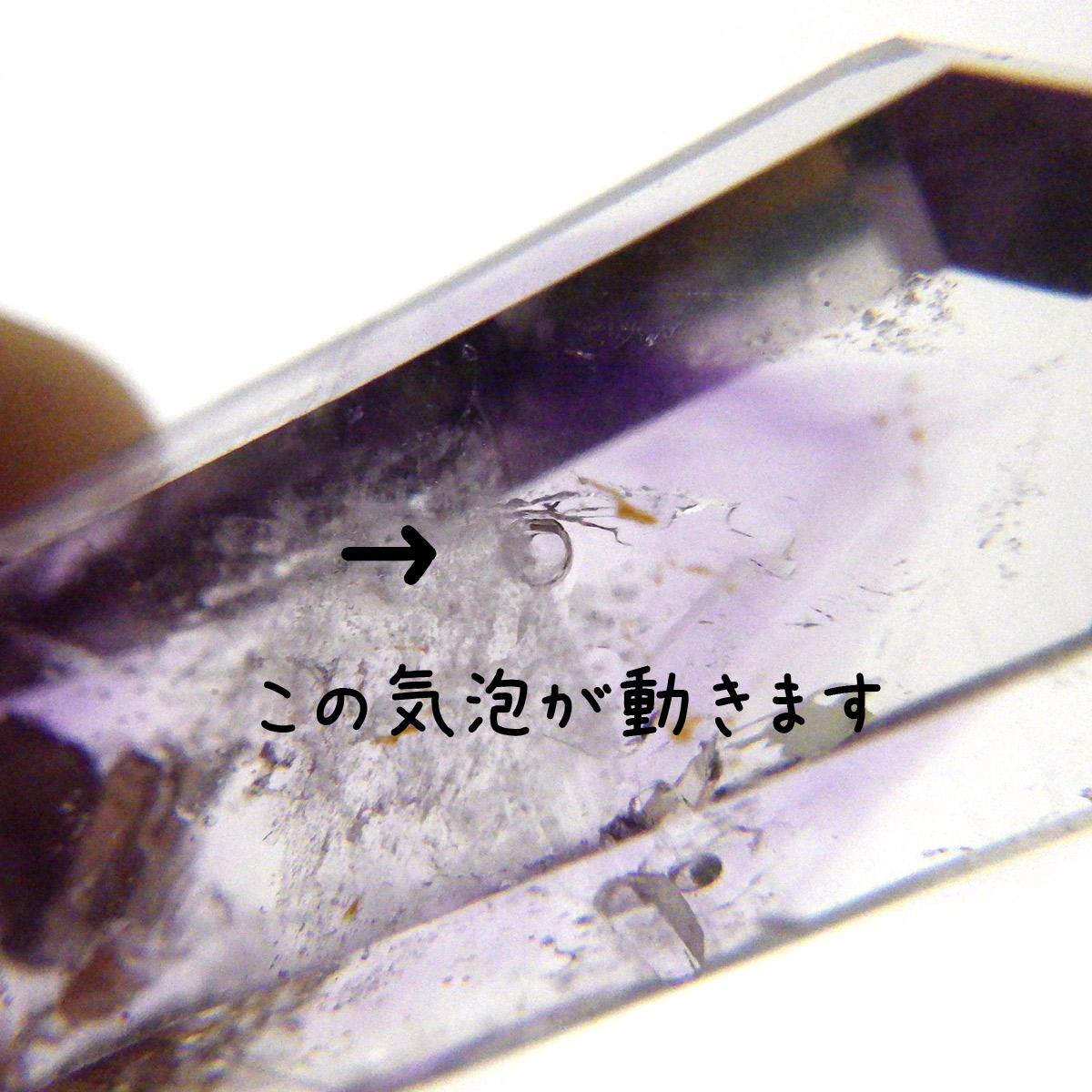 有名なナミビアのブランドバークから少し離れたところの新たな採掘場であるゴボボセブ産のアメジストのポイントです。ブランドバークに負けないくらい、硬くて瑞々しく透明感のあるアメジストがよく産出されます。非常に透明度が高く、ファントム、レインボー、レムリアンなどいろいろな表情を見せてくれるとてもきれいな一点です。 こちらのアメジストポイントには、3か所水が内包されていて気泡が動く様子が確認できました。