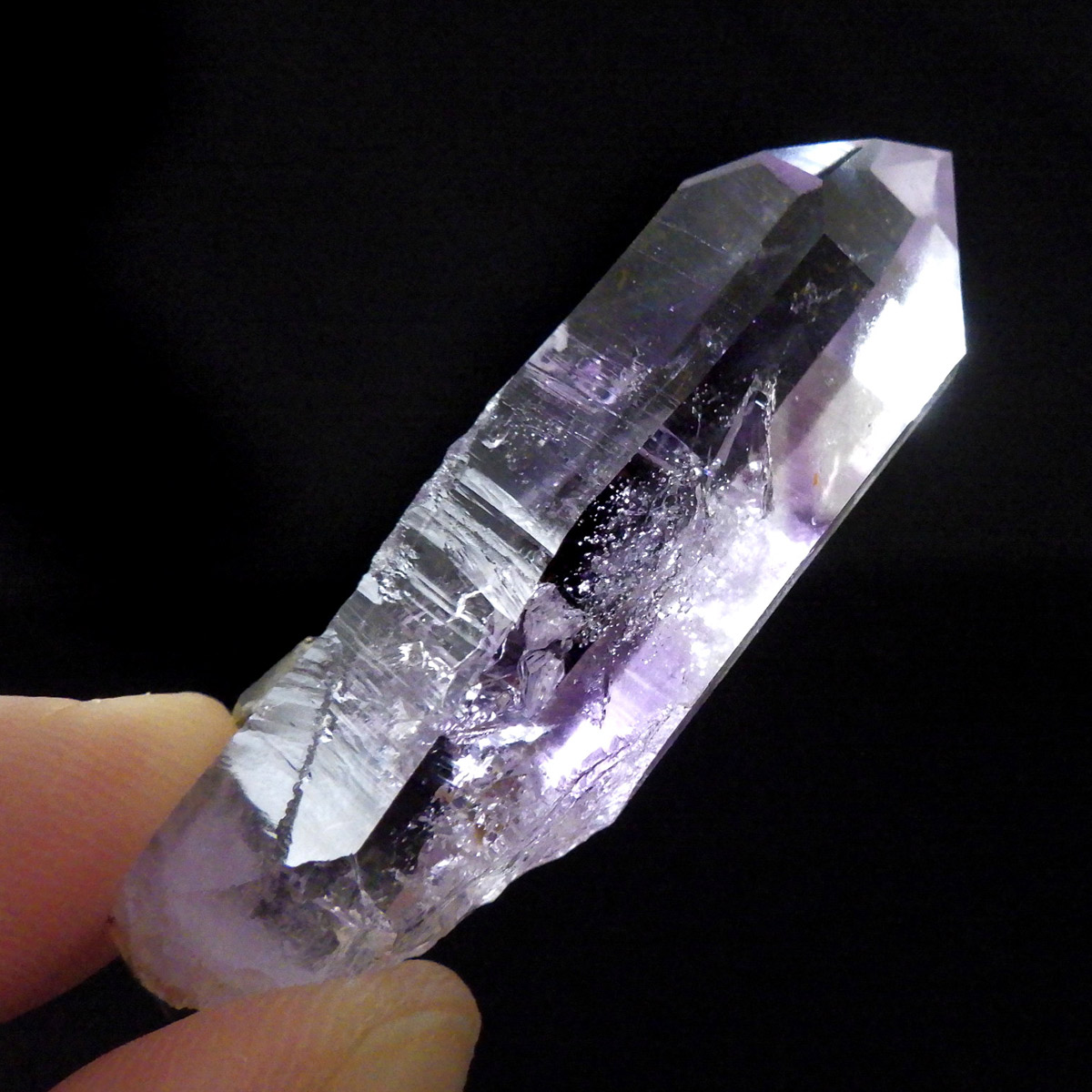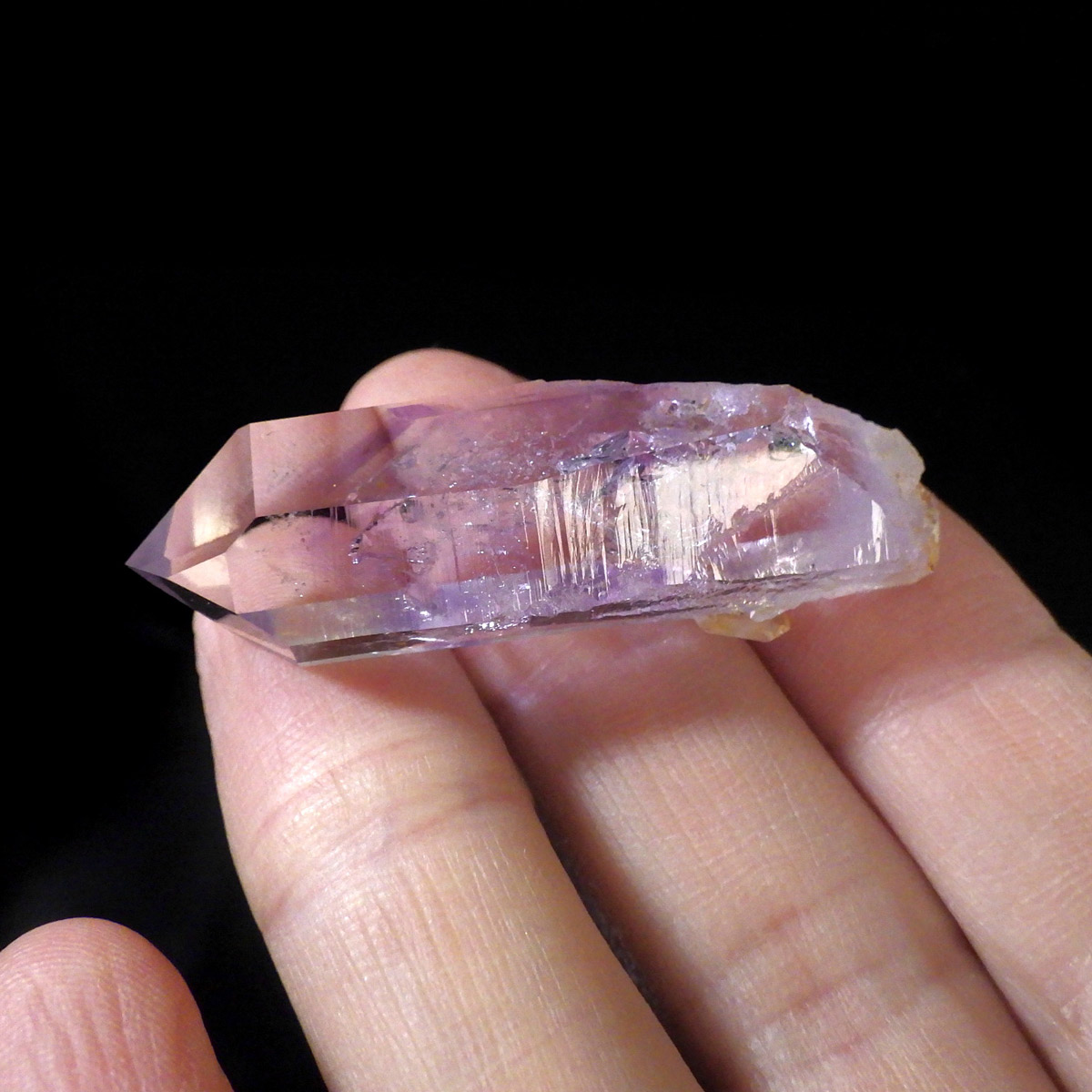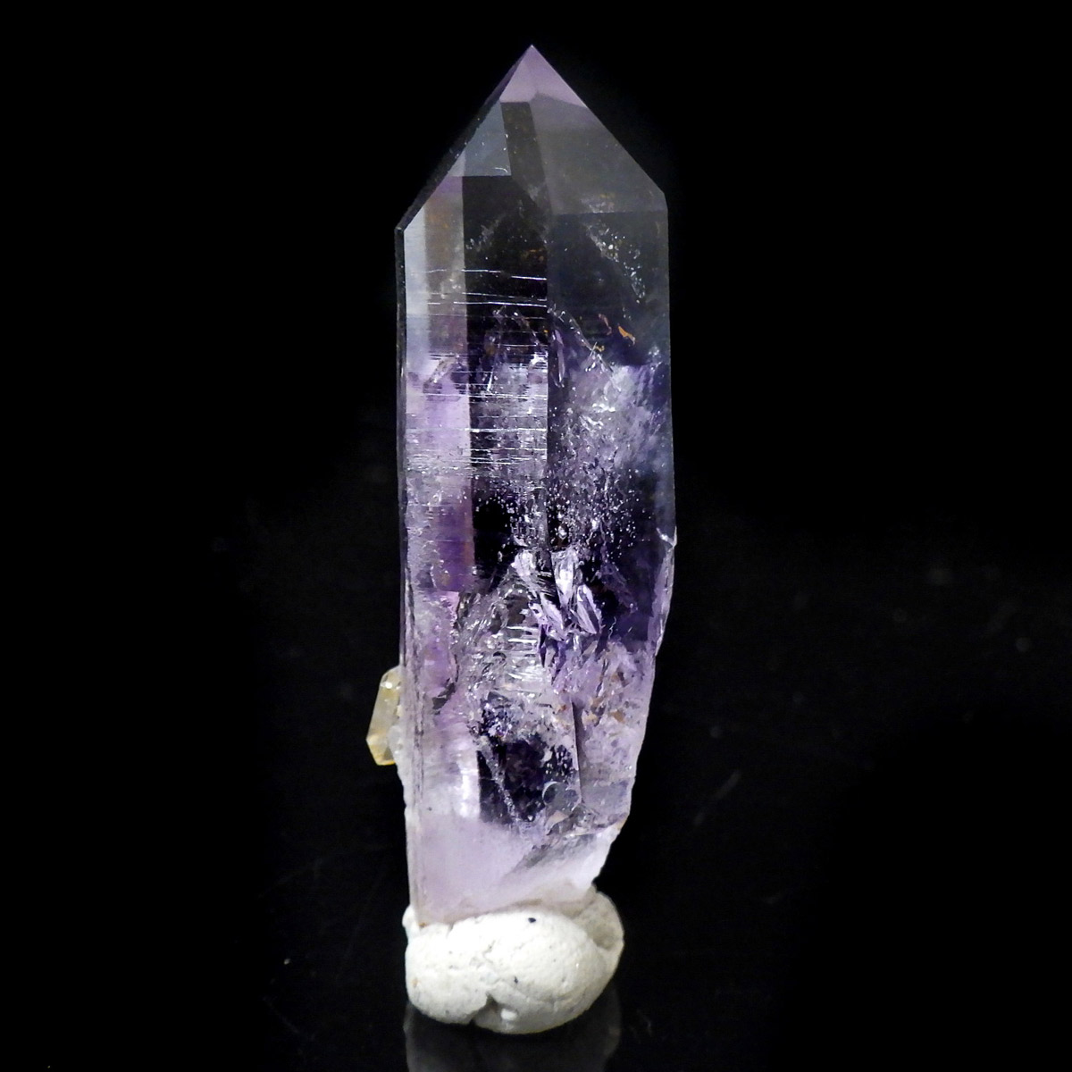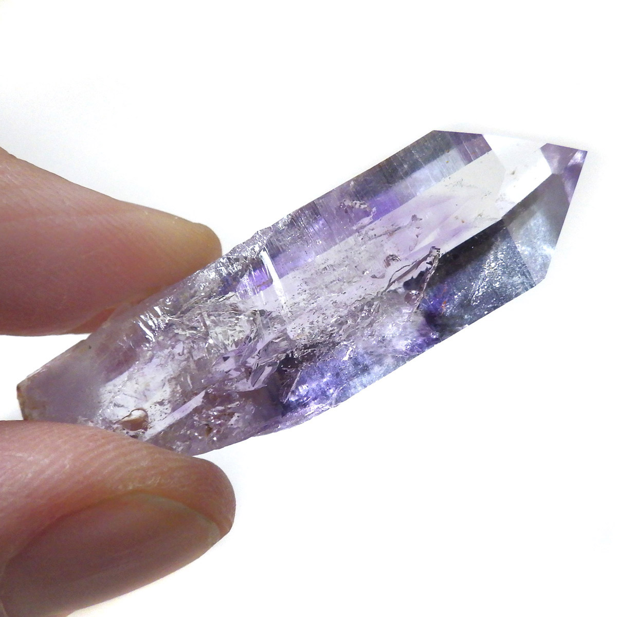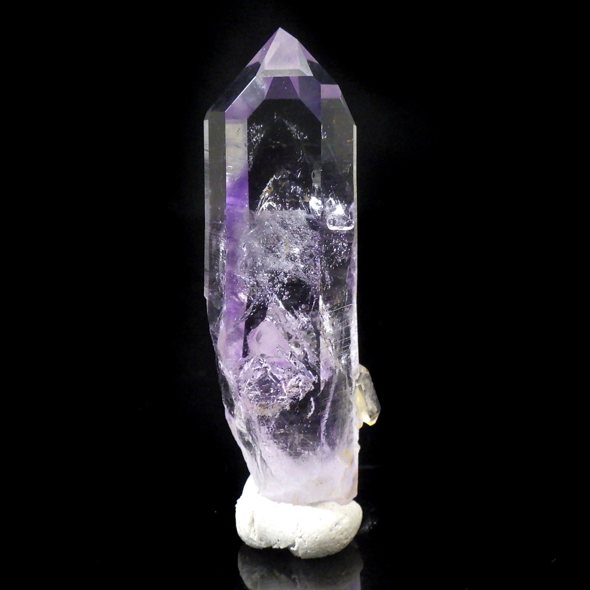 有名なナミビアのブランドバークから少し離れたところの新たな採掘場であるゴボボセブ産のアメジストのポイントです。ブランドバークに負けないくらい、硬くて瑞々しく透明感のあるアメジストがよく産出されます。非常に透明度が高く、ファントム、レインボー、レムリアンなどいろいろな表情を見せてくれるとてもきれいな一点です。 こちらのアメジストポイントには、3か所水が内包されていて気泡が動く様子が確認できました。