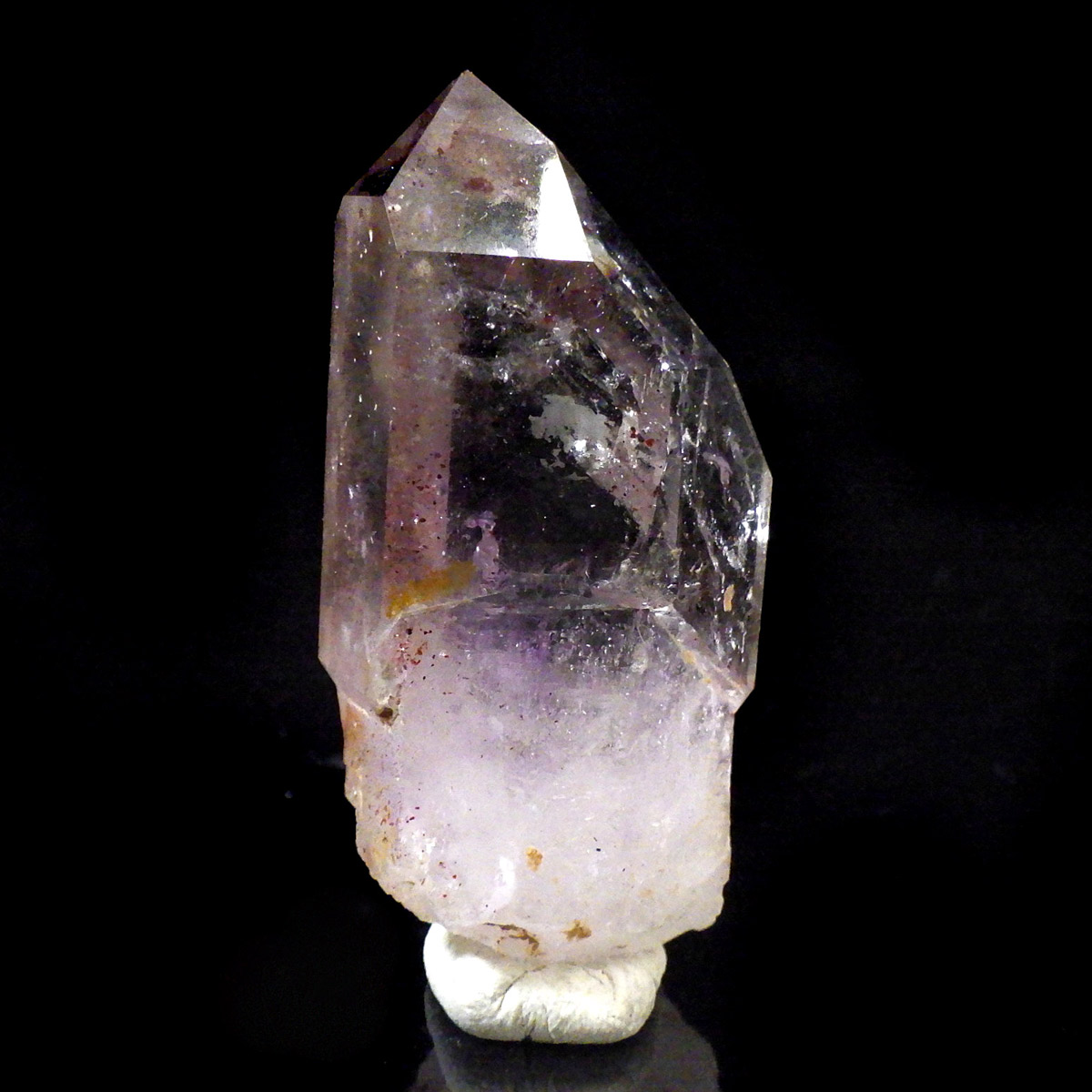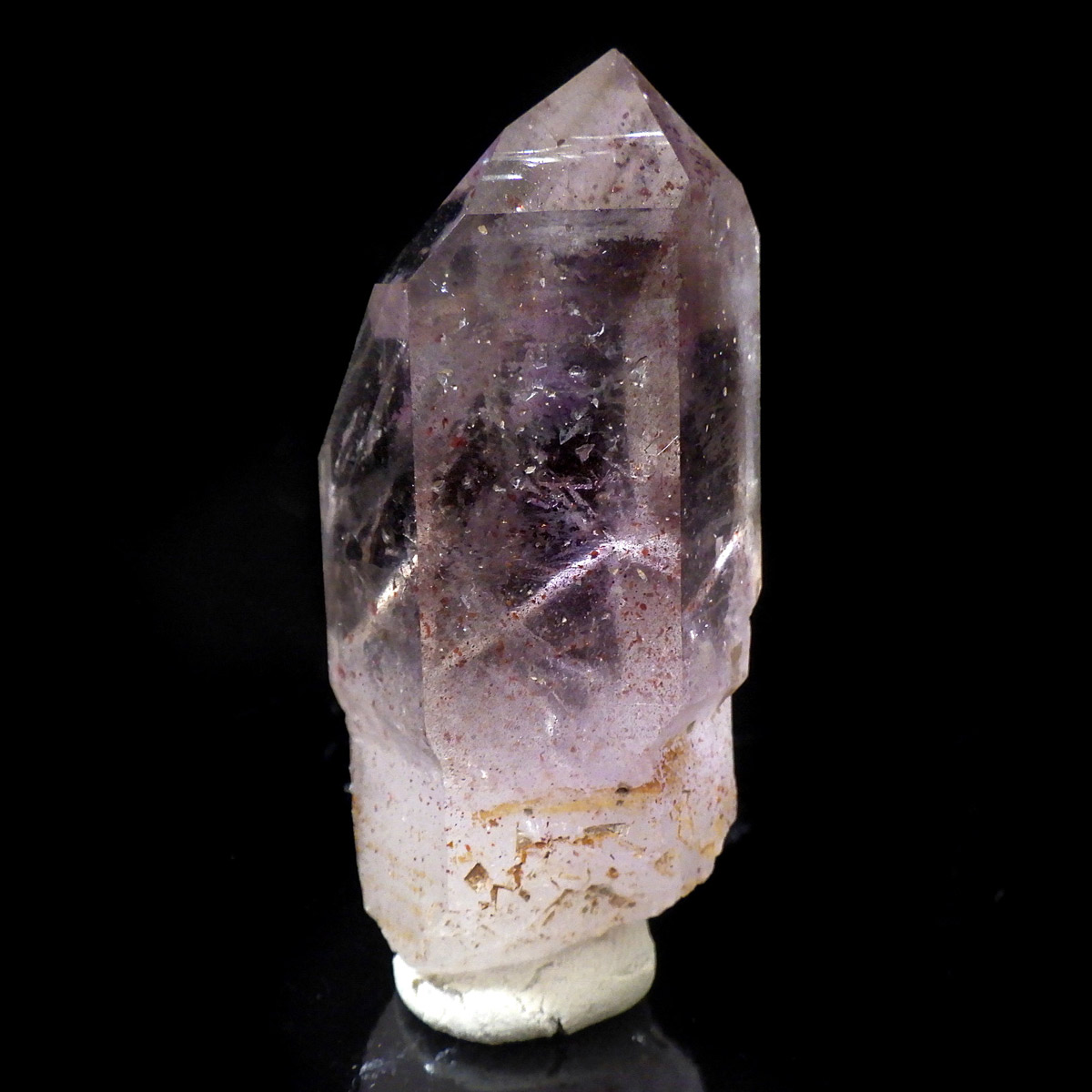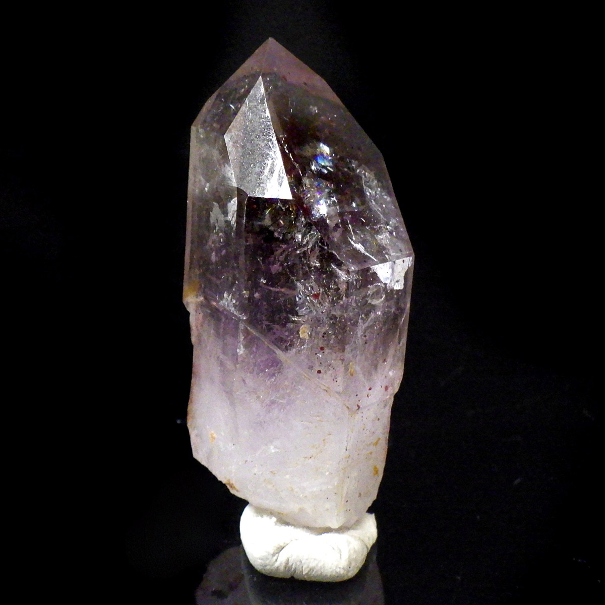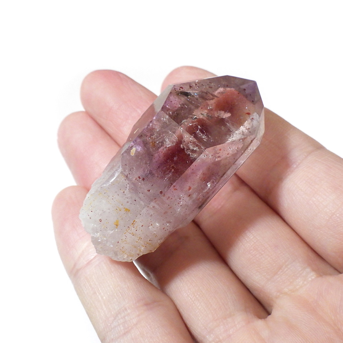 有名なナミビアのブランドバークから少し離れたところの新たな採掘場であるゴボボセブ産のアメジストのポイントです。ブランドバークに負けないくらい、硬くて瑞々しく透明感のあるアメジストがよく産出されます。非常に透明度が高く、ファントム、レインボー、レムリアンなどいろいろな表情を見せてくれるとてもきれいな一点です。
