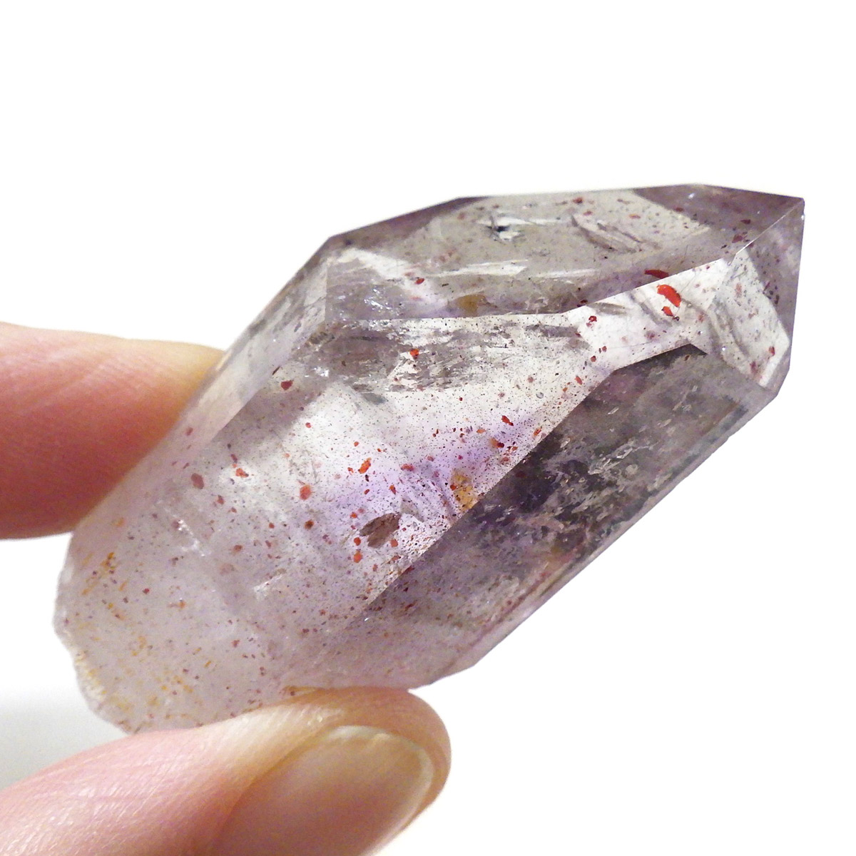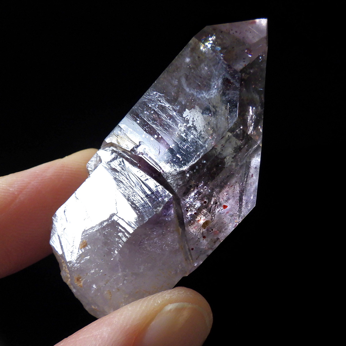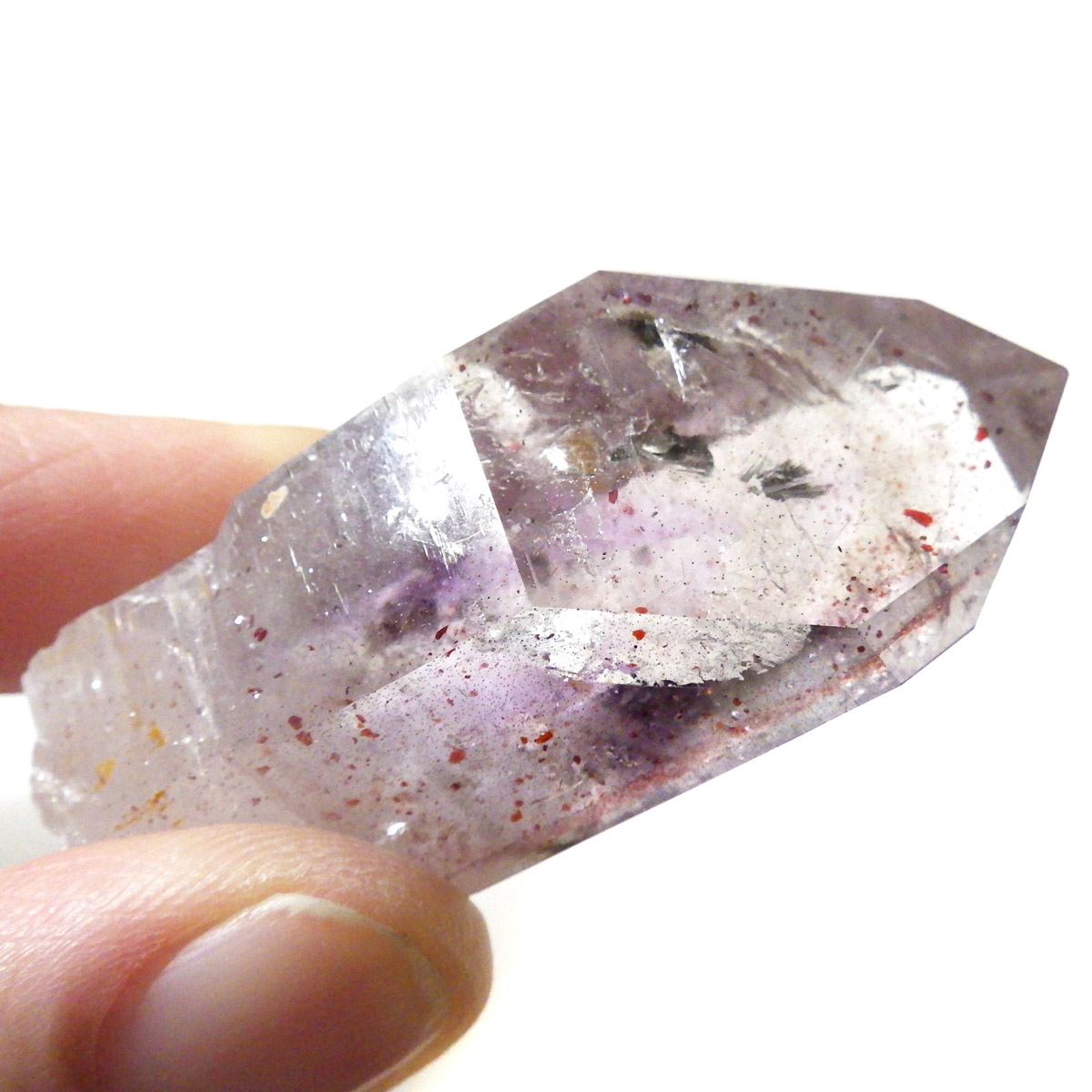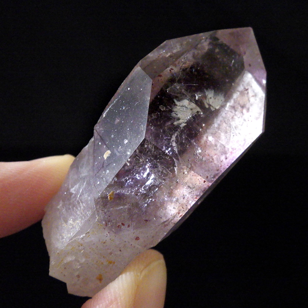 有名なナミビアのブランドバークから少し離れたところの新たな採掘場であるゴボボセブ産のアメジストのポイントです。ブランドバークに負けないくらい、硬くて瑞々しく透明感のあるアメジストがよく産出されます。非常に透明度が高く、ファントム、レインボー、レムリアンなどいろいろな表情を見せてくれるとてもきれいな一点です。