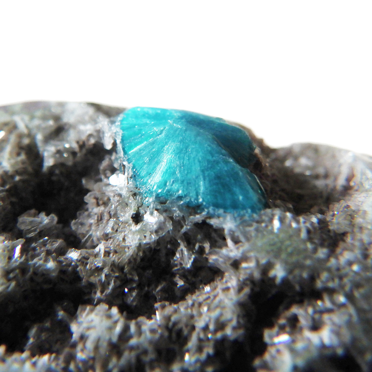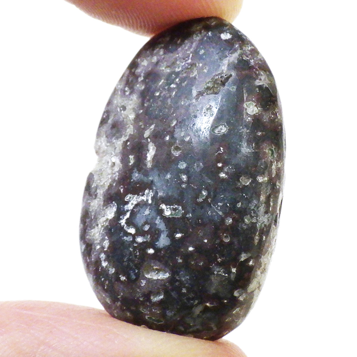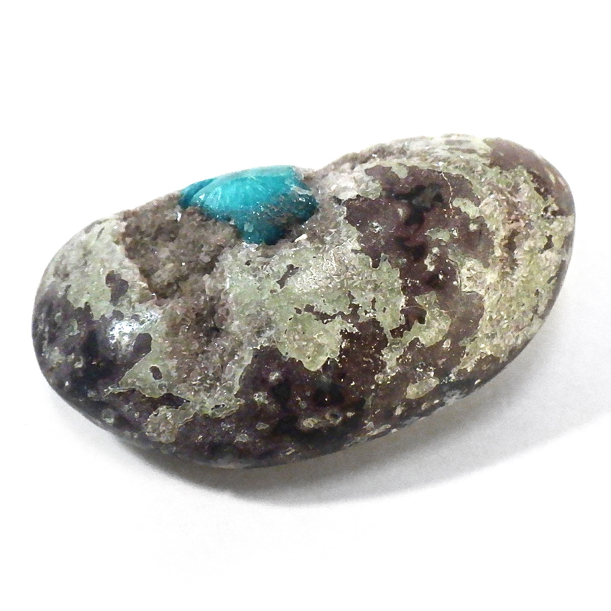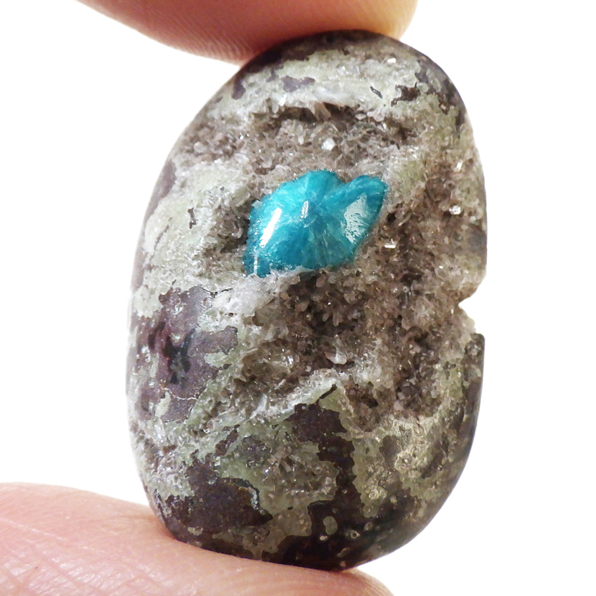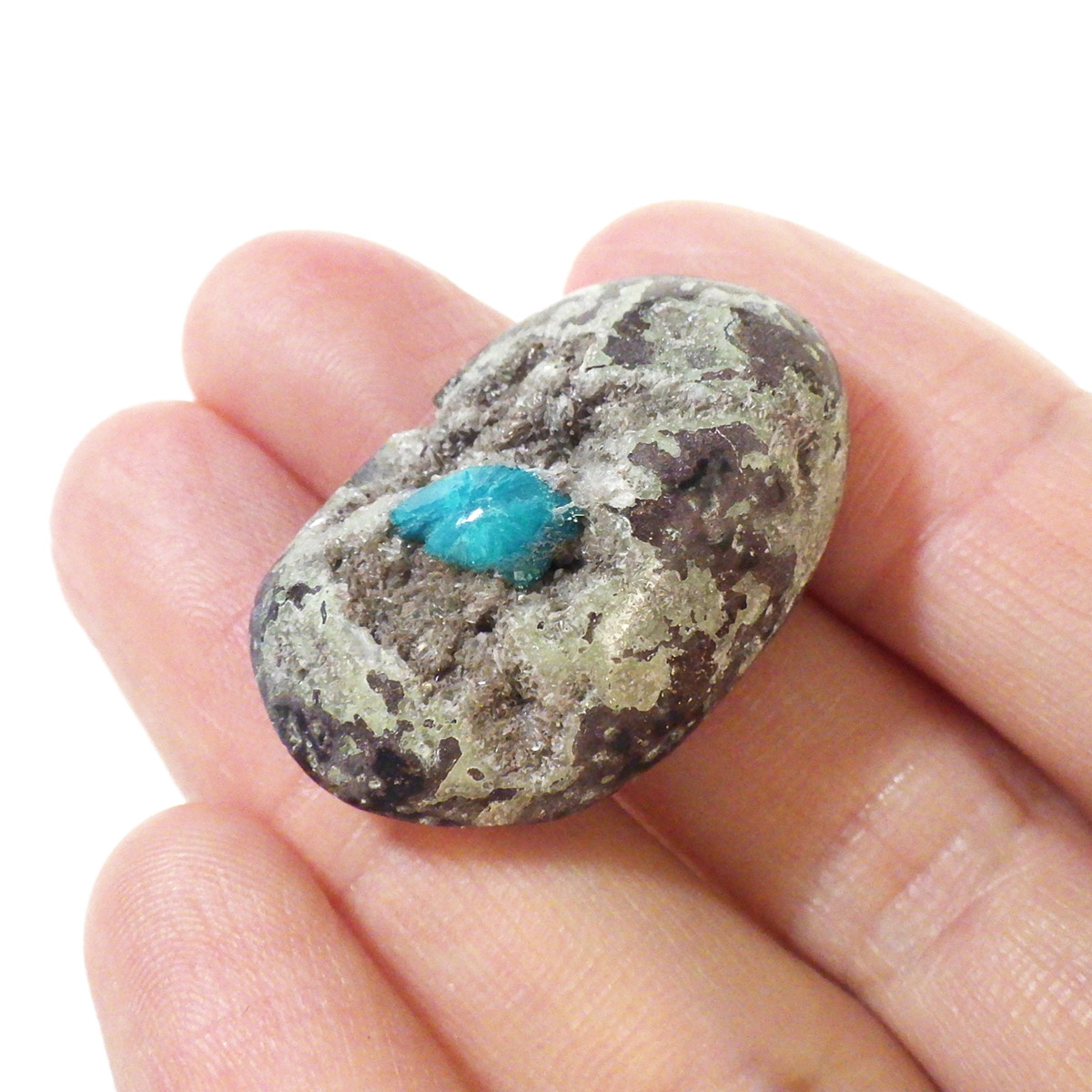 インド産のカバンサイト、タンブルです。 カバンサイトは、沸石の中でも人気を誇る、美しいビビッドな青い発色が魅力です。主成分の、「カルシウム」「バナジウム」「シリコン」の3つの頭文字をつなげて「カバンサイト」と付けられたのが名前の由来です。 1973年にアメリカで発見された、まだ歴史の浅い石で、発見されたのはアメリカですが、現在ではまずアメリカでは採れず、インドで採掘が続けられています。 本来 カバンサイトは、沸石に属し、モース硬度が低い上に、ボンボリ状の形状から加工には不向きなミネラルとして知られています。そのため、ルースやタンブルに加工することは非常に難しいのですが、今回ご用意した商品は、母岩共々加工する事で、ようやくタンブルとしてご案内できる超レアなものとなります。