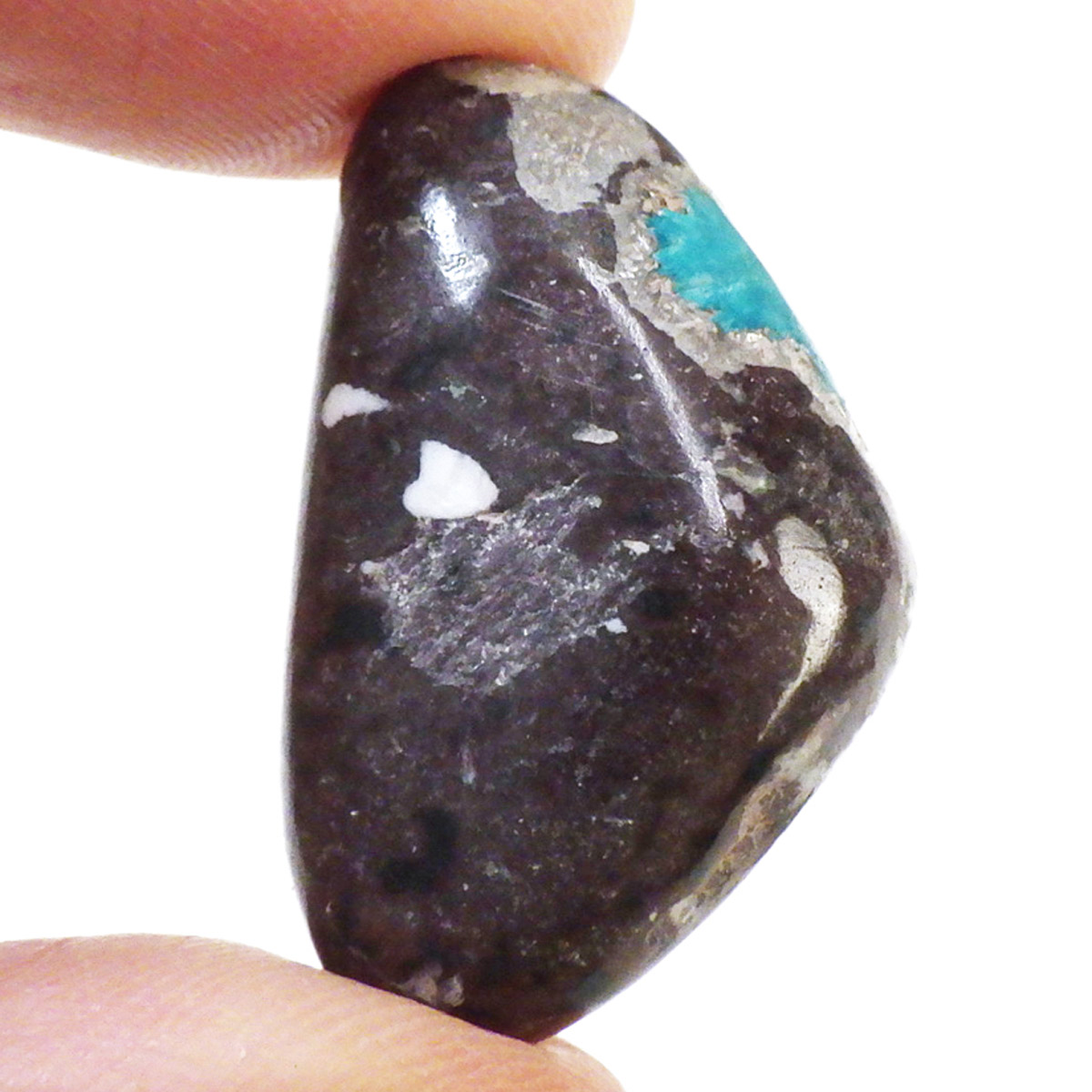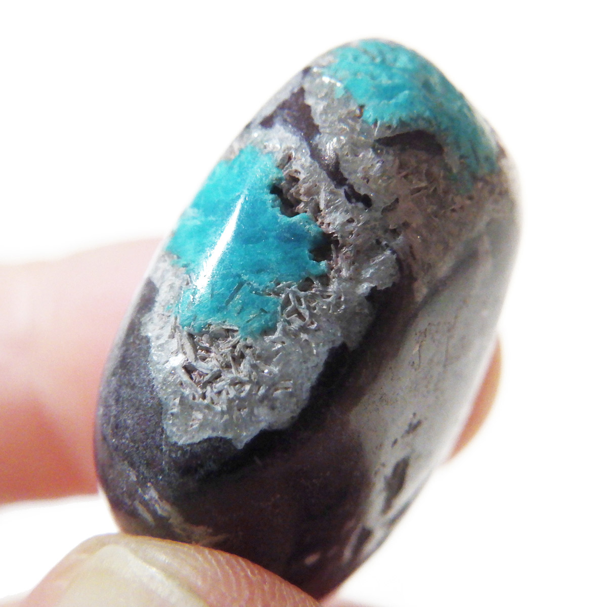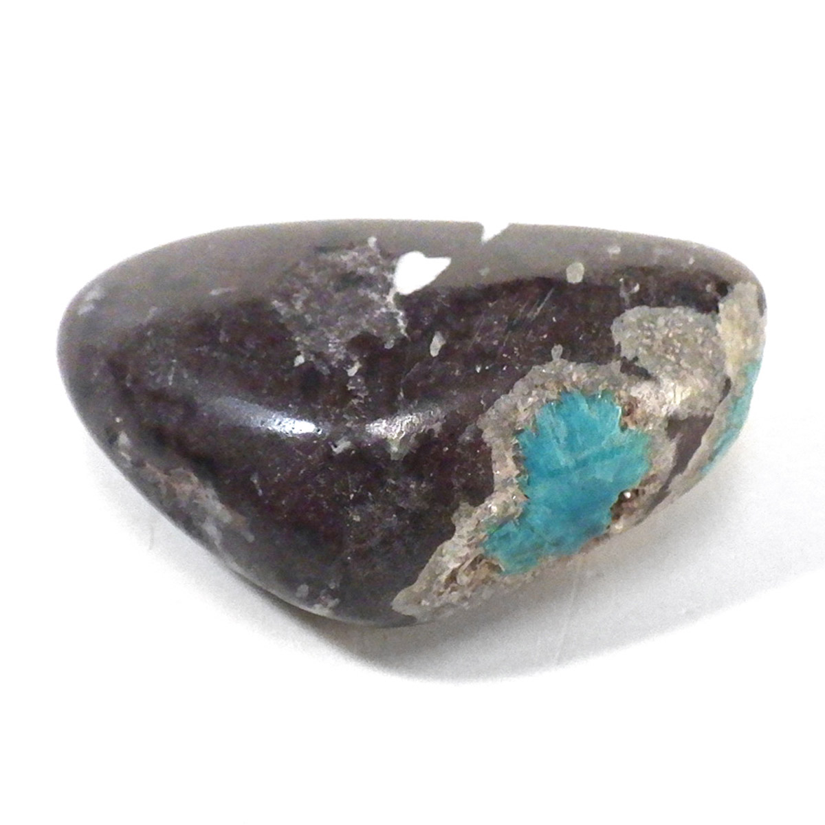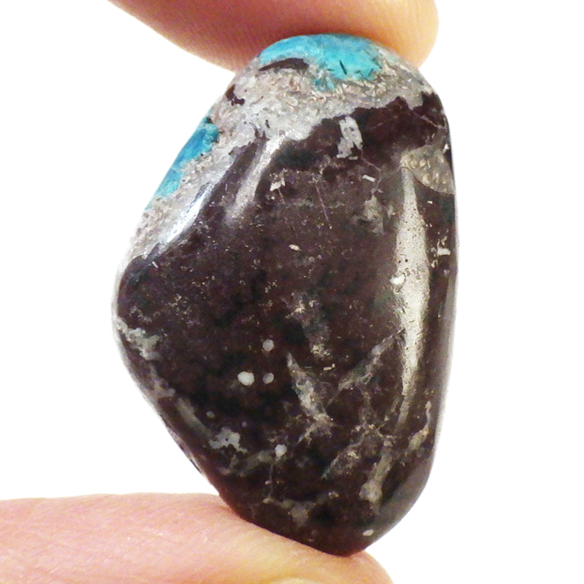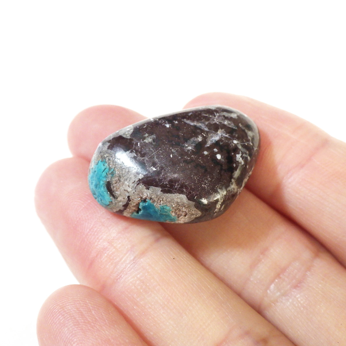 インド産のカバンサイト、タンブルです。 カバンサイトは、沸石の中でも人気を誇る、美しいビビッドな青い発色が魅力です。主成分の、「カルシウム」「バナジウム」「シリコン」の3つの頭文字をつなげて「カバンサイト」と付けられたのが名前の由来です。 1973年にアメリカで発見された、まだ歴史の浅い石で、発見されたのはアメリカですが、現在ではまずアメリカでは採れず、インドで採掘が続けられています。 本来 カバンサイトは、沸石に属し、モース硬度が低い上に、ボンボリ状の形状から加工には不向きなミネラルとして知られています。そのため、ルースやタンブルに加工することは非常に難しいのですが、今回ご用意した商品は、母岩共々加工する事で、ようやくタンブルとしてご案内できる超レアなものとなります。