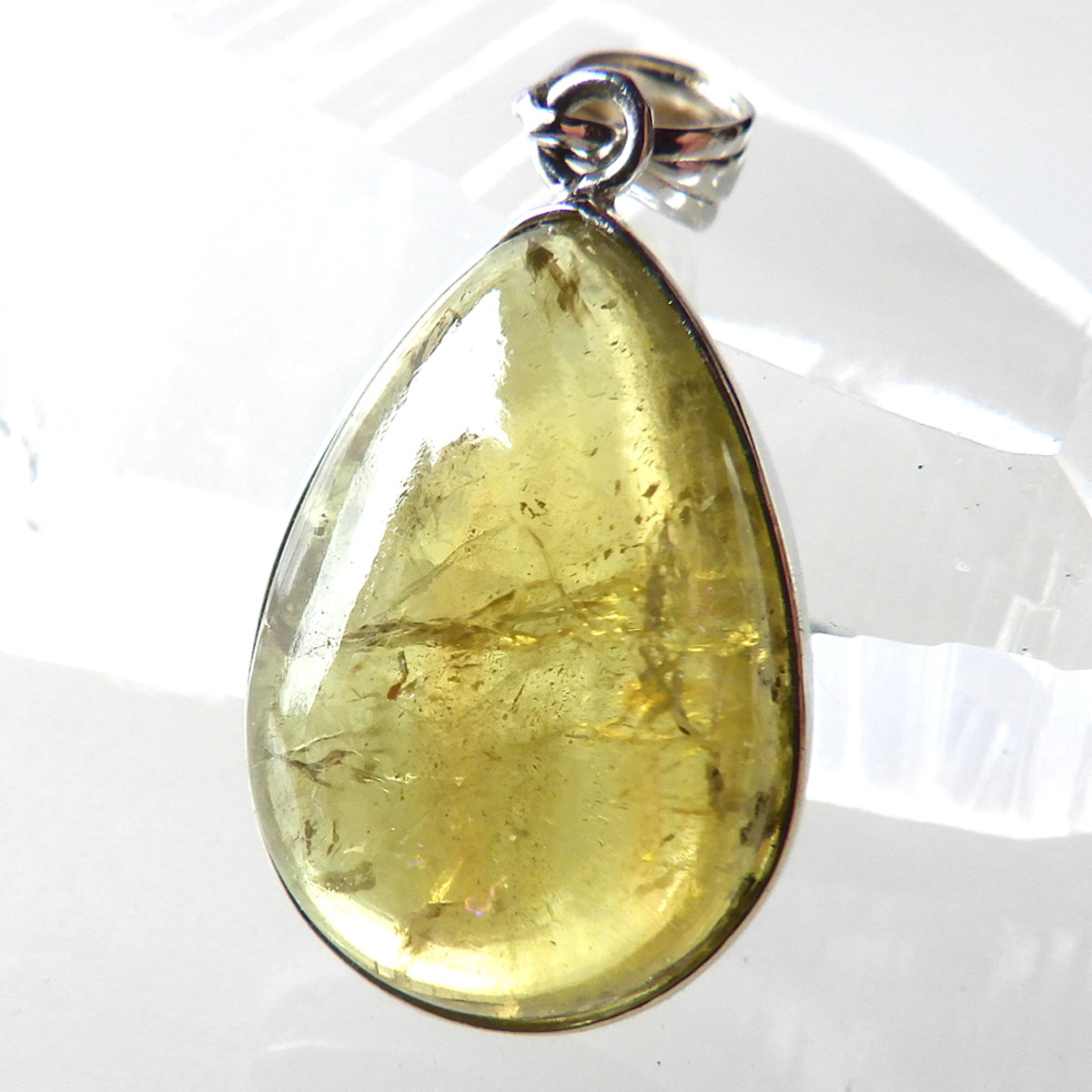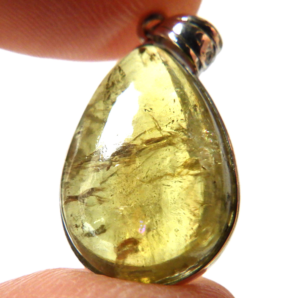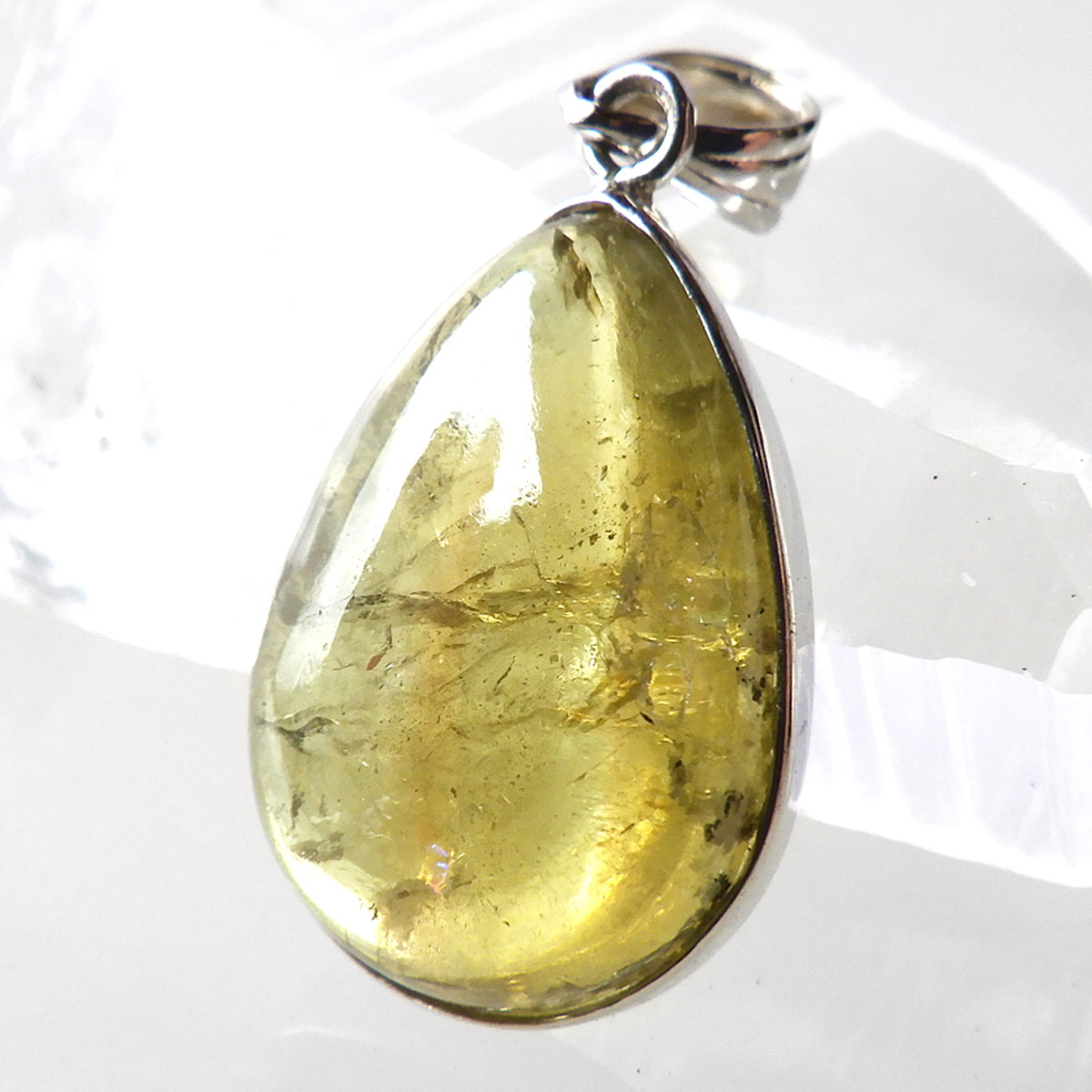 メキシコ産、イエローアパタイトのしずく型ペンダントトップです。 ペンダントトップに加工できるほどのサイズは大変貴重です。 結晶は透明でしっかりとしたイエローカラー、角度によってレインボーがキラりと輝きます。インクルージョンが少々ありますがそれも天然の証、発色・透明度は高いイエローアパタイトを使用しております。インクルージョンがある分、光の反射で内部がキラキラと輝き天然石ならではの美しい姿を見せてくれます。