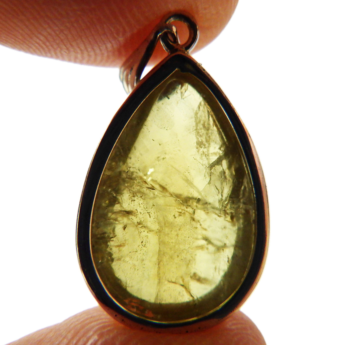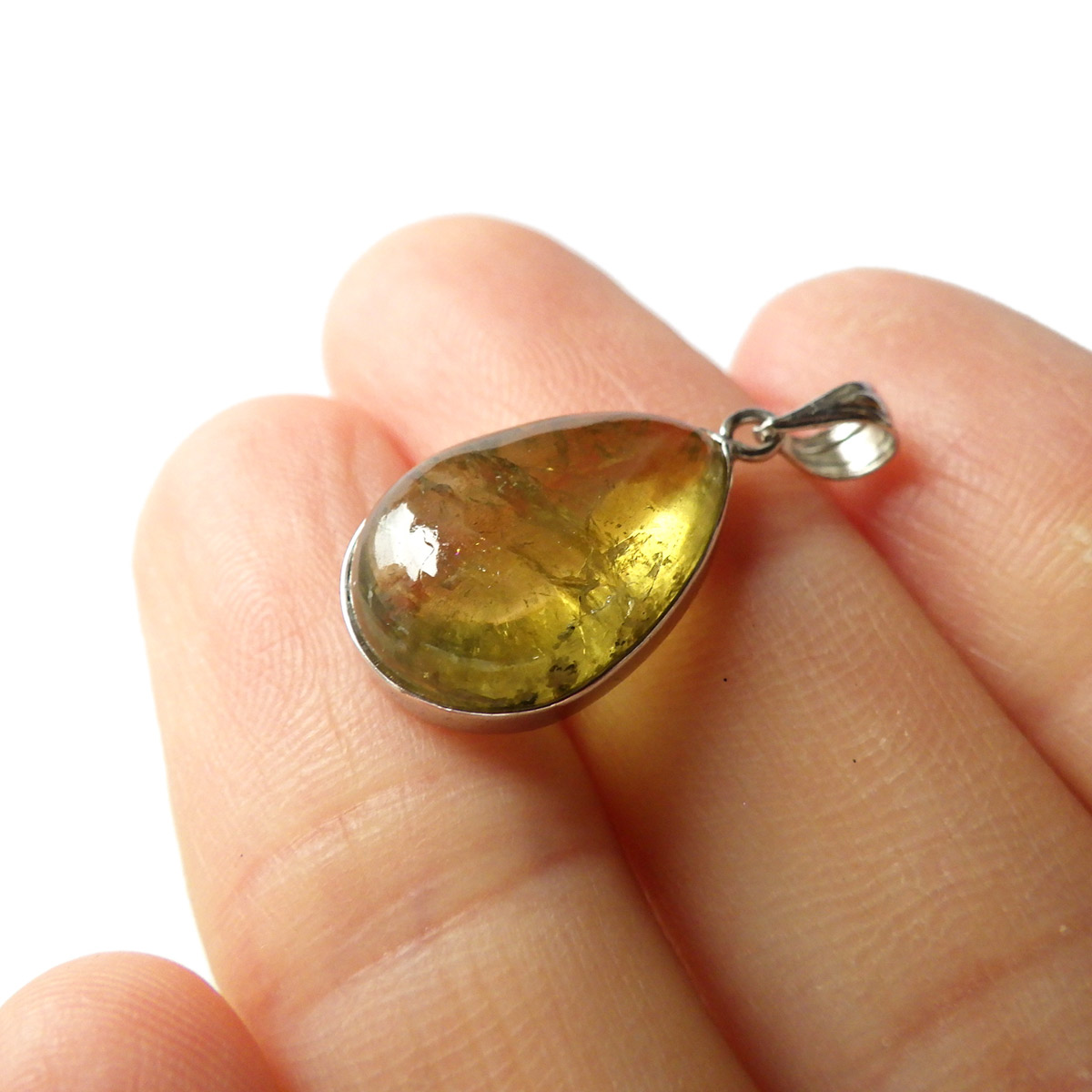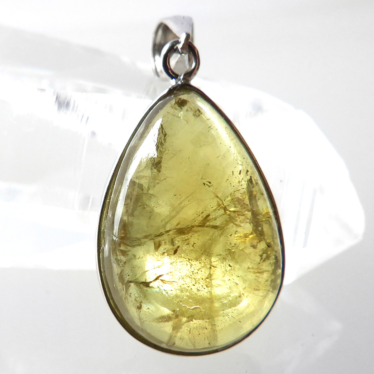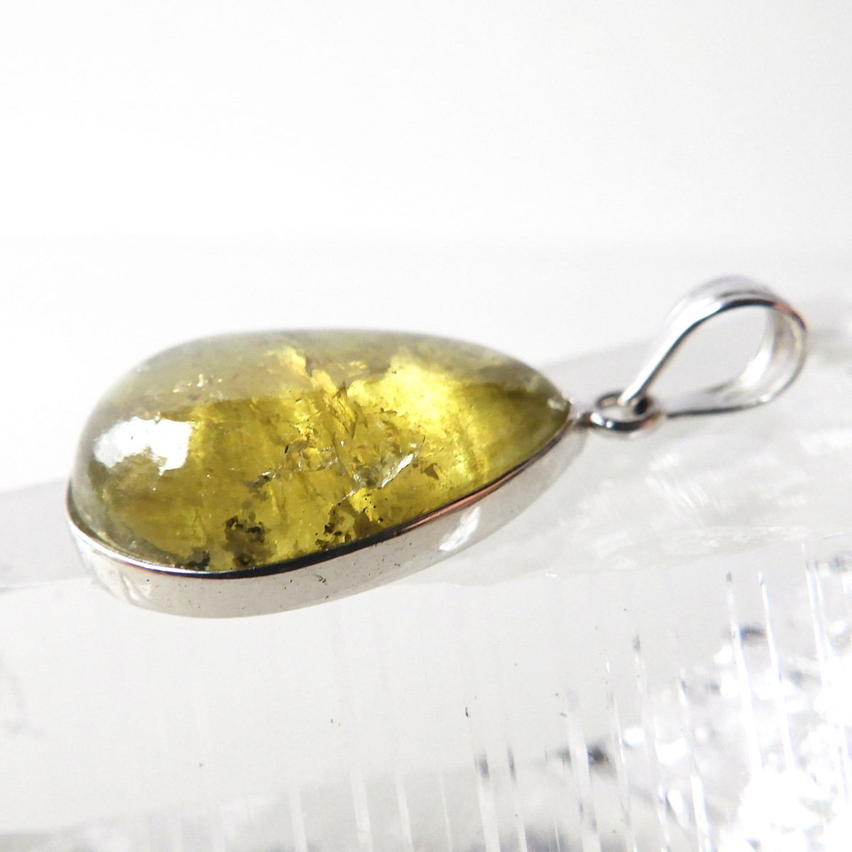 メキシコ産、イエローアパタイトのしずく型ペンダントトップです。 ペンダントトップに加工できるほどのサイズは大変貴重です。 結晶は透明でしっかりとしたイエローカラー、角度によってレインボーがキラりと輝きます。インクルージョンが少々ありますがそれも天然の証、発色・透明度は高いイエローアパタイトを使用しております。インクルージョンがある分、光の反射で内部がキラキラと輝き天然石ならではの美しい姿を見せてくれます。