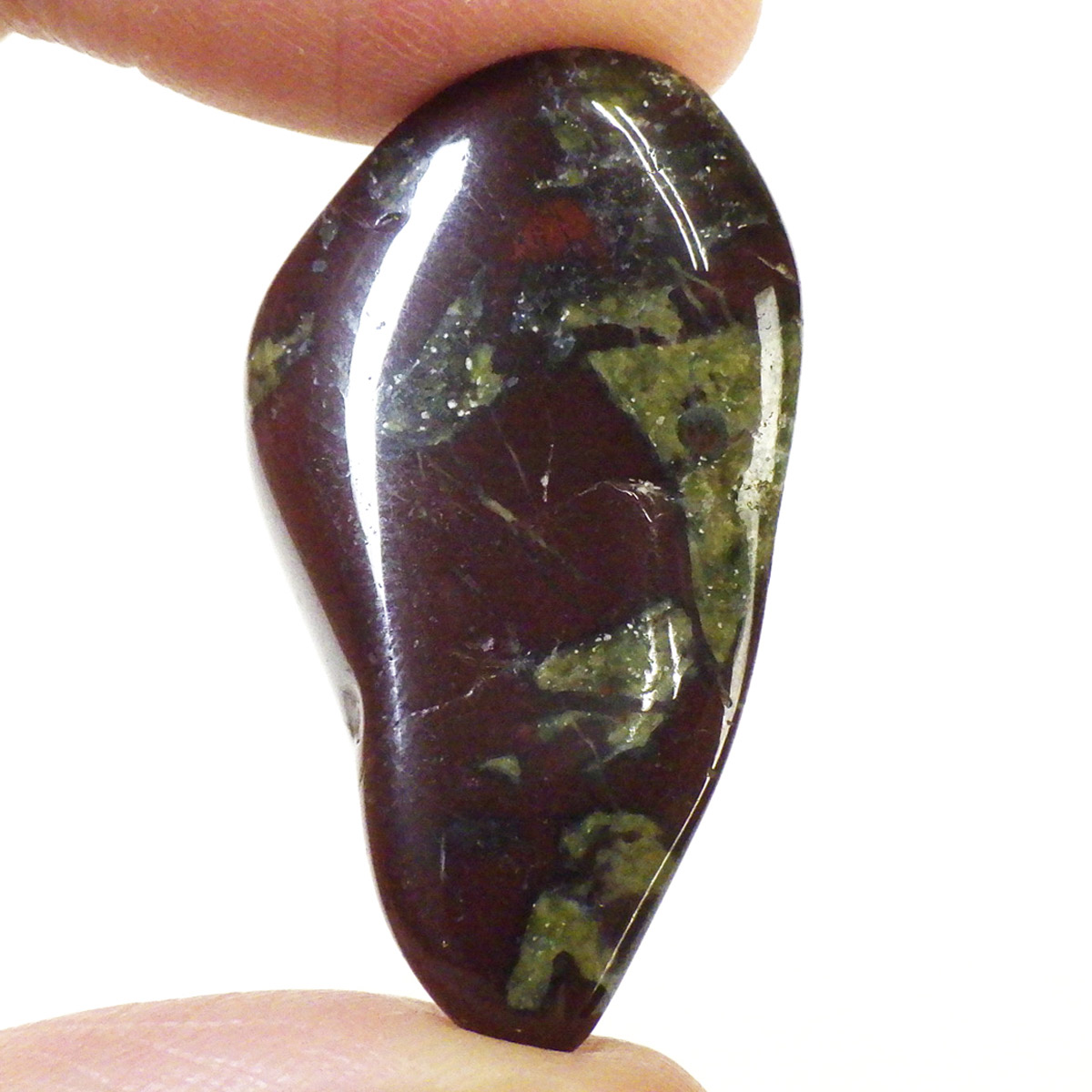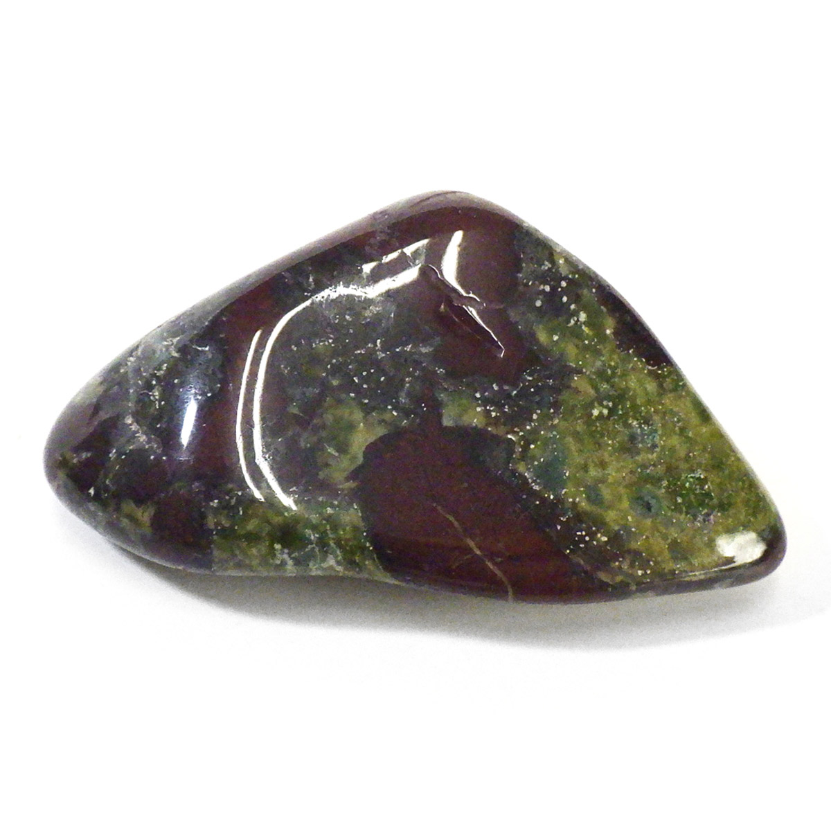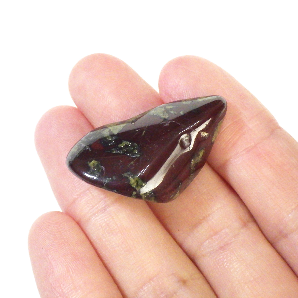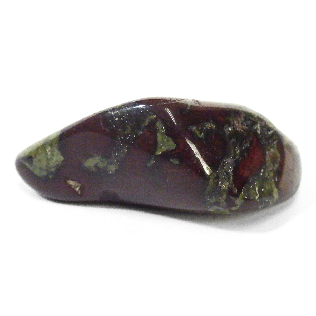 現在では南アフリカまたはオーストラリアで産出される石のようです。ドラゴンストーンまたはドラゴンブラッドジャスパーと呼ばれます。これは、ドラゴンの皮膚を思わせる緑色に、ドラゴンの血をイメージさせる赤い点や筋が入っていることから名付けられています。日本ではあまり文献がないのですが基本はジャスパーだと思われます。こちらは磨いたタンブルですが、原石の状態ですとドラゴン模様の緑の石に本当にドラゴンの血が付いたのではと思わせられます。見た目は綺麗というよりは力強くかっこいい石です。