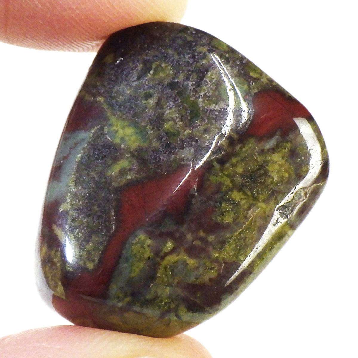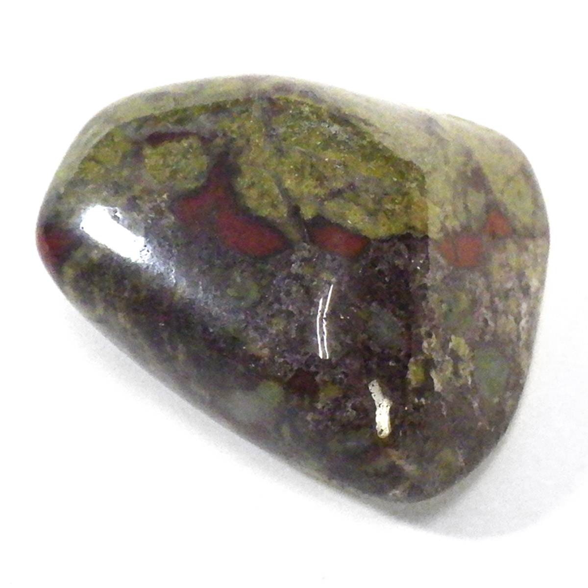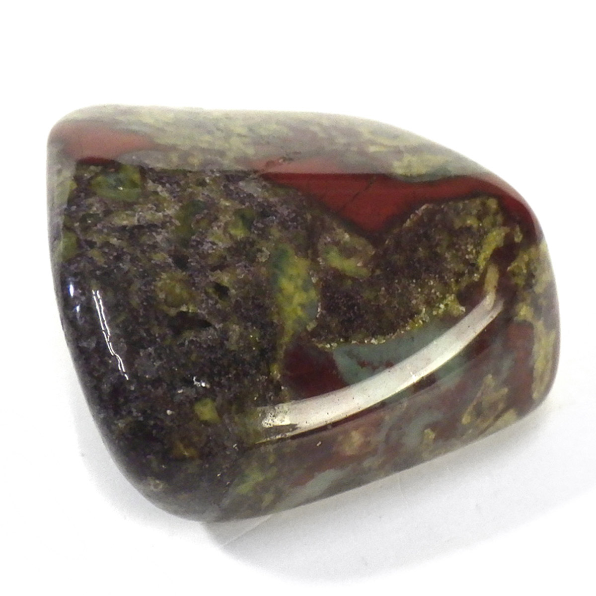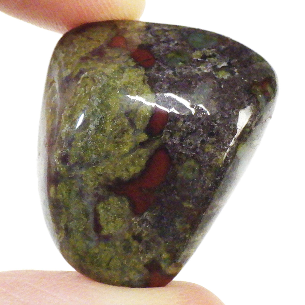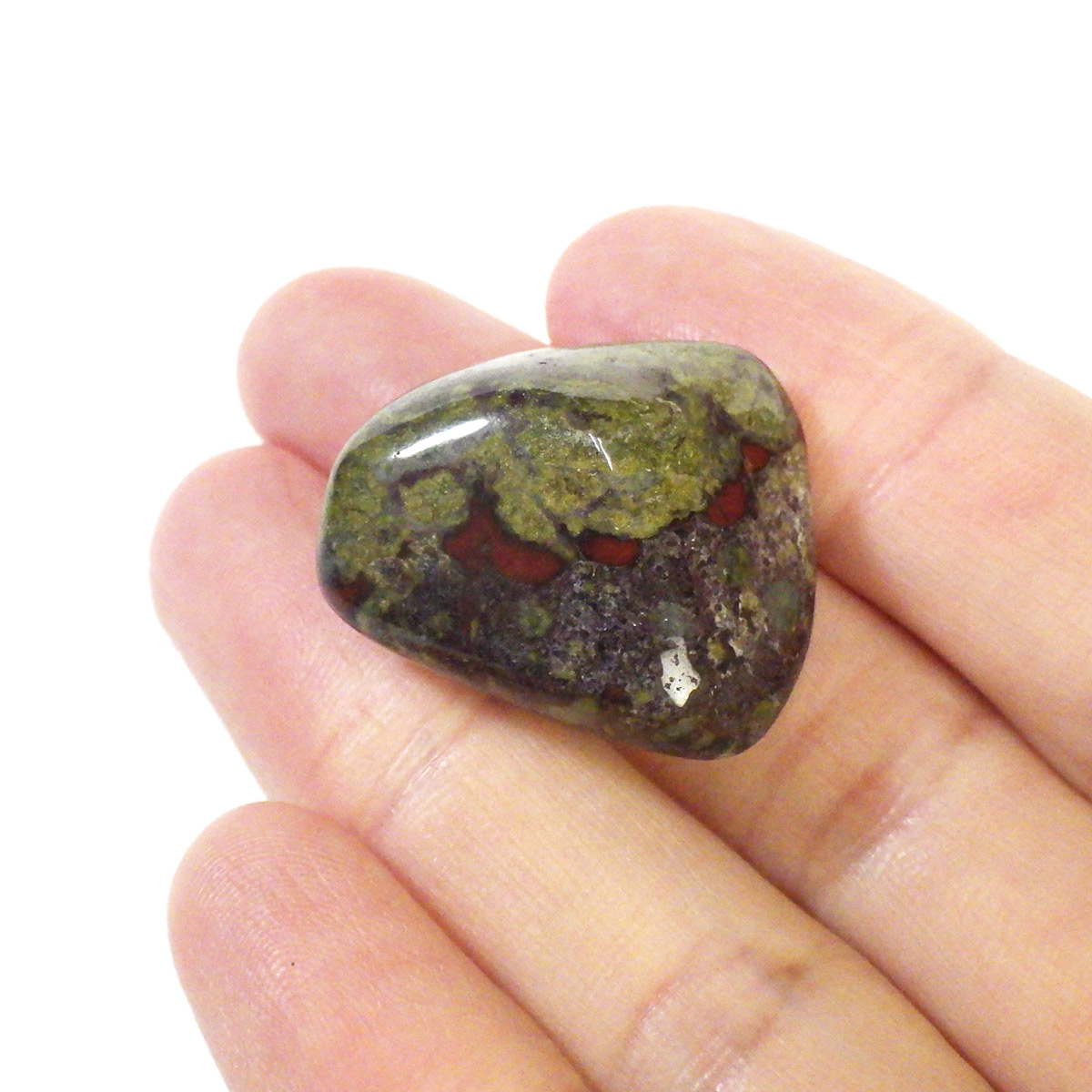 現在では南アフリカまたはオーストラリアで産出される石のようです。ドラゴンストーンまたはドラゴンブラッドジャスパーと呼ばれます。これは、ドラゴンの皮膚を思わせる緑色に、ドラゴンの血をイメージさせる赤い点や筋が入っていることから名付けられています。日本ではあまり文献がないのですが基本はジャスパーだと思われます。こちらは磨いたタンブルですが、原石の状態ですとドラゴン模様の緑の石に本当にドラゴンの血が付いたのではと思わせられます。見た目は綺麗というよりは力強くかっこいい石です。